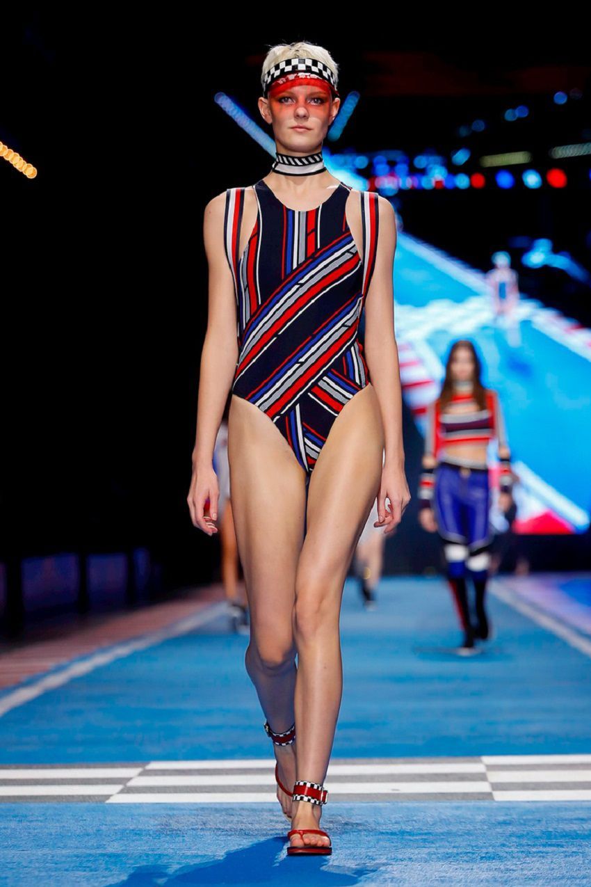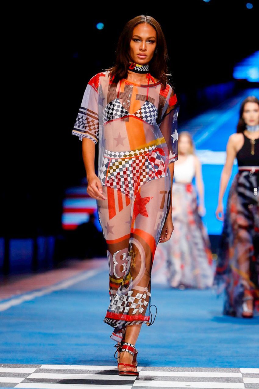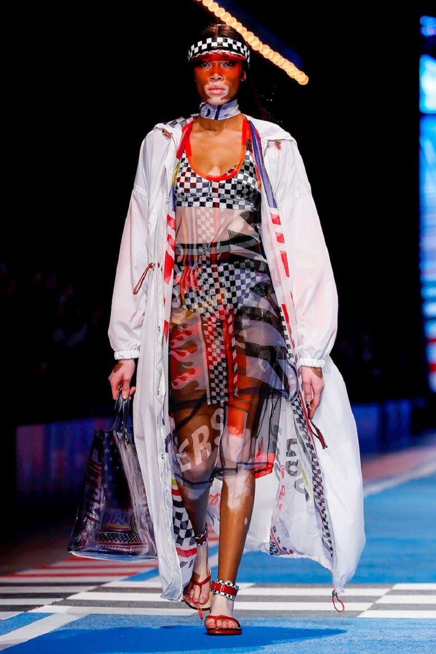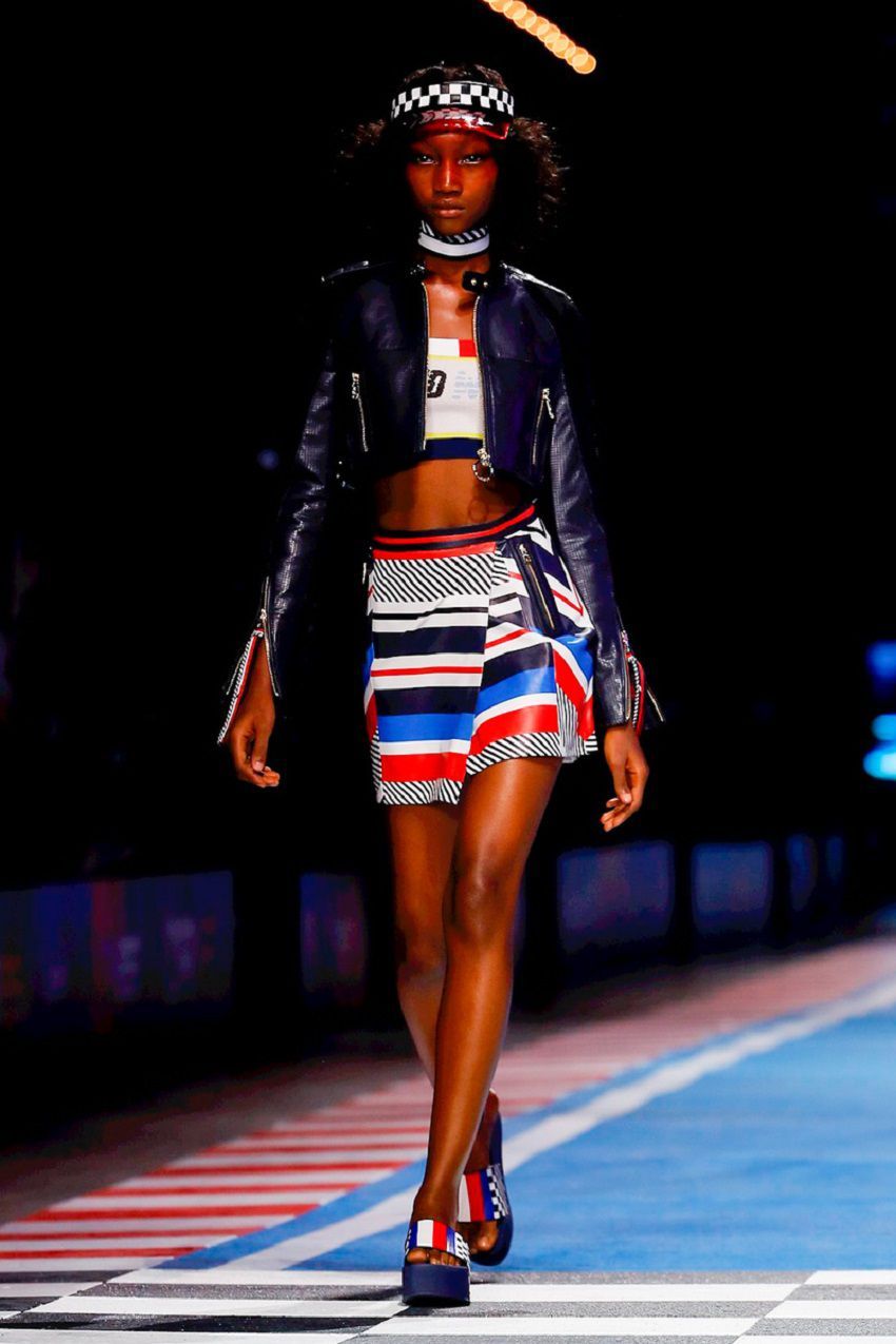 Una successione rapida e scenografica di item sexy e innovativi, una celebrazione del motivo a righe e a scacchi, accompagnato dal desiderio di voler sottolineare le cucitute, metterle in evidenzia quasi con l'intendo di farle sembrare una stampa. Il costante legame con quelli che sono i classici colori di Casa Hilfiger testimonia un mondo che è in corsa, che cambia, ma resta sempre se stesso, nonostante tutto. Il blu, il bianco e il rosso riecheggiano nella collezione SS18 con forza e sottolineati ancor di più dai materiali scelti per i capi: dalla pelle al denim fino a quel gioco di trasparenze favorito dalle gonne indossate dalle sorelle Hadid a fine show.