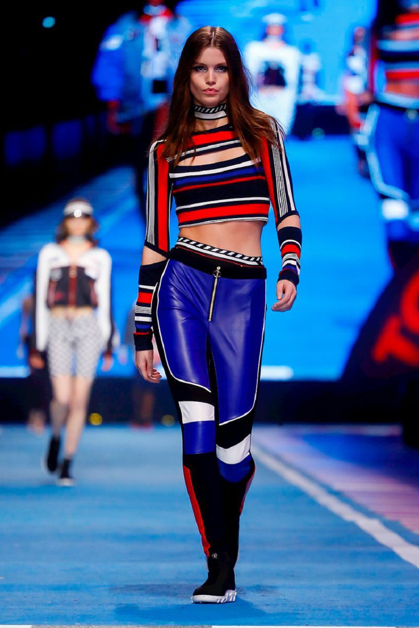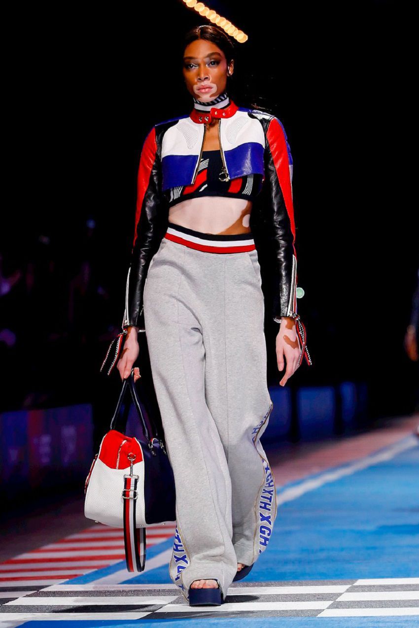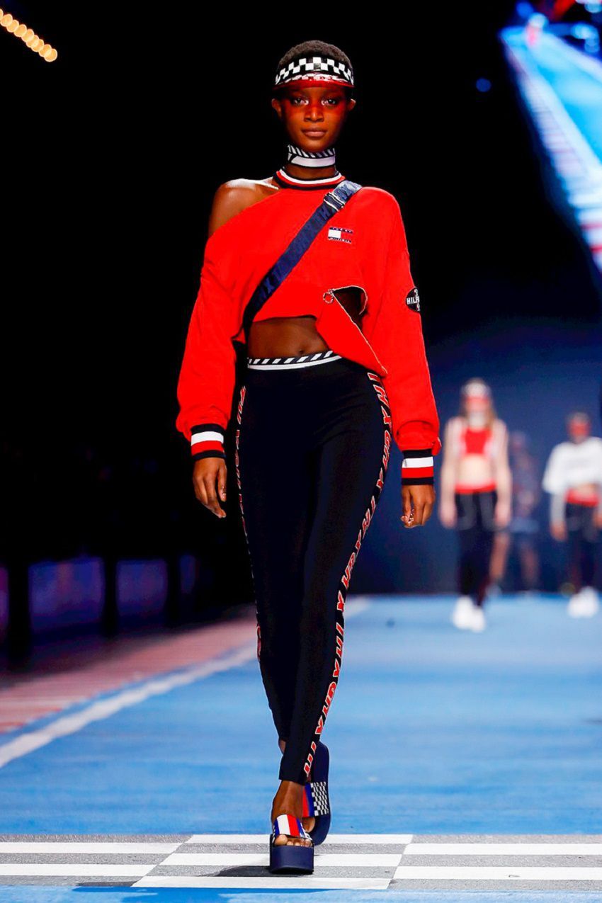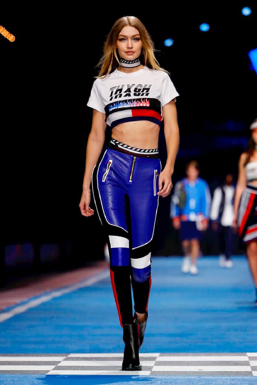 Una successione rapida e scenografica di item sexy e innovativi, una celebrazione del motivo a righe e a scacchi, accompagnato dal desiderio di voler sottolineare le cucitute, metterle in evidenzia quasi con l'intendo di farle sembrare una stampa. Il costante legame con quelli che sono i classici colori di Casa Hilfiger testimonia un mondo che è in corsa, che cambia, ma resta sempre se stesso, nonostante tutto. Il blu, il bianco e il rosso riecheggiano nella collezione SS18 con forza e sottolineati ancor di più dai materiali scelti per i capi: dalla pelle al denim fino a quel gioco di trasparenze favorito dalle gonne indossate dalle sorelle Hadid a fine show.