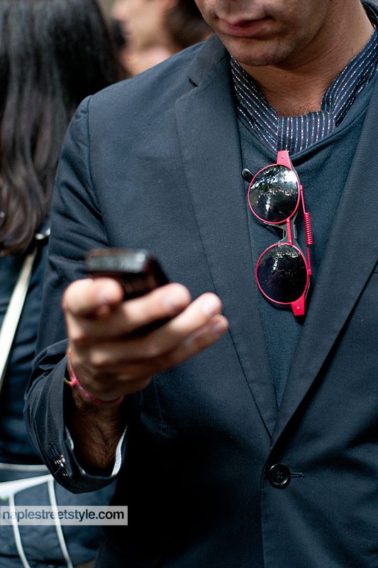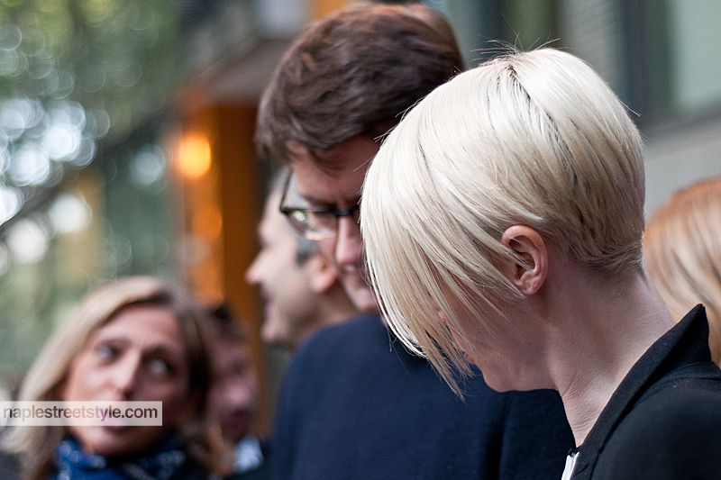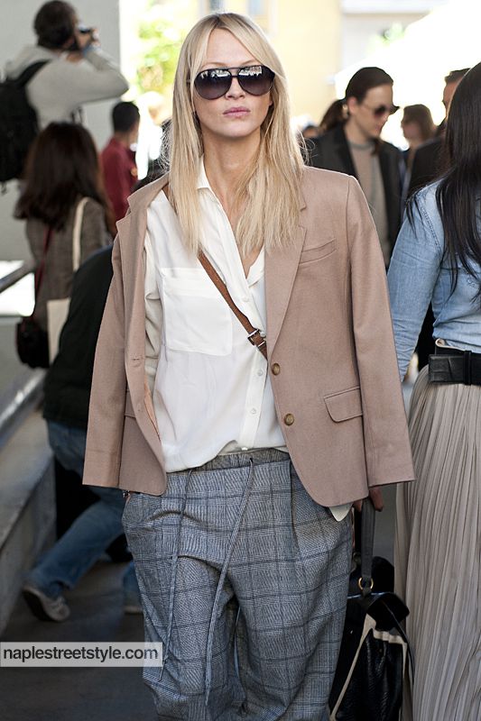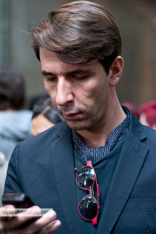 Continuiamo con Giorgio Armani che divide la presentazione della sua colezione in due show: uno per i buyer alle ore 15.00 e uno per la stampa alle ore 16.00. La femme bleue! D’obbligo riprendere il titolo che si staglia sull’invito, chiuso in una busta di organza blu che anticipa il tema della collezione: promessa mantenuta, re Giorgio manda in scena la sua rapsodia in blu, con protagonista la donna tuareg, la compagna degli uomini blu del deserto. Fiera nello sguardo, altera nell’allure e slanciata nella silhouette verticale e affilata che si allarga solo verso il fondo, sfila con minuscole giacche avvitate ma ‘finite’ da una baschina, pantaloni mossi da piccole pince in vita, gonne longuette, miniabiti rigonfi, bluse trasparenti. E tante tuniche, elemento unificatore di un look fatto molto spesso da tre e più pezzi. Blu per il giorno, per il pomeriggio, per la sera. Impossibile sbagliare. Nessun dettaglio sfugge del colore prescelto: i bracciali-polsiera in gros-grain, i gioielli-amuleto, le calzature ultraflat o a rete. Da re Giorgio, come sempre, la coerenza è il pilastro che sorregge la creatività.