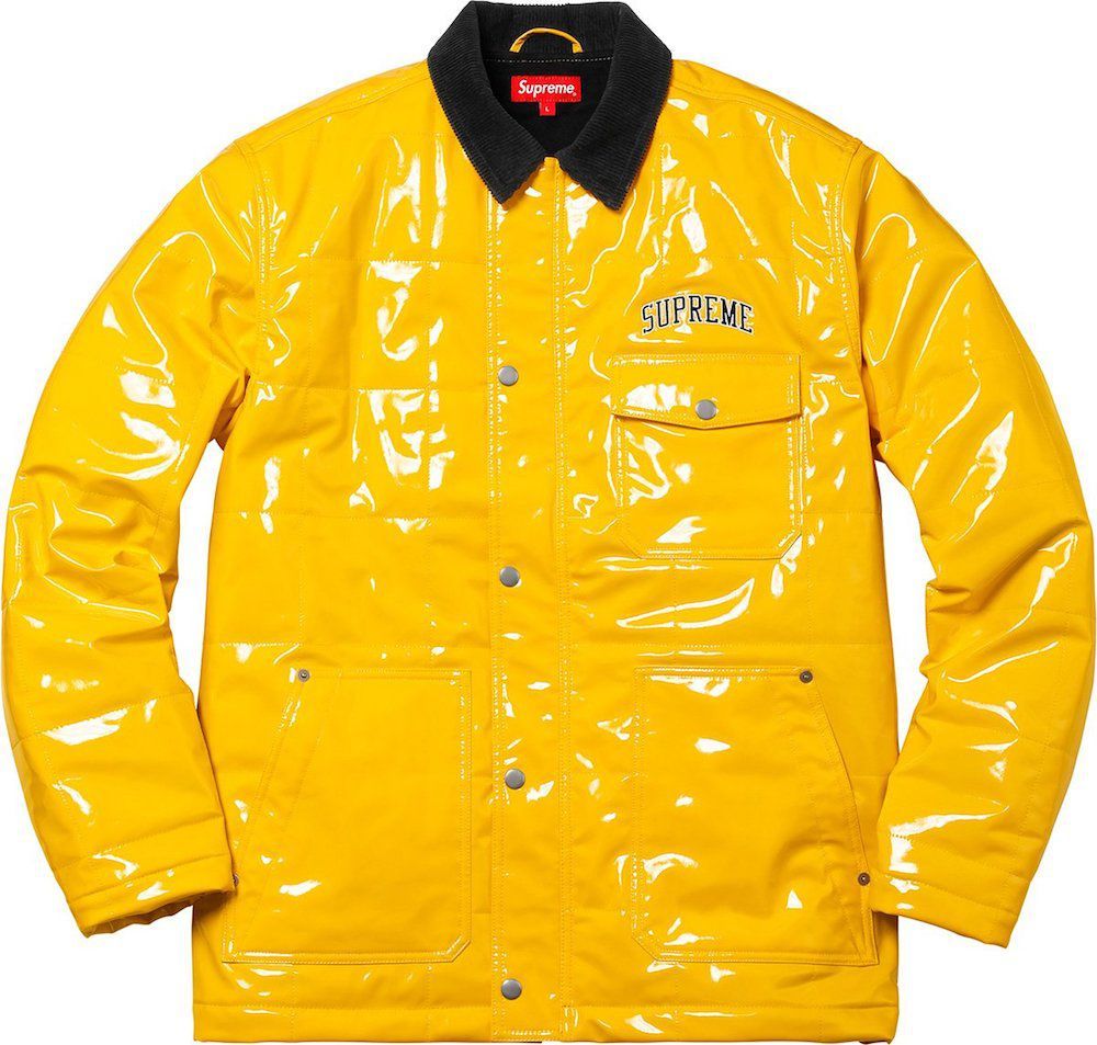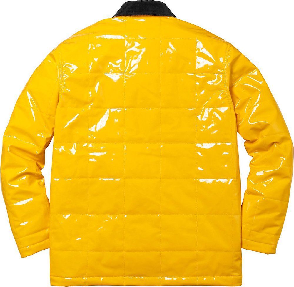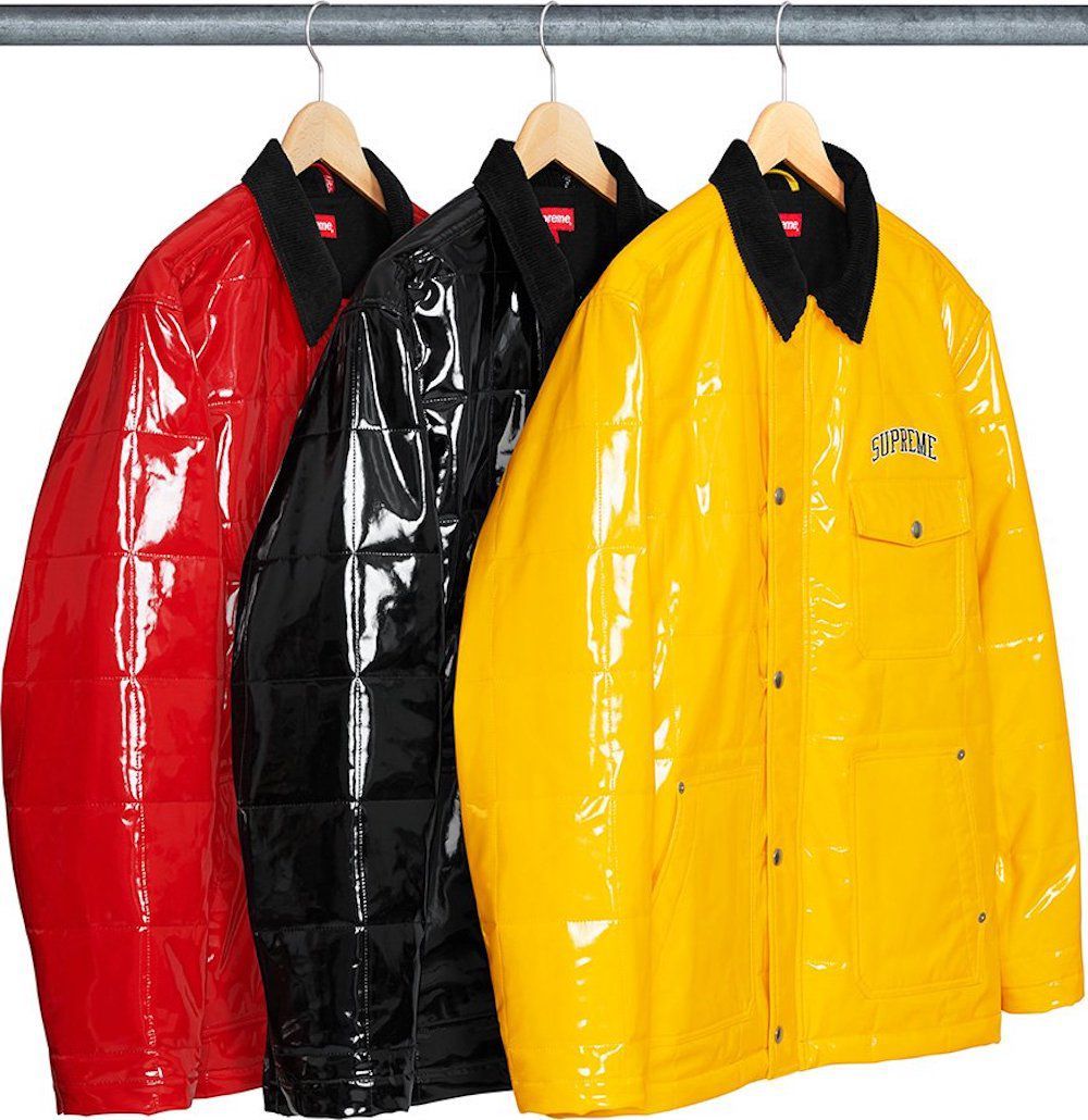 Interessanti sono anche la Quilted Patent Vinyl Work Jacket e la Denim Varsity Jacket con il classico stile Supreme.