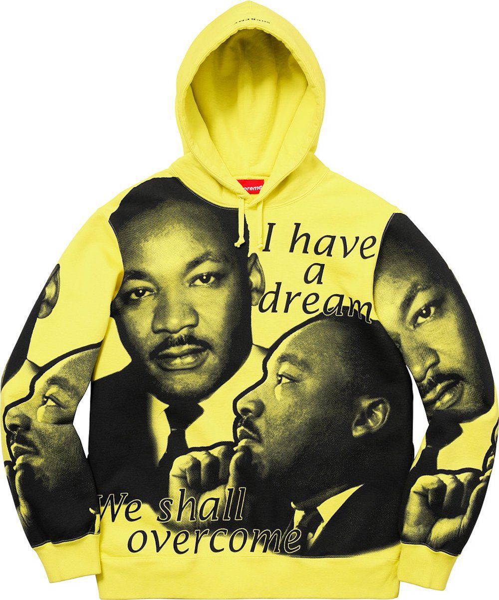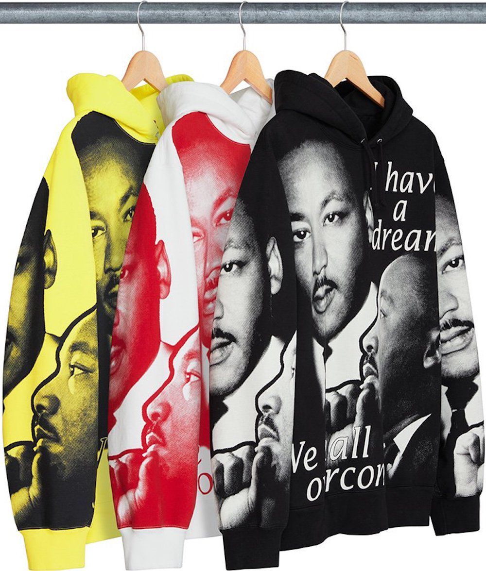 Un altro capo che ha attirato la nostra attenzione è la MLK Hooded Sweatshirt con le stampe del volto di Martin Luther King e caratterizzata dalla sua celebre frase “I Have a Dream”.