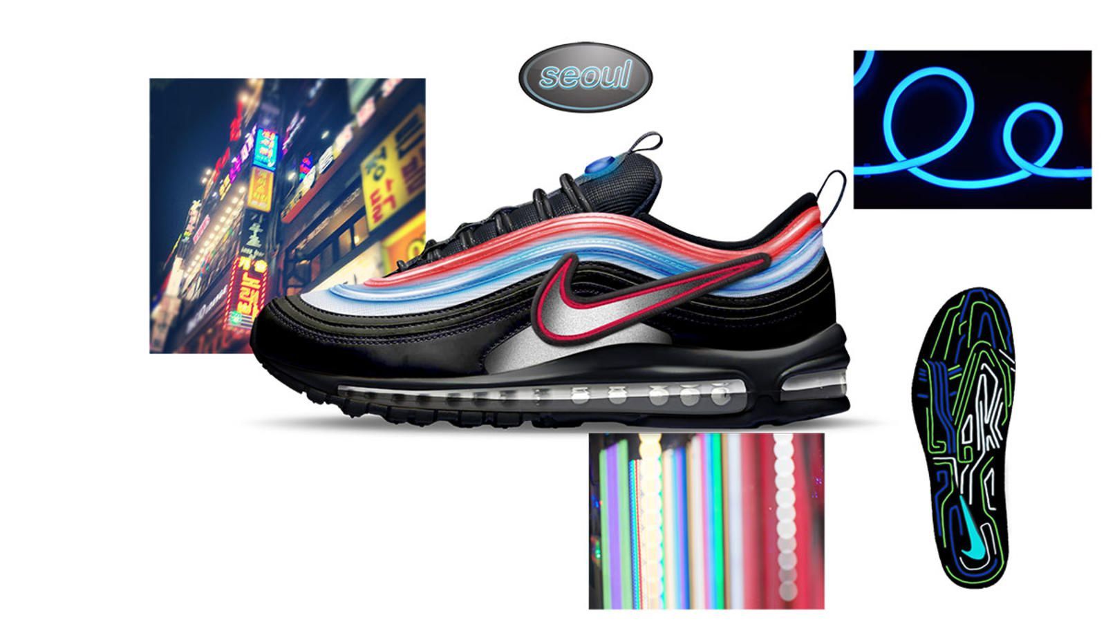 Seoul: la selezione della capitale koreana include una Air Max 98 ispirata dalla metropolitana della città by Joon Oh Park, una Air Max 98 che racconta il contrasto tra nuovo e antico by Binna Kim, ed una Air Max 97 basata sulle luci di Seoul by Gwang Shin.