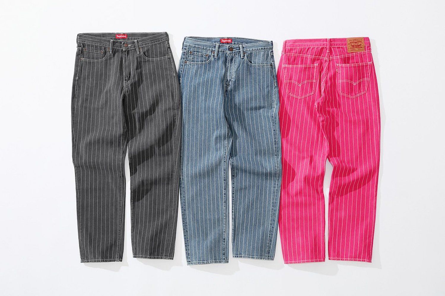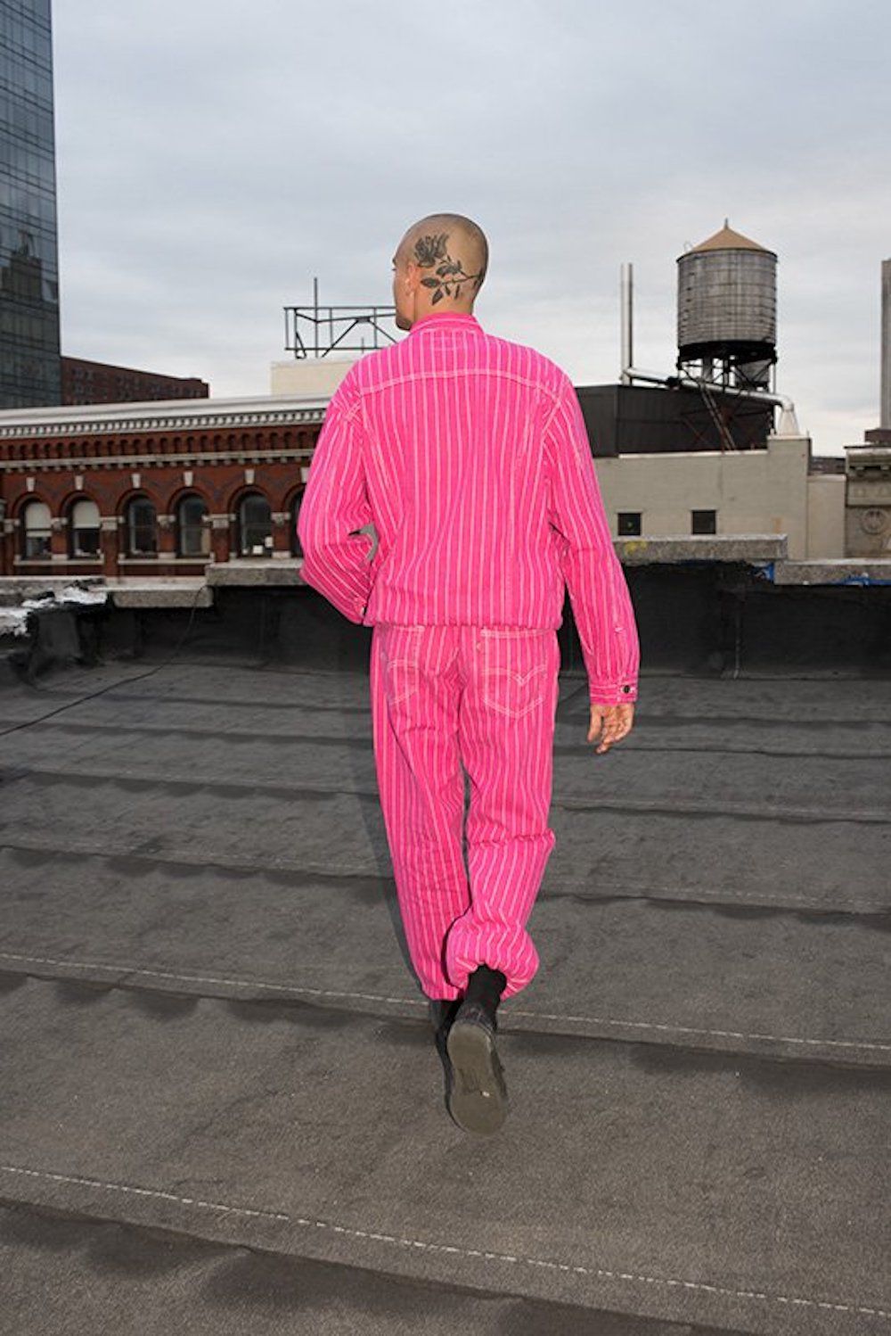 Il denim usato in entrambi gli item è stato trattato per dargli un aspetto usato e slavato su cui vengono dipinte le strisce verticali, e colorato in tre differenti nuances: light blu, coal/nero e vivid pink. Siamo sicuri che l’outfit rosa sarà sicuramente il primo ad andare sold out, ecco ora le foto di tutti i pezzi della collezione Supreme x Levi’s.