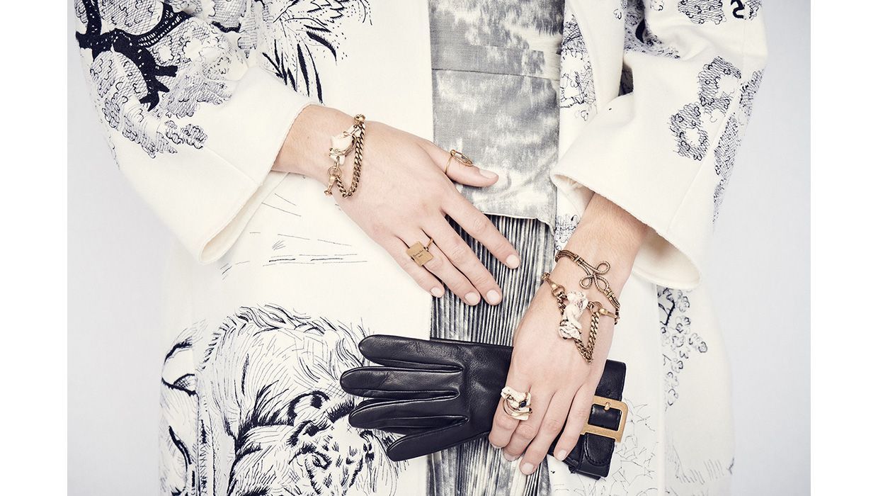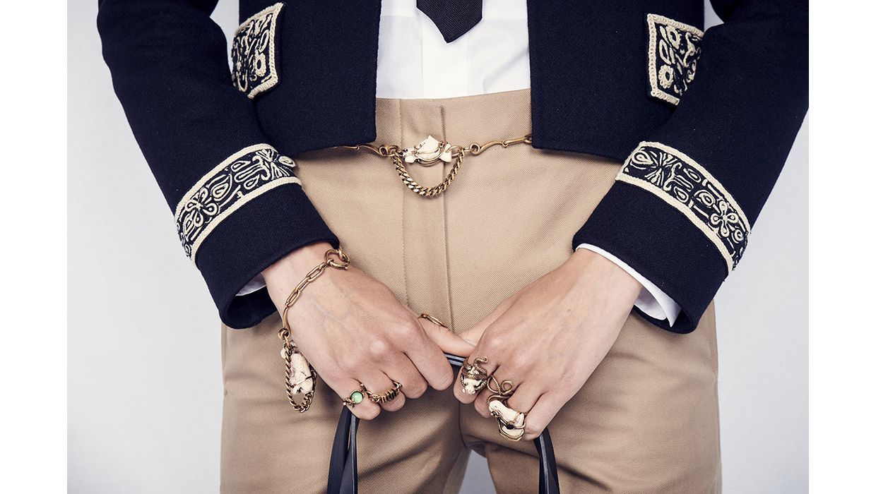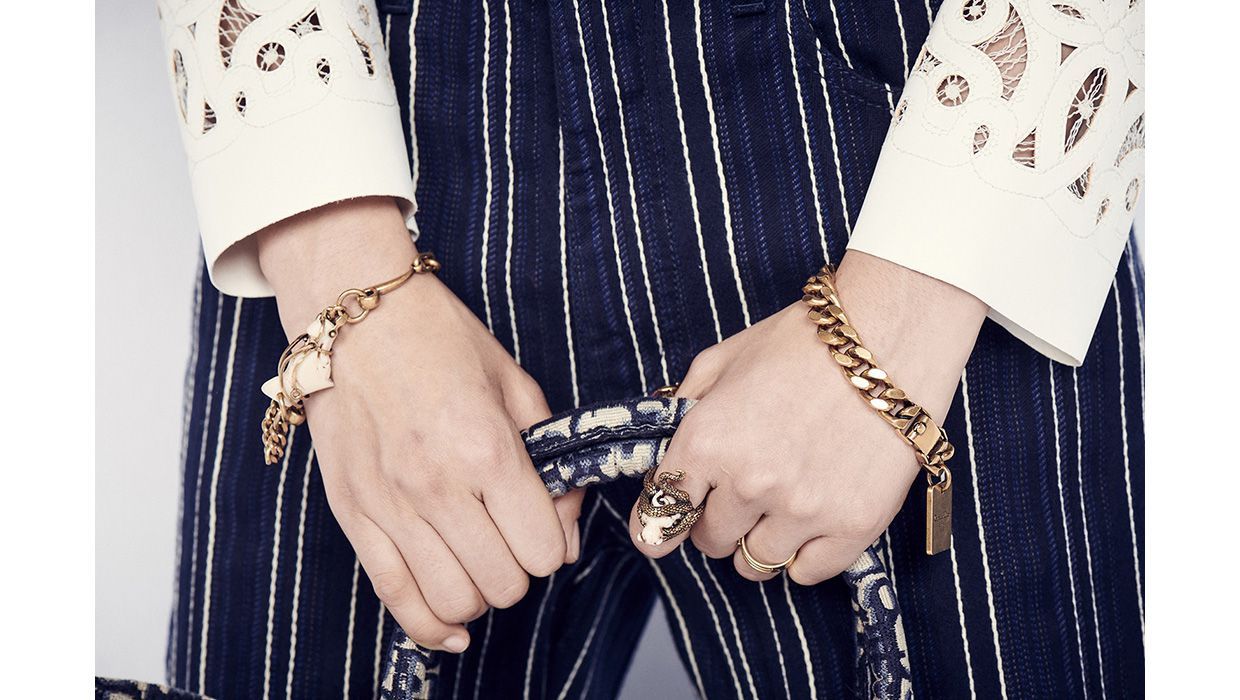 Un altro punto di forza della cruise sono i gioielli come gli orecchini in ottone con logo "J'Adior" abbinati agli orecchino asimmetrici con borchie "Tribales" e ai lunghi orecchini pendenti con motivi a forma di leone o scimmia avvolti intorno alle perle; come i braccialetti e le collane a forma di briglie con doppie catene ornate con teste di cavallo e pendenti di scimmia.