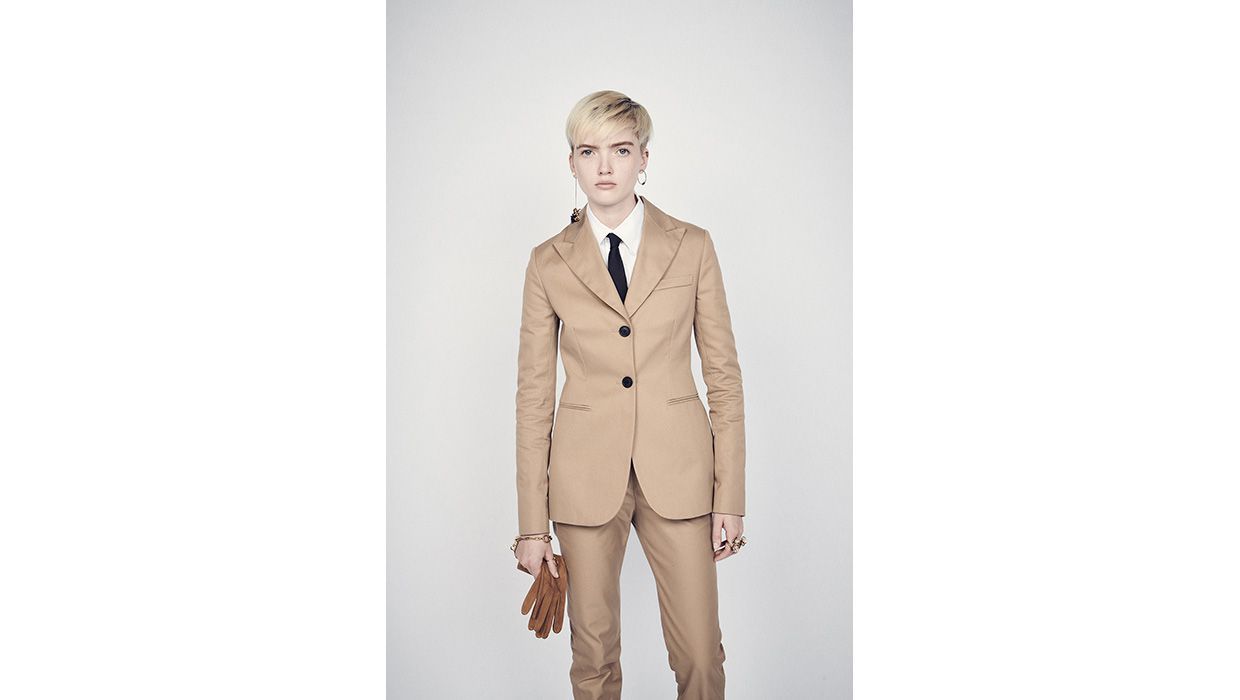 Presso le scuderie storiche Grandes Écuries del Domaine de Chantilly, Maria Grazia Chiuri ha presentato una schiera di amazzoni ultrachic vestite in completi equestri, tailleur color khaki, soprabiti e blouson con motivi Toile de Jouy reinterpretati, bar jacket in pelle, camicie maschili, maxi gonne in pizzo Chantilly, cinture ricamate, combat boots e sneakers, guanti di pelle, borse con nappine e cappelli grandi realizzati da Stephen Jones.