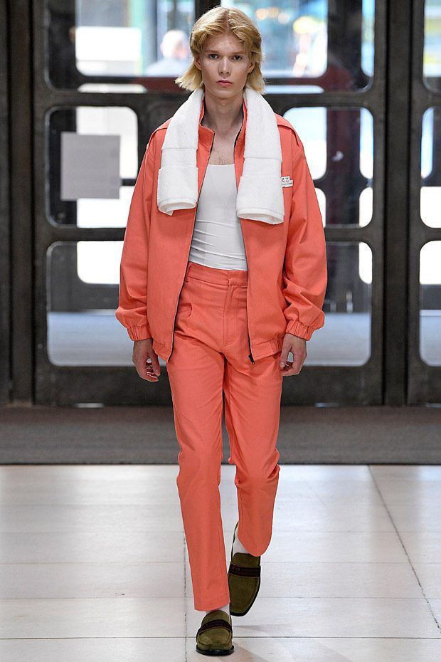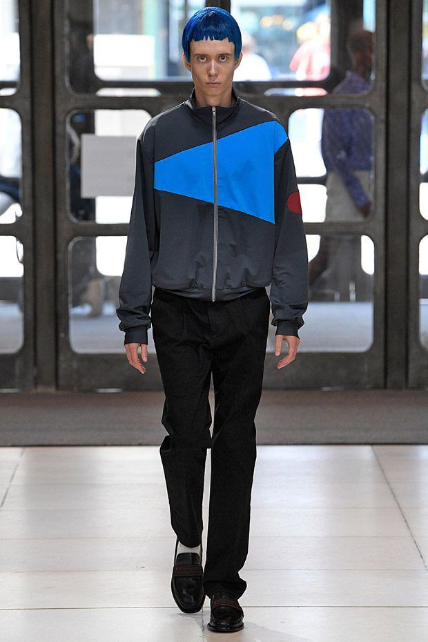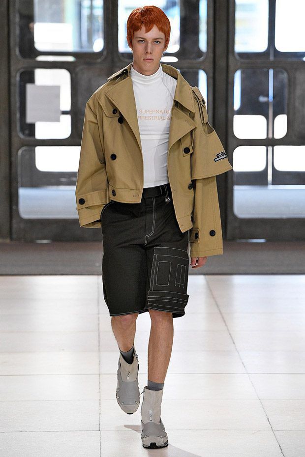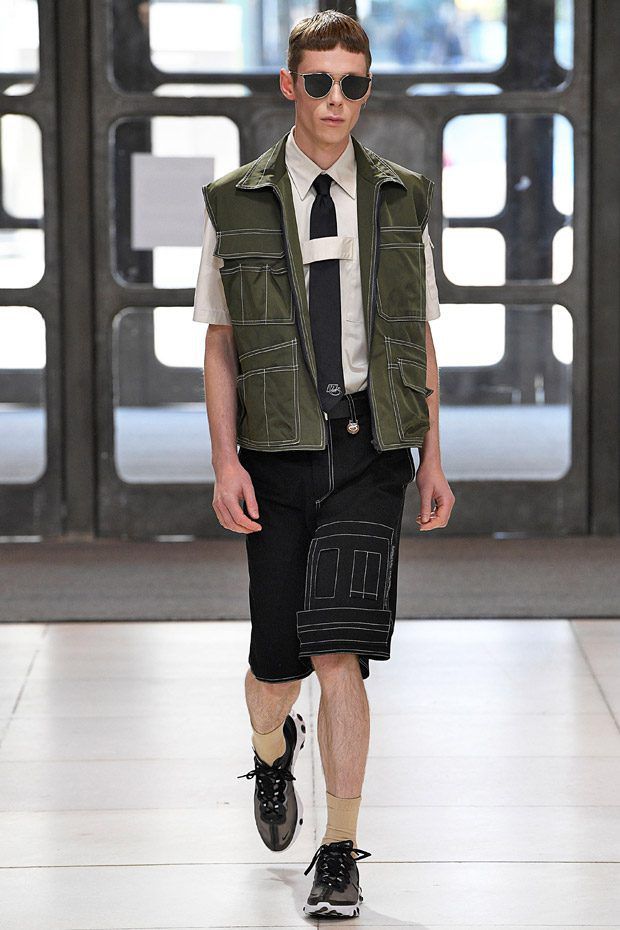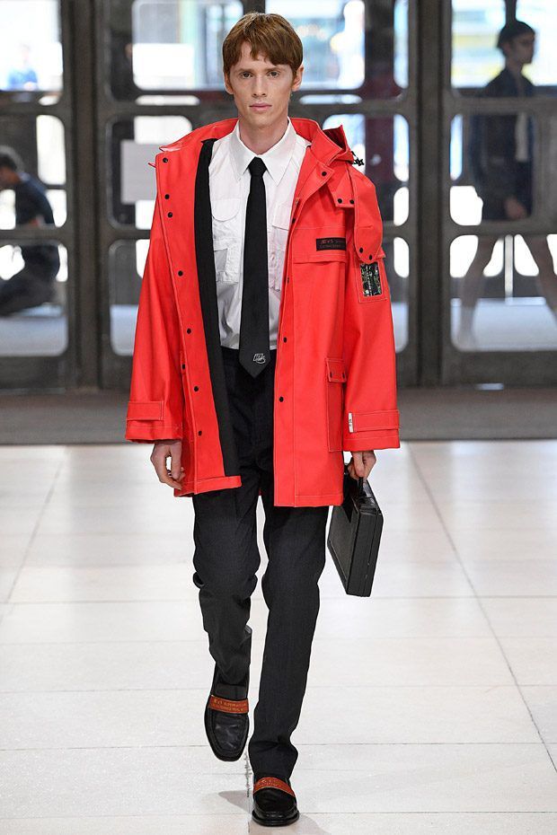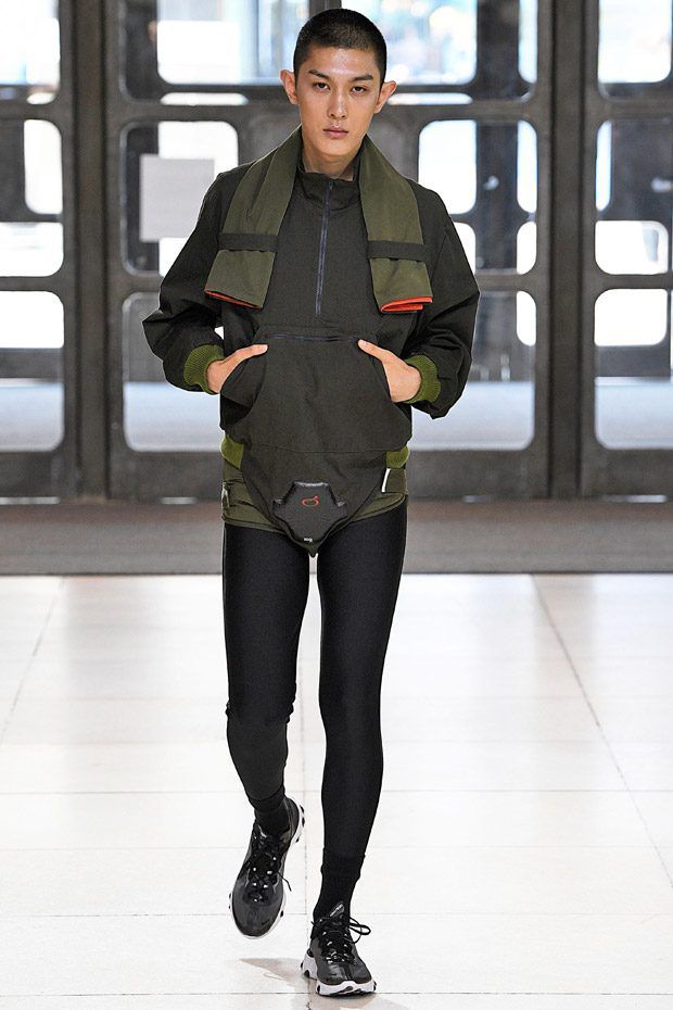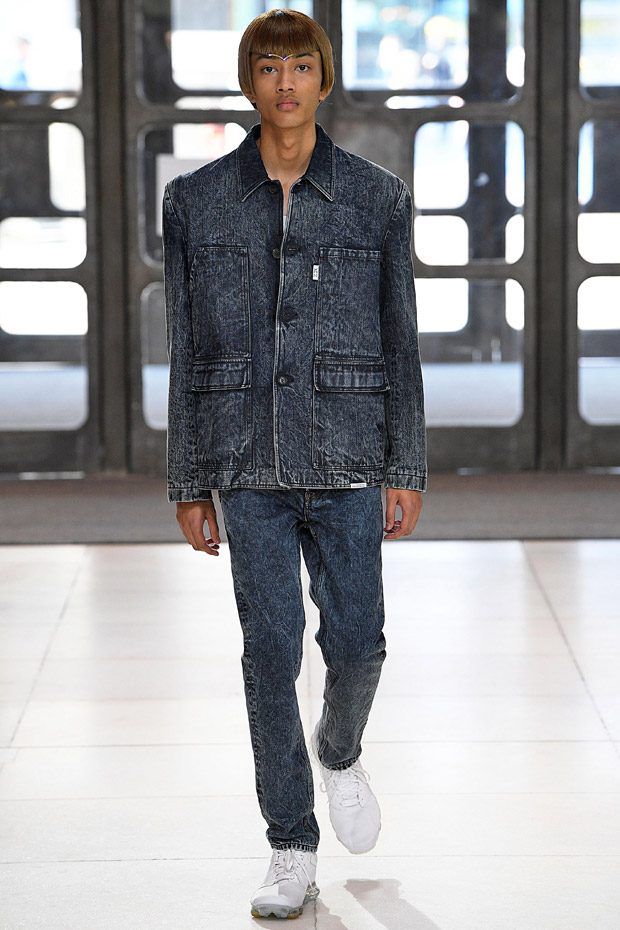 L’estetica sartoriale sportswear, che lo contraddistingue da tempo, fatta di abiti da lavoro, si arricchisce di tessuti futuristici, tavolozze cromatiche lavate con l'acido e trame contaminate; ma sono i dettagli, ispirati alle protesi chirurgiche e opera della truccatrice Isamaya Ffrench, a sorprendere.
