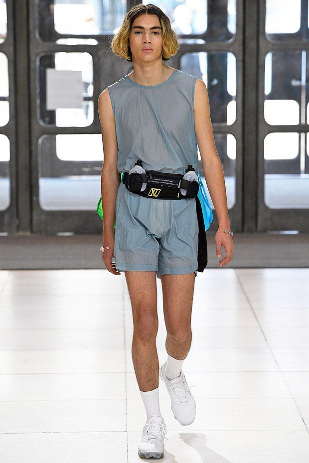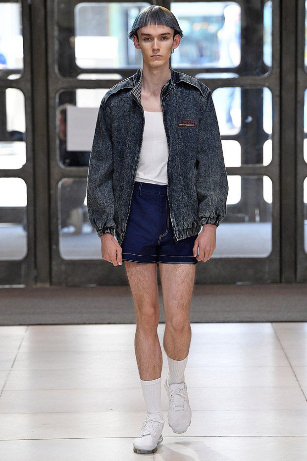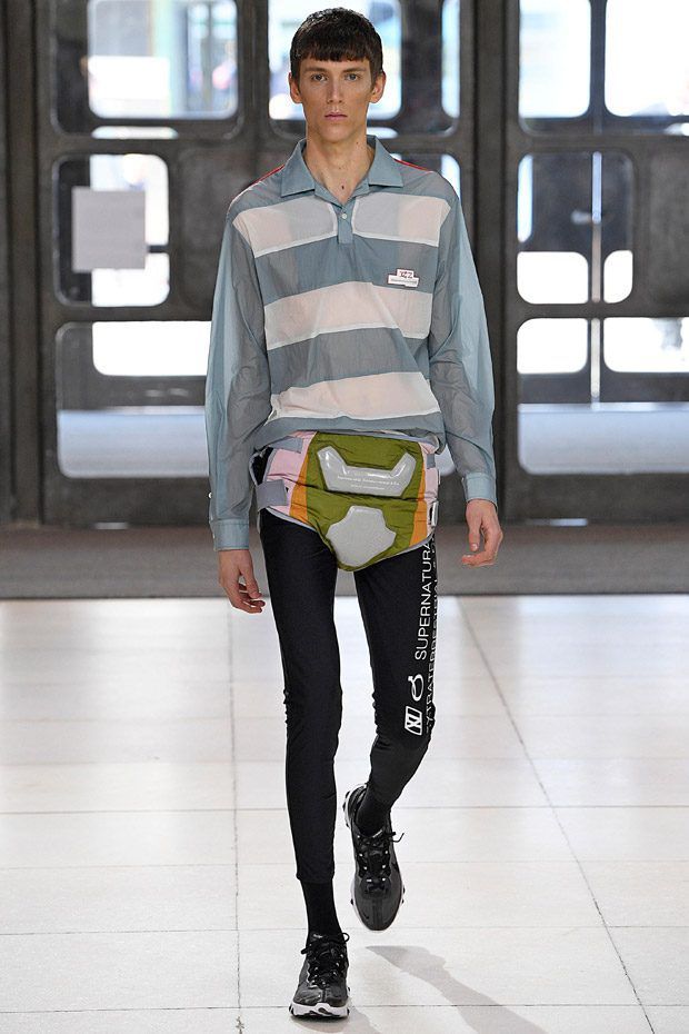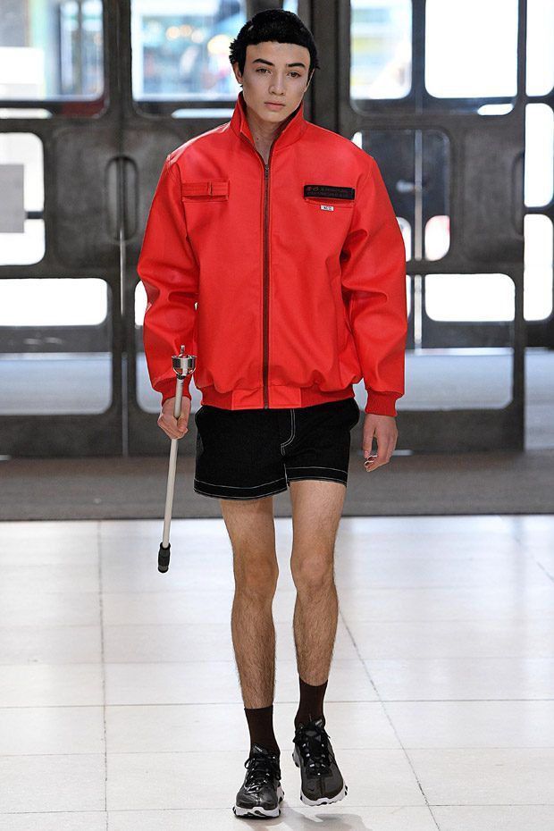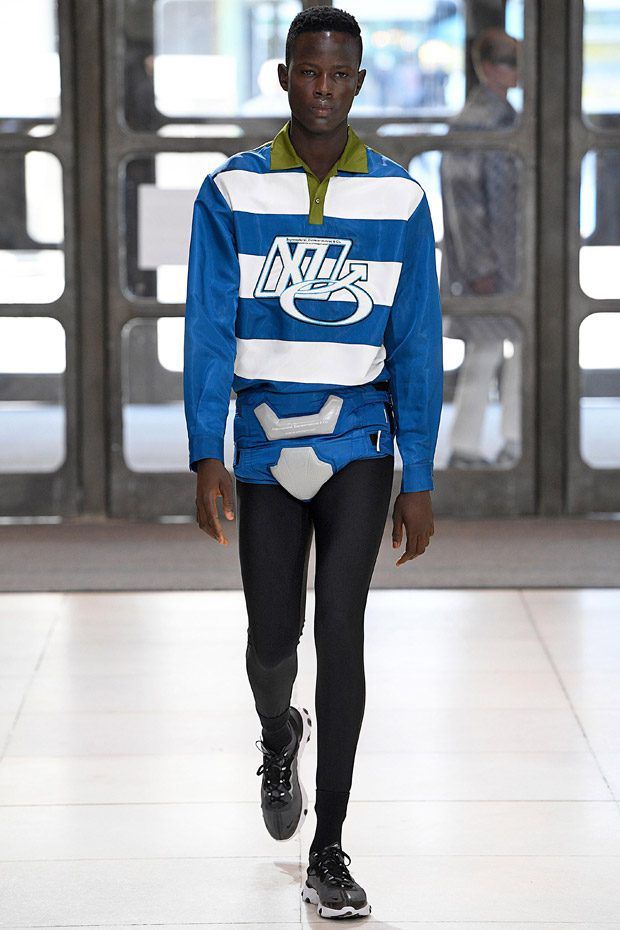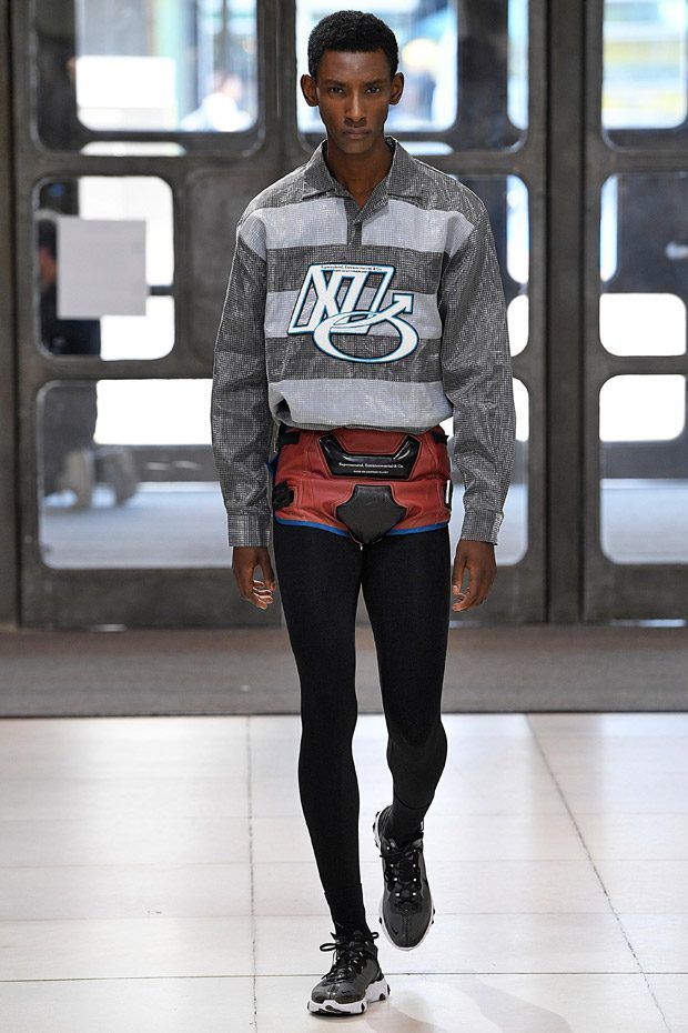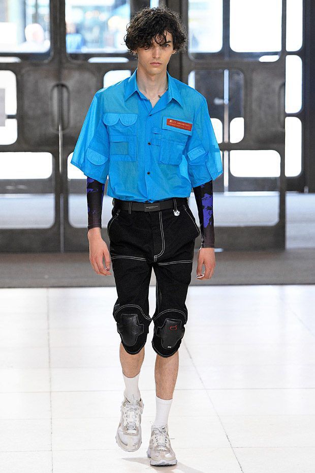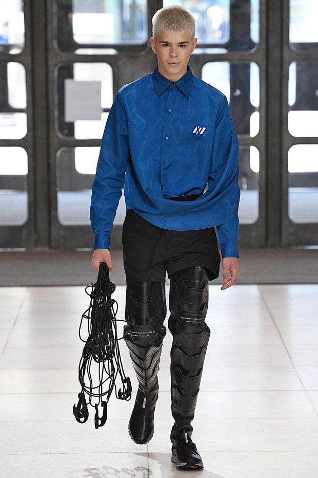 I modelli in passerella indossano ginocchiere e pancioni rotondi in pelle, lenti a contatto di un blu innaturale, fibra ottica luminosa sopra le sopracciglia, protesi alle braccia, parrucche giallo neon, occhiali da sole futuristici (creati con il brand coreano Gentle Monster), camici ospedalieri decorati con stampe extraterrestri, camicie squadrate, strati high tech, giacche della tuta, magliette da rugby, pantaloni attillati, stivali cyberpunk alti fino alla coscia e Nike React Element 87 ai piedi.