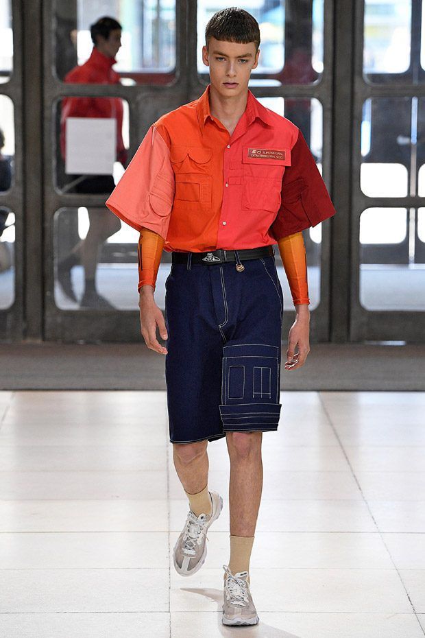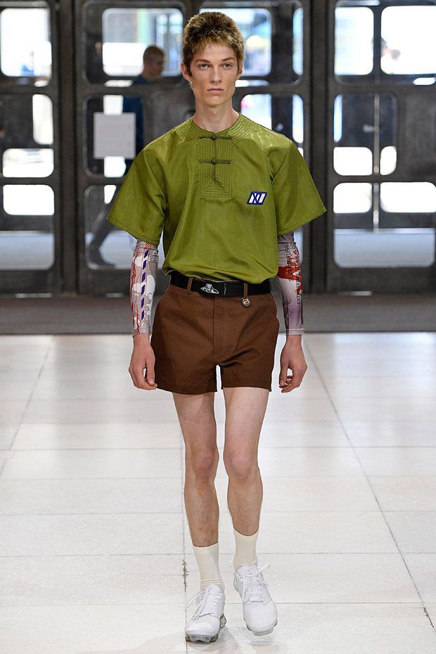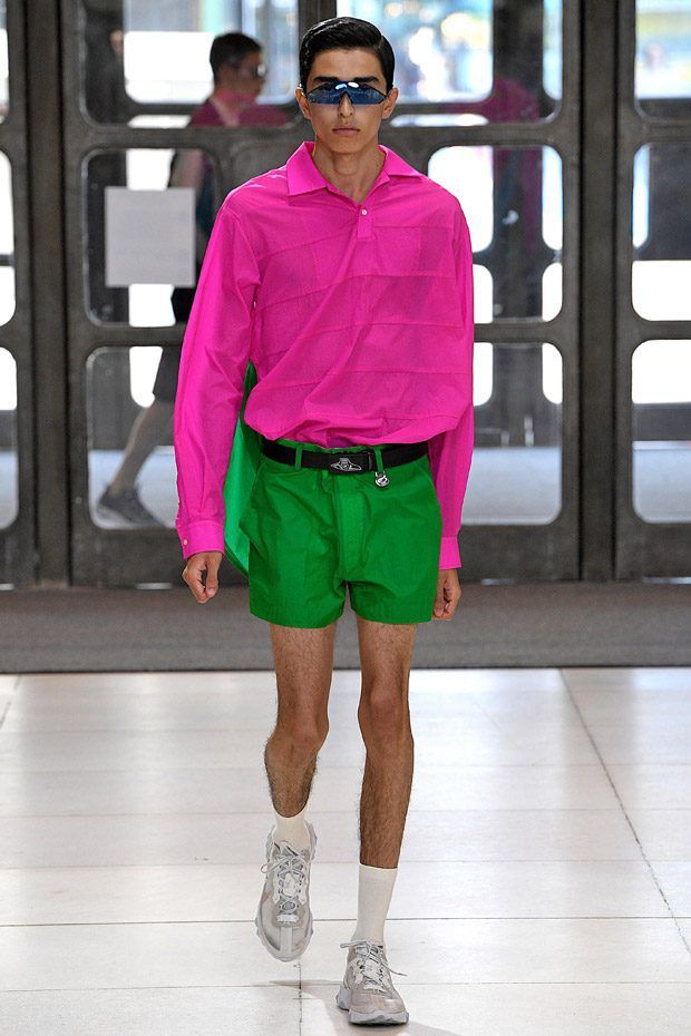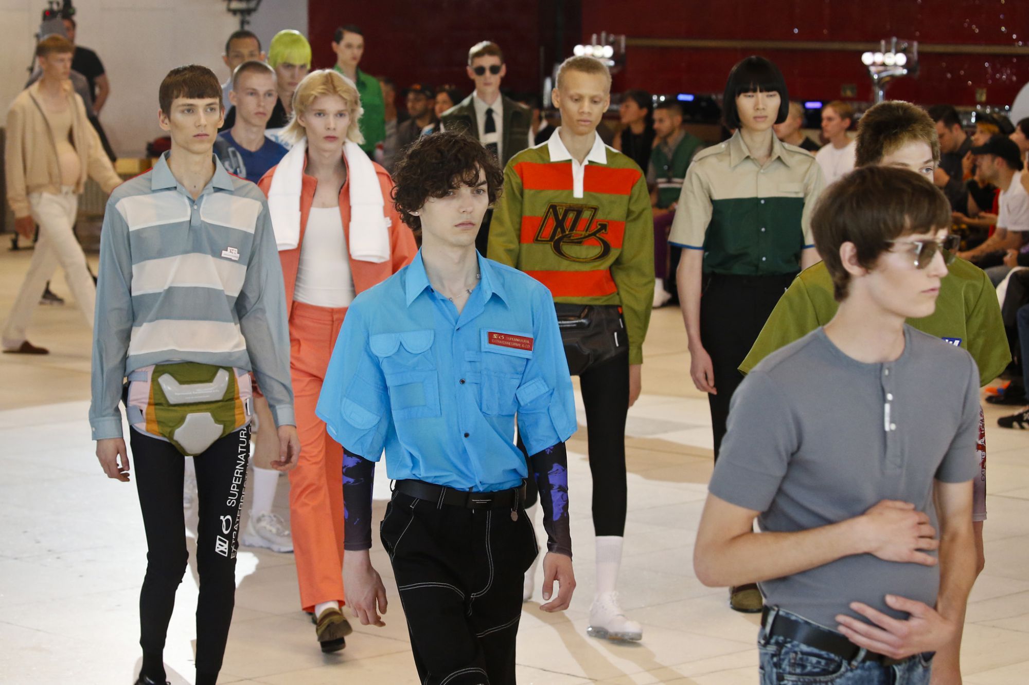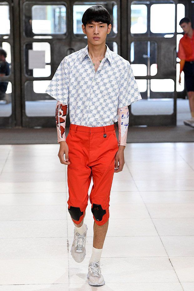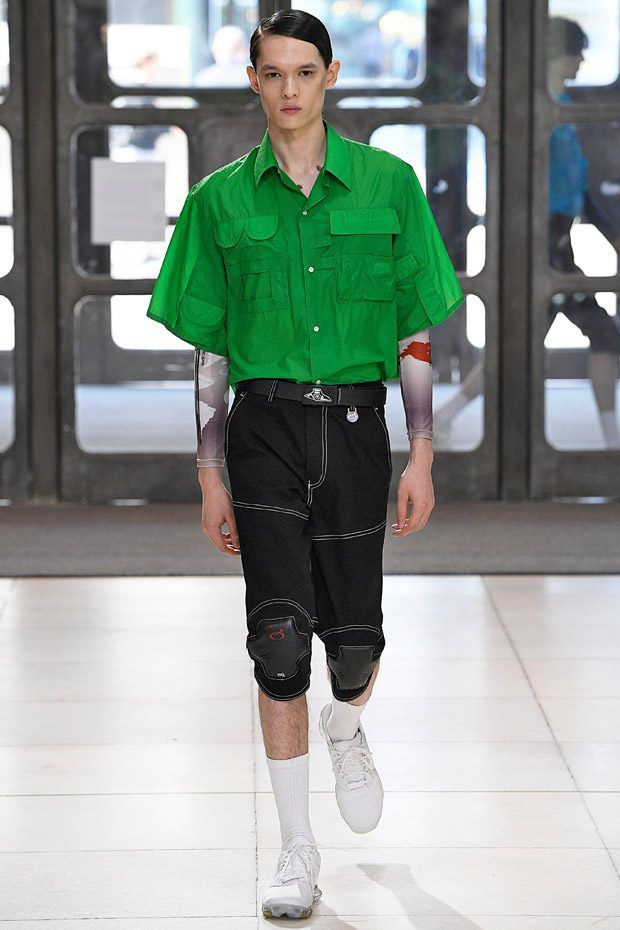 I modelli in passerella indossano ginocchiere e pancioni rotondi in pelle, lenti a contatto di un blu innaturale, fibra ottica luminosa sopra le sopracciglia, protesi alle braccia, parrucche giallo neon, occhiali da sole futuristici (creati con il brand coreano Gentle Monster), camici ospedalieri decorati con stampe extraterrestri, camicie squadrate, strati high tech, giacche della tuta, magliette da rugby, pantaloni attillati, stivali cyberpunk alti fino alla coscia e Nike React Element 87 ai piedi.