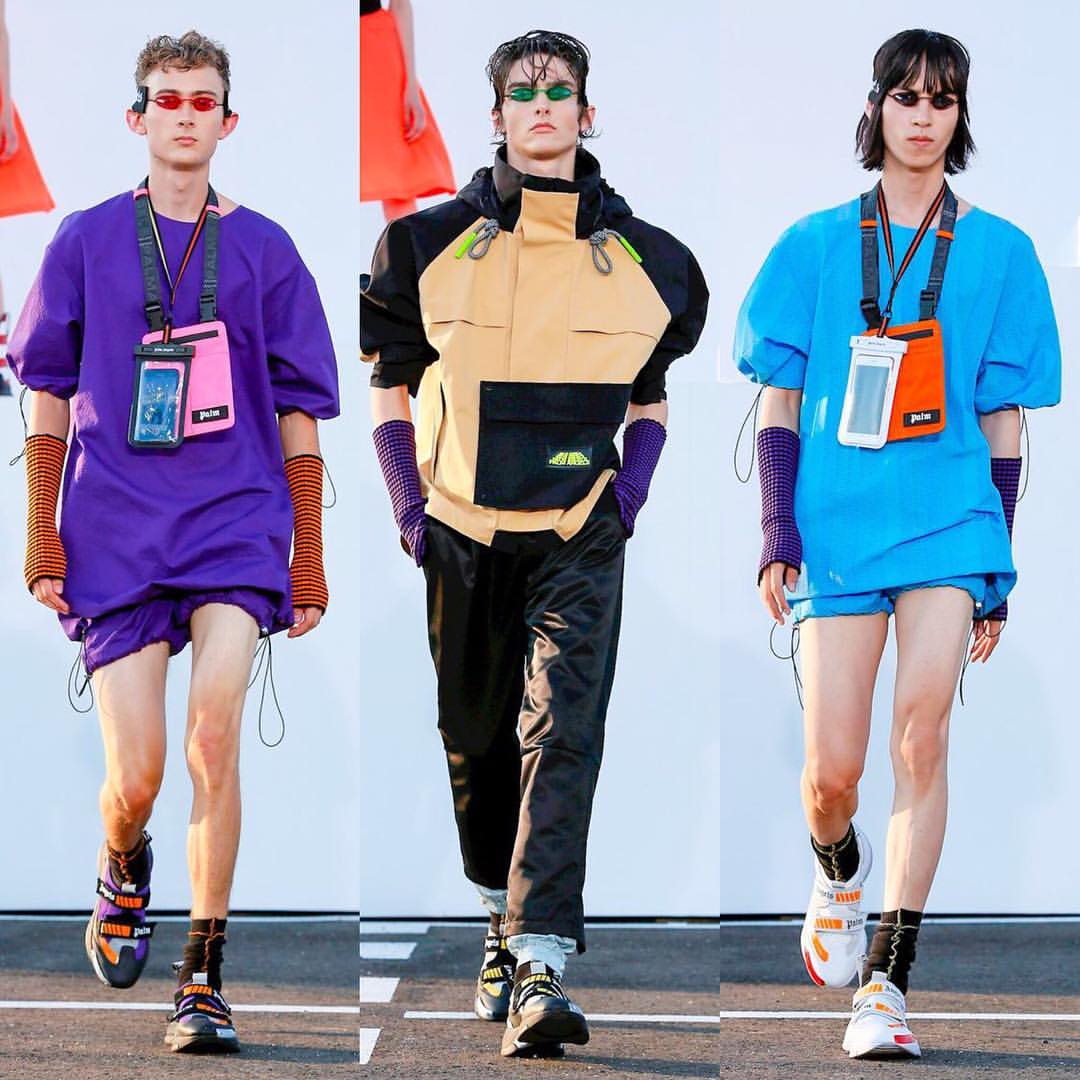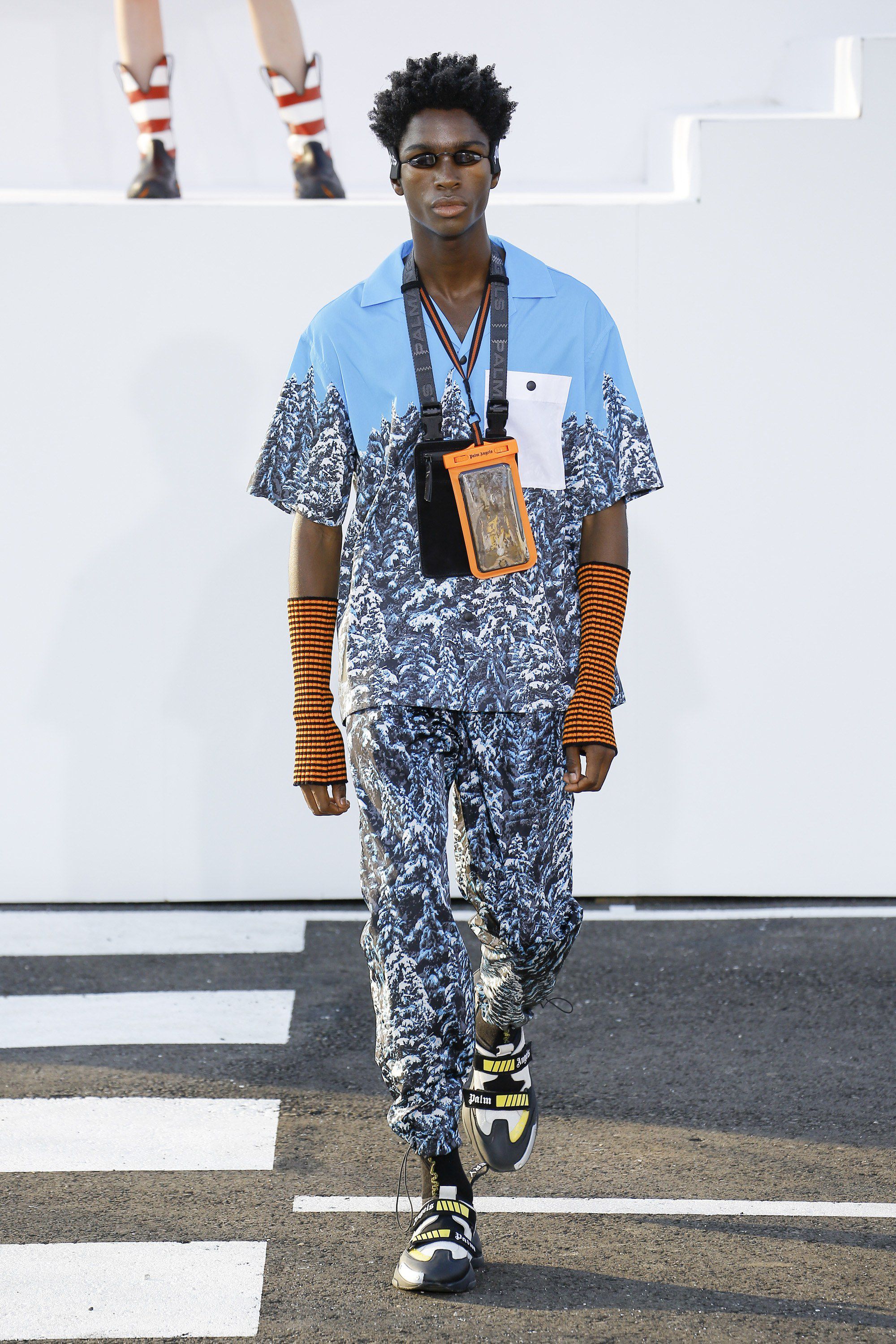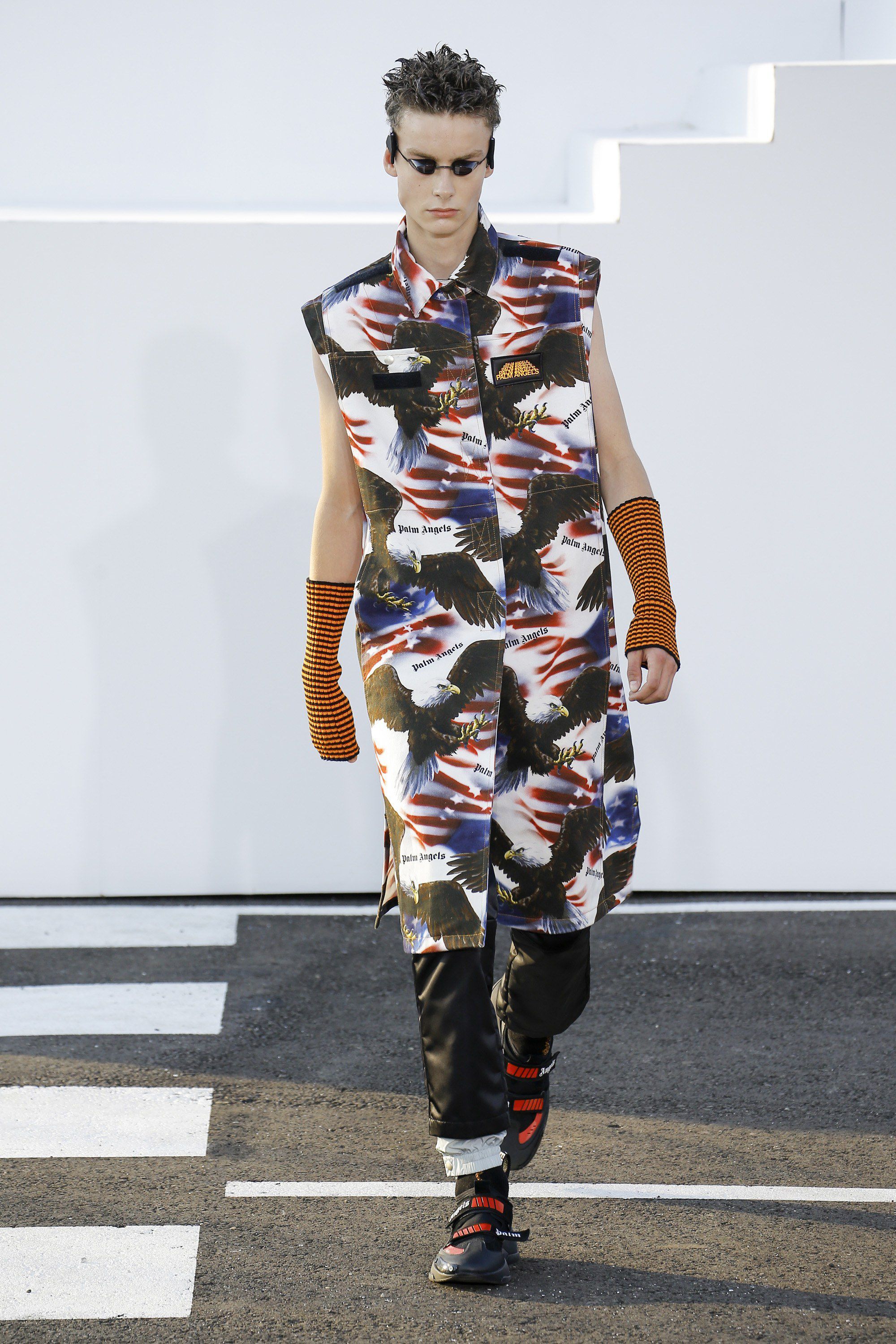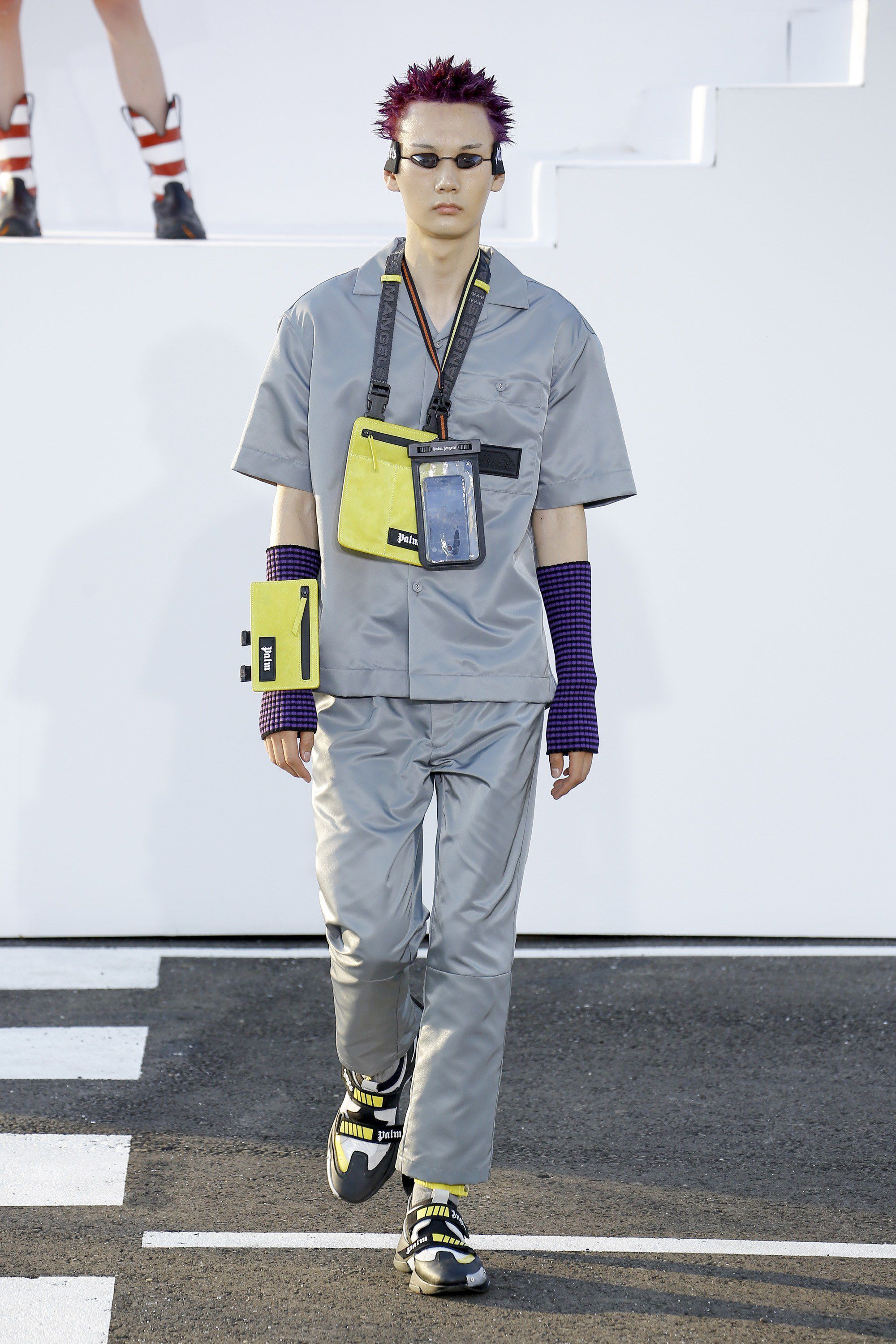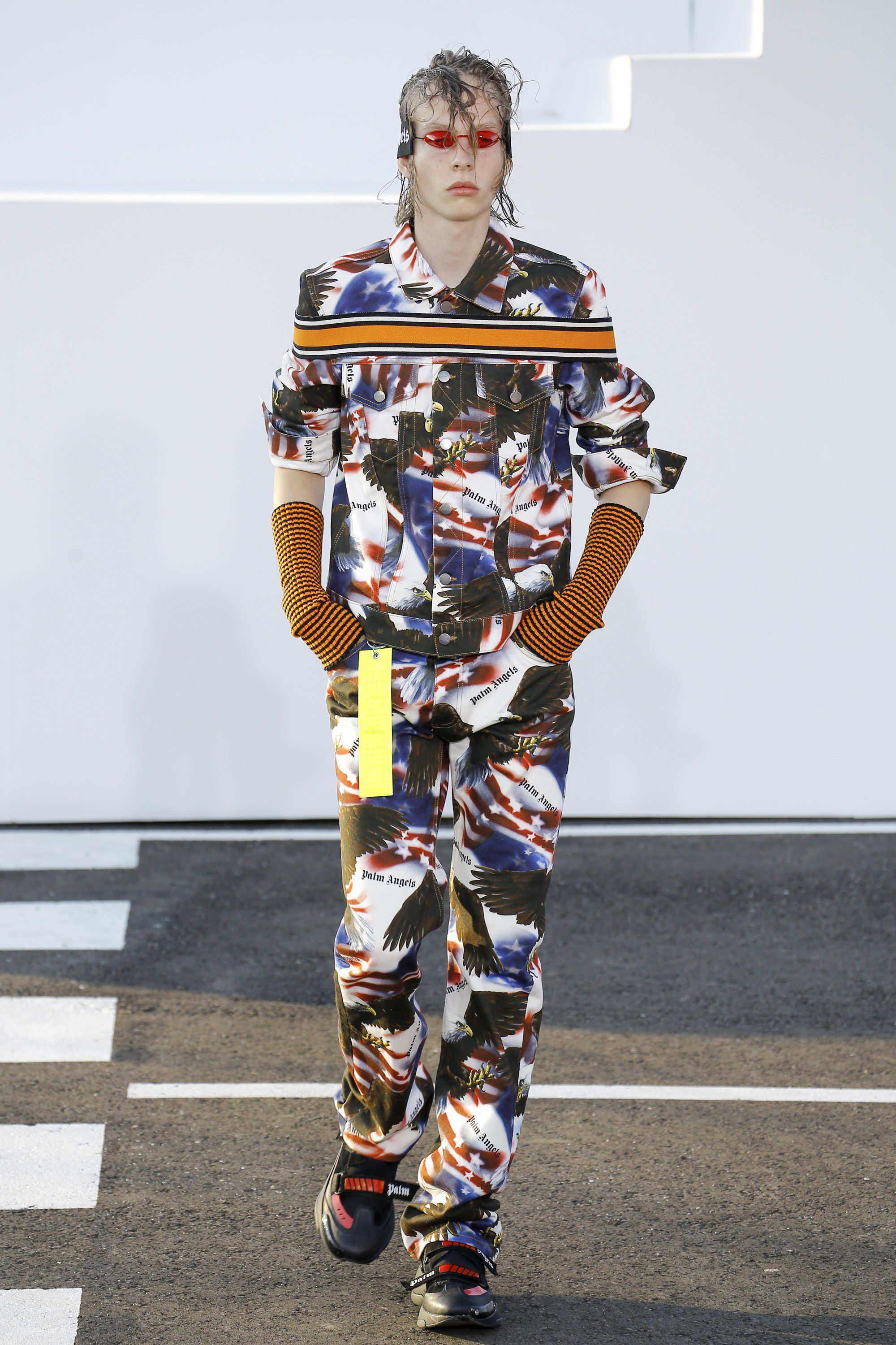 Palm Angels porta in passerella un athleisure distorto, dalla forte attitude streetwear e underground, con elementi "rave" (forse un link alla collaborazione con Swedish House lanciata alla Miami Music Week) e dettagli, come gli occhiali da sole micro stile Matrix dal sapore sci-fi.
