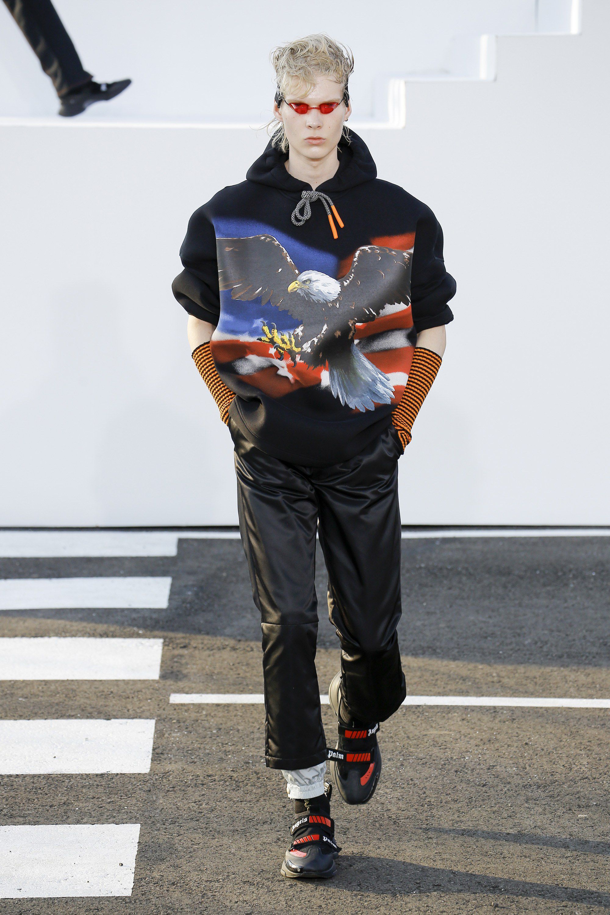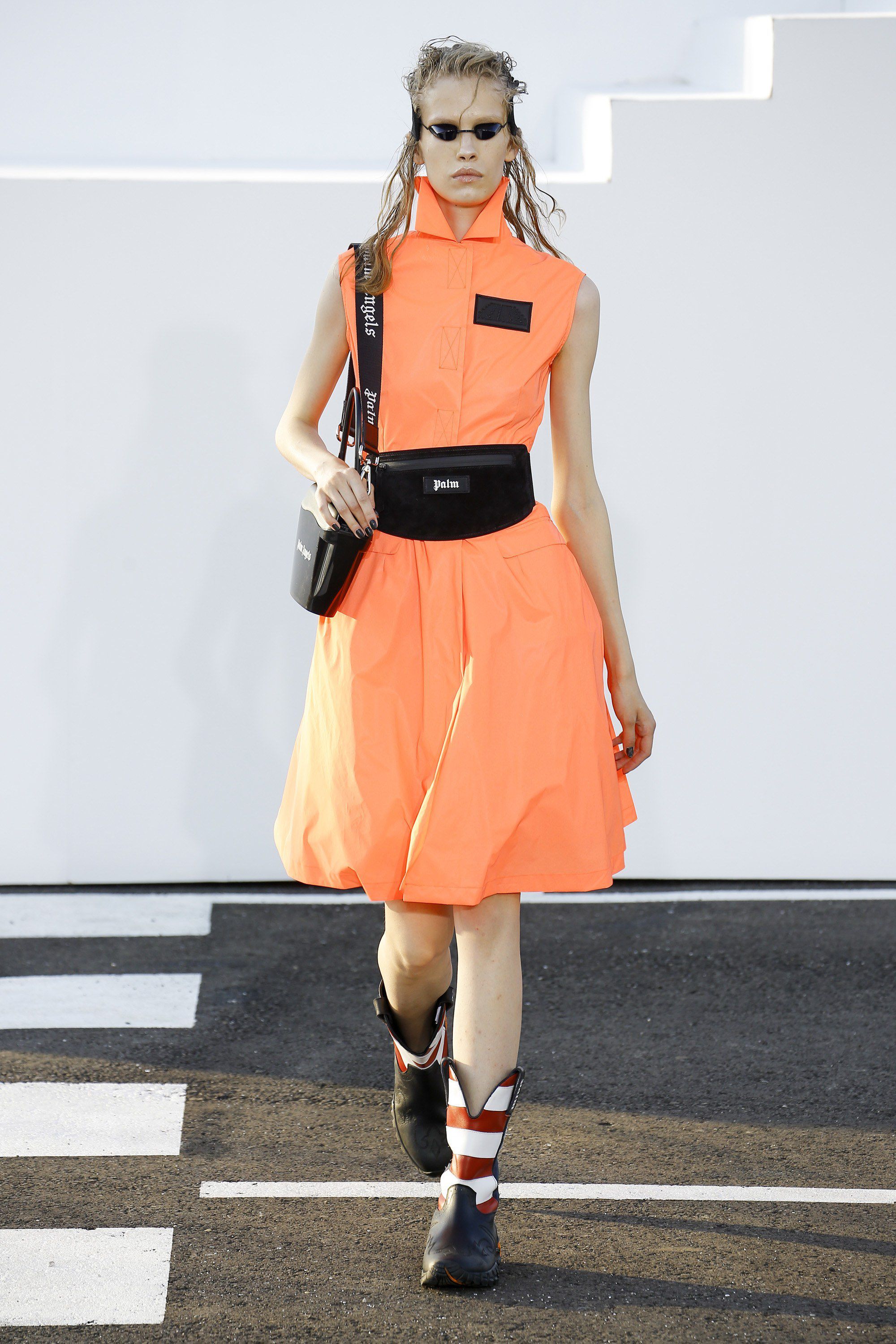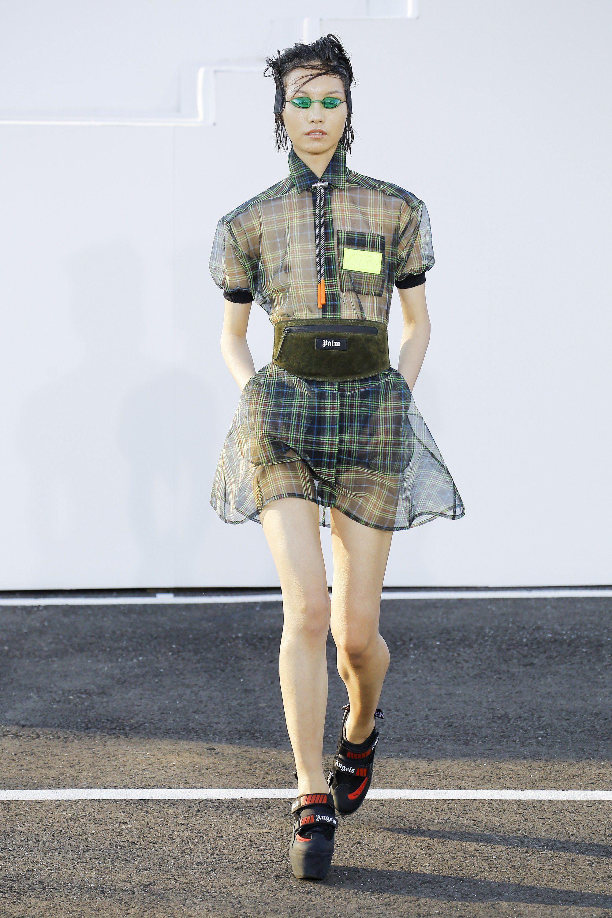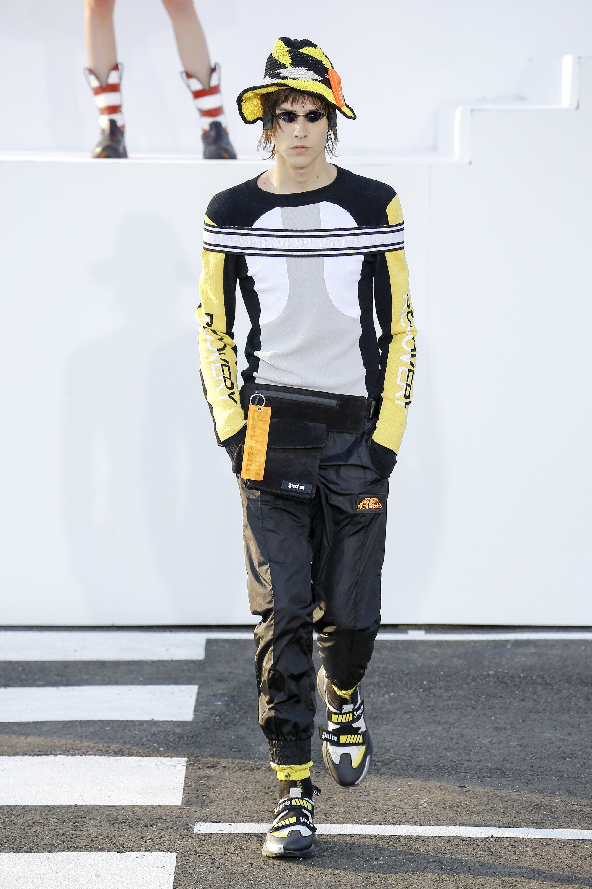 Palm Angels porta in passerella un athleisure distorto, dalla forte attitude streetwear e underground, con elementi "rave" (forse un link alla collaborazione con Swedish House lanciata alla Miami Music Week) e dettagli, come gli occhiali da sole micro stile Matrix dal sapore sci-fi.