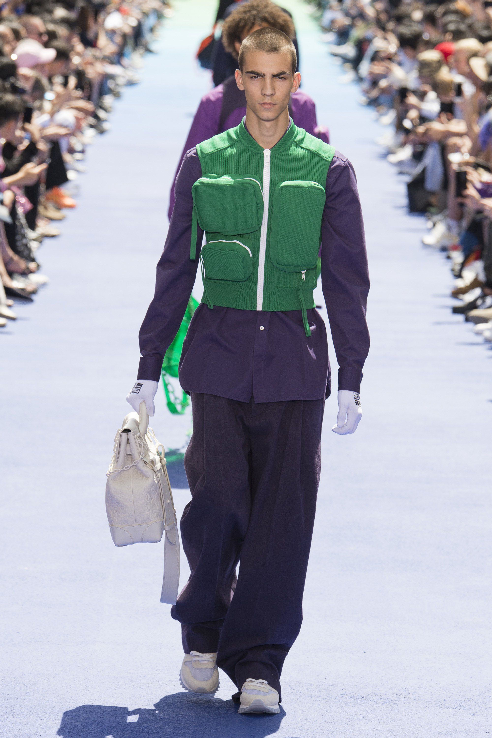 Le camicie di crêpe de Chine rifinite con polsini oversize e colletti ad angolo ritagliato, i pantaloni ampi con laccetti tie-dye giacche, sahariane e una pioggia di una nuova classe di indumenti che Abloh ha definito “acessamorphosis, composta da borse a tracolla, giacche e fondine a spalla, sono pennellate che colorano una potente tela bianca.