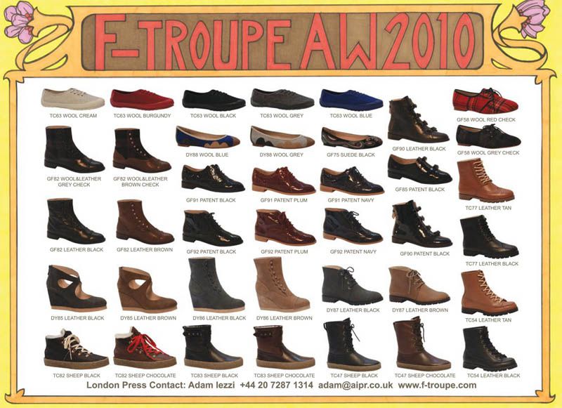 La collezione F Troupe fall winter 2010/2011 ha dato ampio risalto agli stivaletti per entrambi i sessi. I tessuti scelti sono la classica pelle declinata in varie tinte e la lana. Molteplici i modelli, ma tutti facilmente riconducibili al filo conduttore vittoriano che contraddistingue perfino lo store di Soho a Londra.