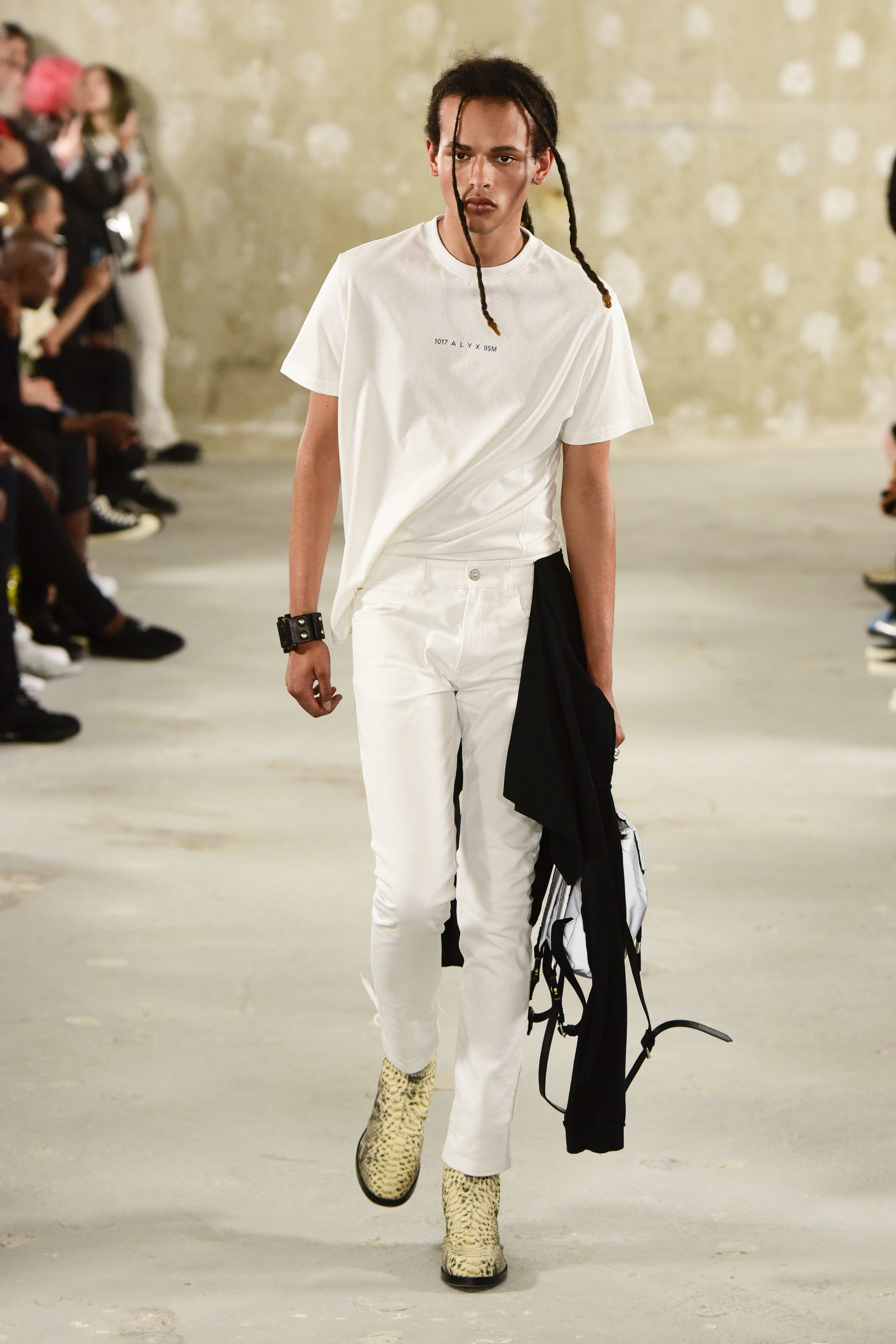 La missione è sicuramente riuscita. La collezione comprendeva giacche, blazer, top, magliette, pantaloni, abiti, dai tagli netti e puliti, il nero e il bianco predominavano, ma non sono mancati capi in verde lime e turchese. Ciò che rende 1017 Alyx 9SM davvero unico sono i dettagli, e i pezzi erano spesso impreziositi da cerniere particolari, ma soprattutto dalle chiusure come quelle delle cinture delle montagne russe per cinture e borse, ormai vero marchio di fabbrica di Alyx. Continuando su questo trend è stata introdotta anche una nuova fibbia, che sembra riprendere molto l'attrezzatura da montagna. L'asso nella manica della collezione è stata la stampa serpente che decorava i top, i pantaloni e le scarpe.