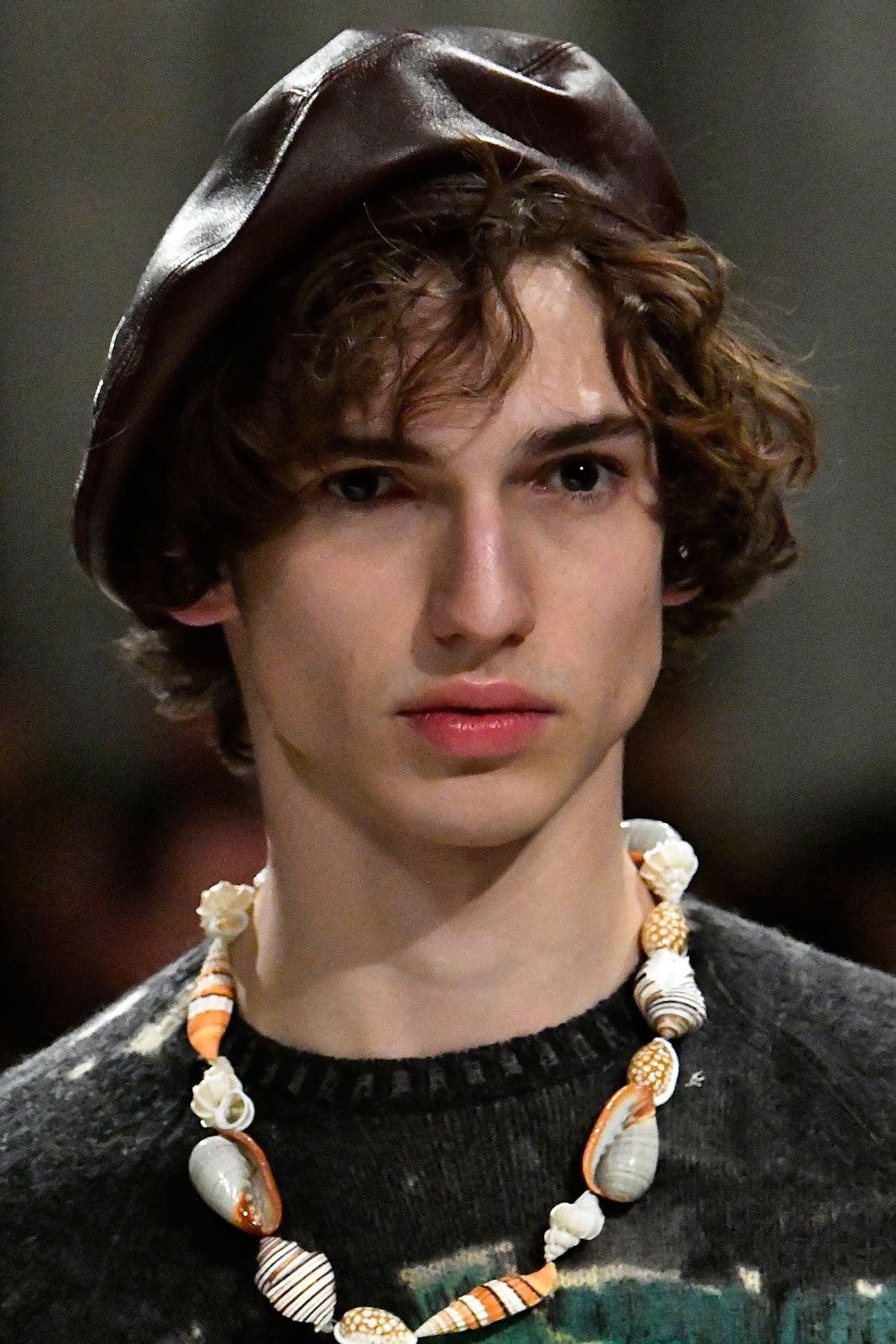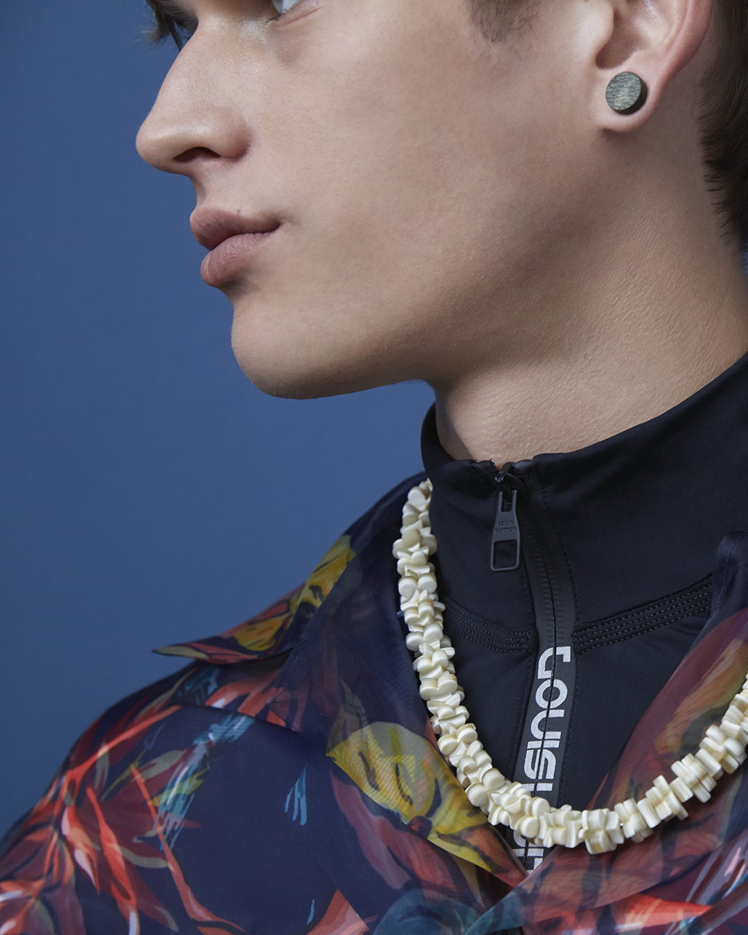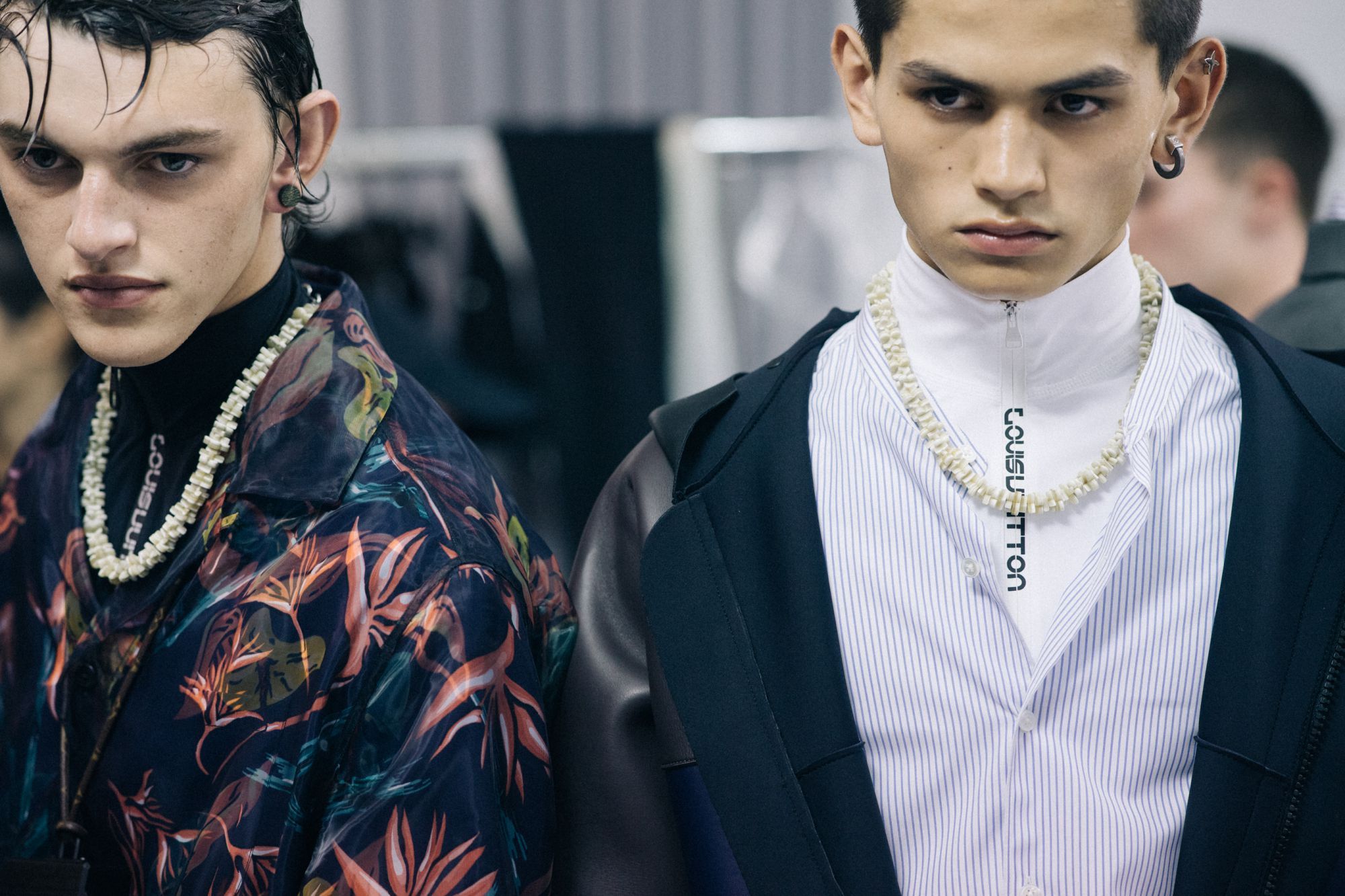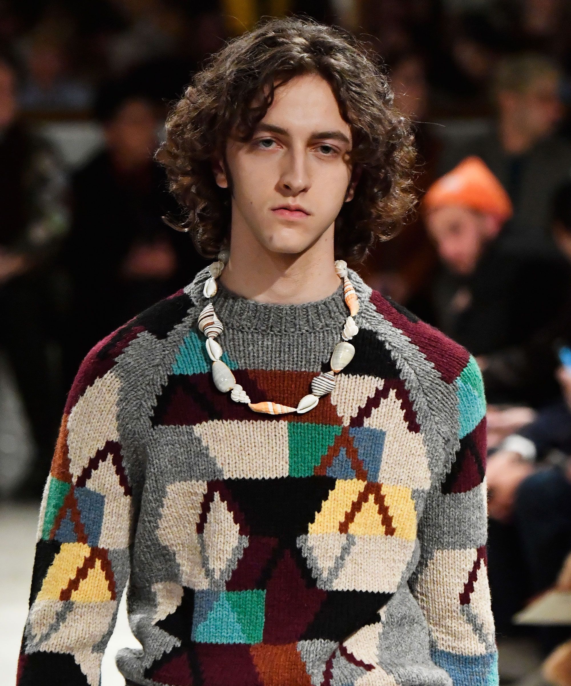 E Vuitton? Kim Jones, nella sua collezione per la maison francese, ricrea il più classico dei matrimoni stilistici: camicia hawaiana e collana puka.