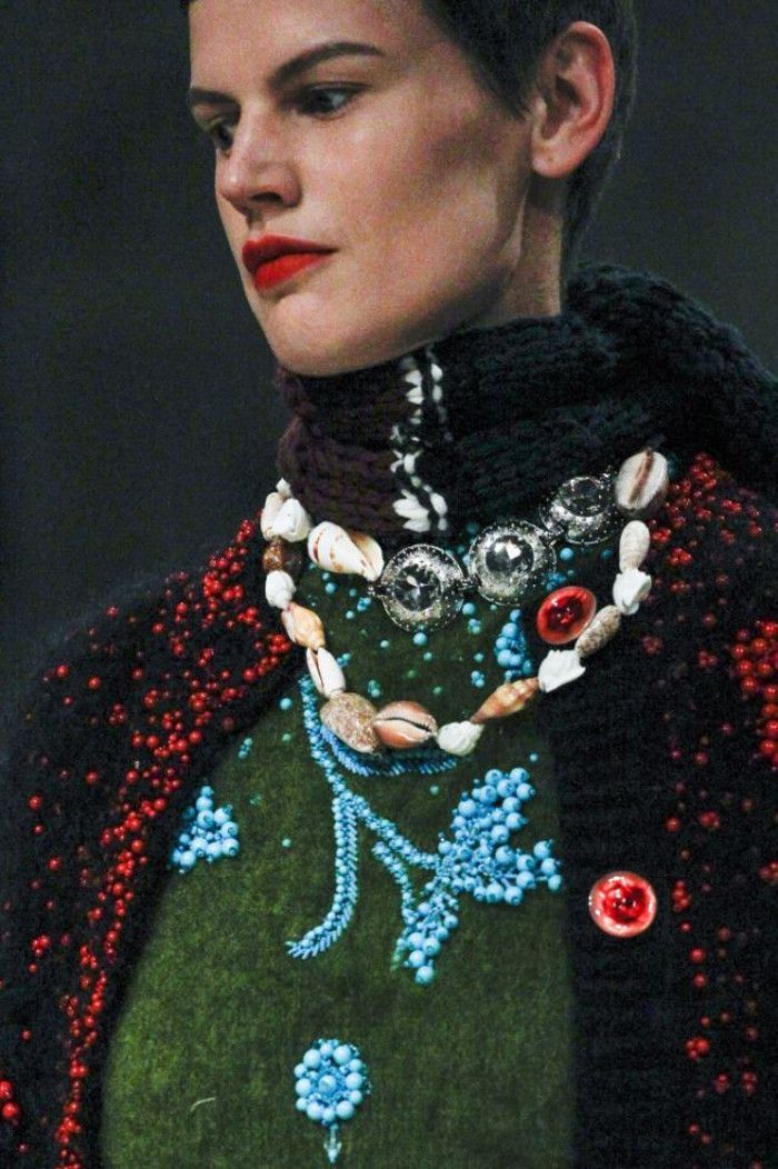 Si sa, la Signora Miuccia ha fatto di un’intelligente rivisitazione del brutto sia una forma d’arte sia un marchio di fabbrica, quindi, in quest’ottica, non stona nemmeno quel girocollo di cipree e altre conchiglie che spunta a completare capi in velluto a coste dal sapore 70s e maglioni d'angora. Già, perché la vera mossa geniale di Prada è abbinare un gioiello tipicamente estivo con pezzi della collezione autunno-inverno.