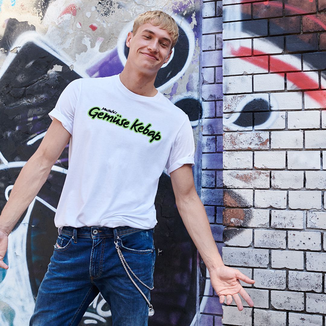 Mustafa è talmente iconico che Diesel ha disegnato insieme a lui una capsule collection. Con uno sguardo piuttosto ironico e irriverente nei confronti dell'ossessione per le collaborazioni oggi dominante nel mondo della moda, la capsule comprende felpe, T-shirt e cappellini decorati da grafiche che riprendono sia il logo di Diesel che quello di Mustafa's Gemüse Kebap. I capi sono pensati per tutti gli appassionati di moda che non si prendono troppo sul serio. Ogni pezzo di questa limited edition è un must have, anche grazie alla filosofia ironica che c'è alla base. Piccanti e gustosi come il kebap di Mustafa, gli item della collezione saranno prodotti in numero limitato.