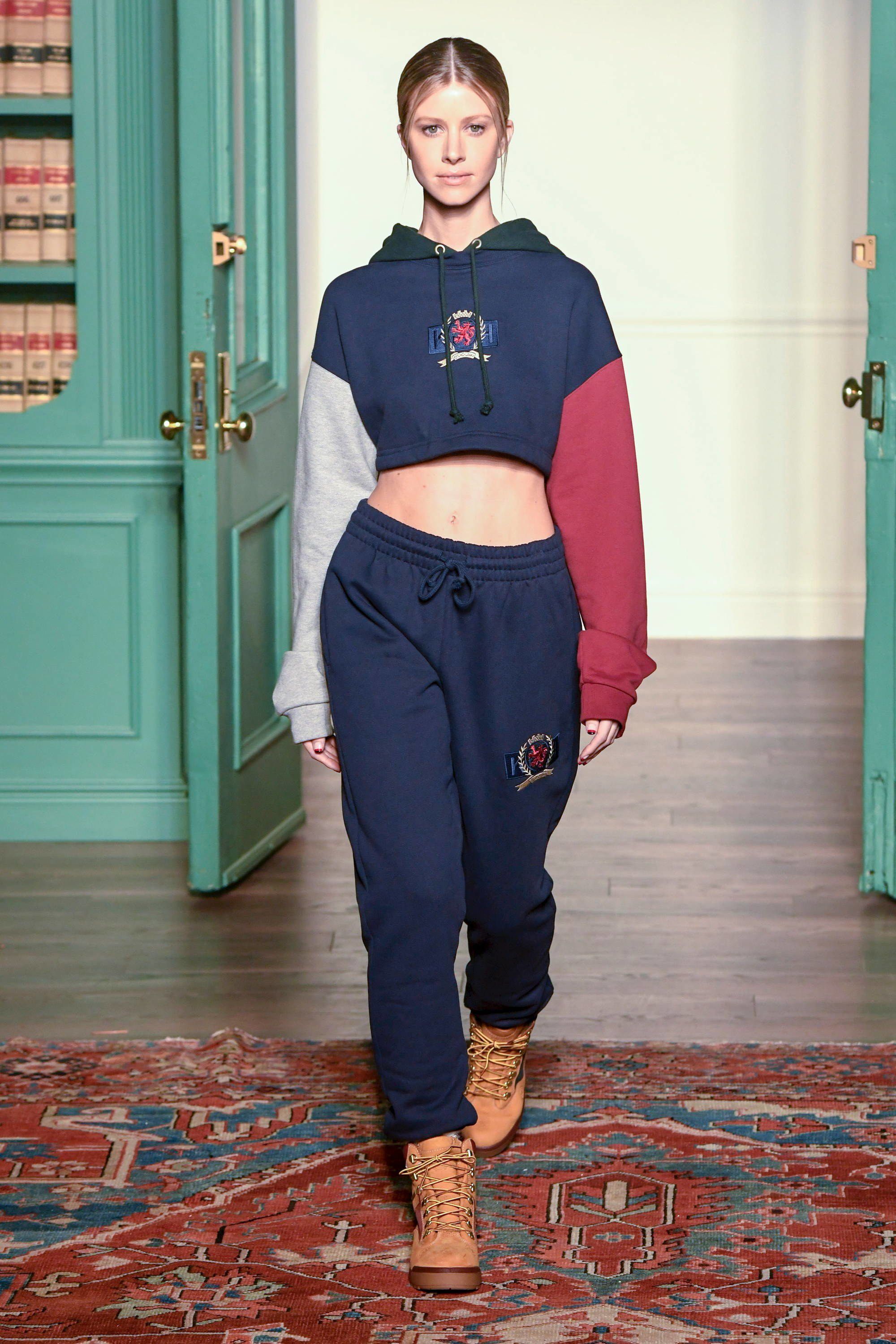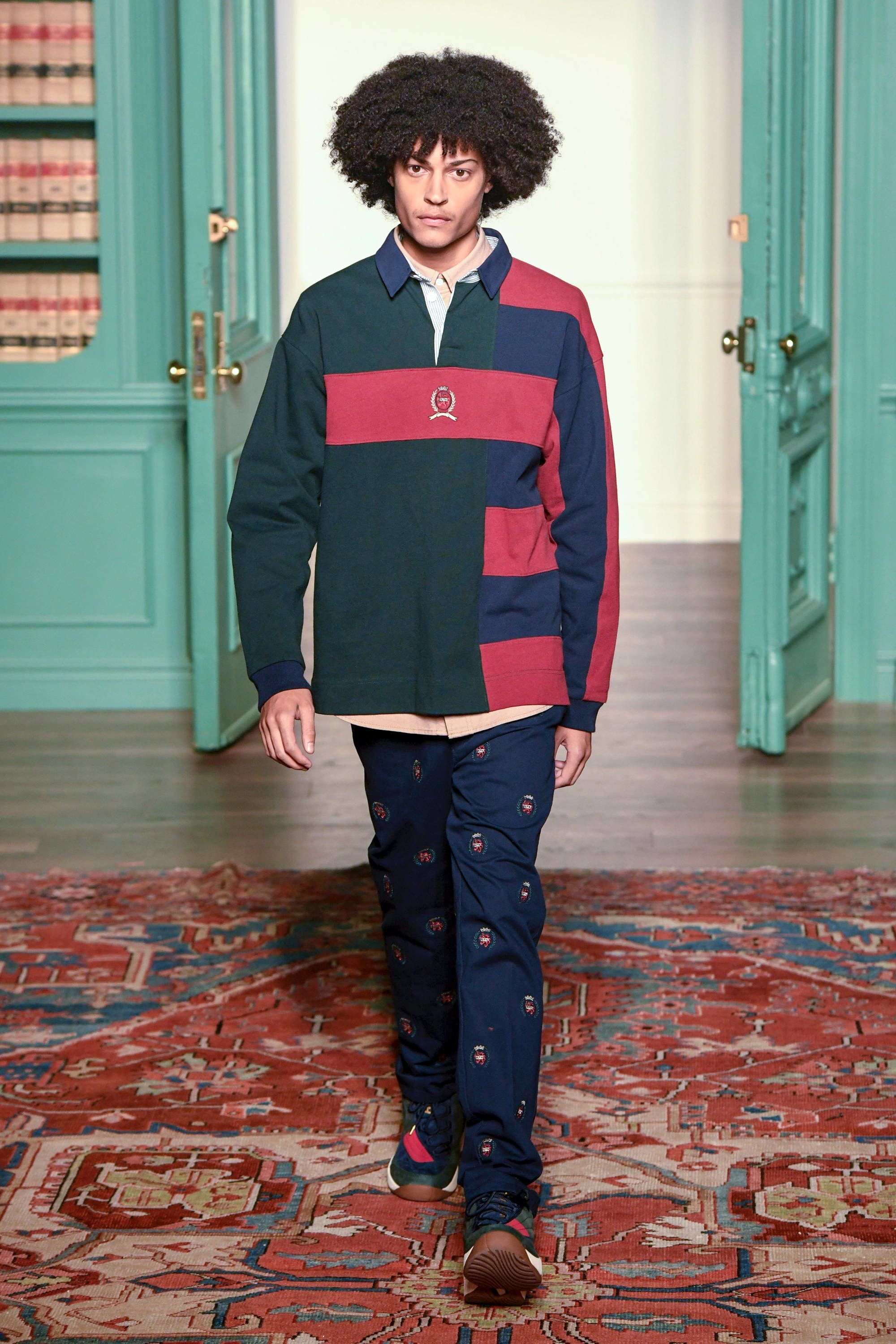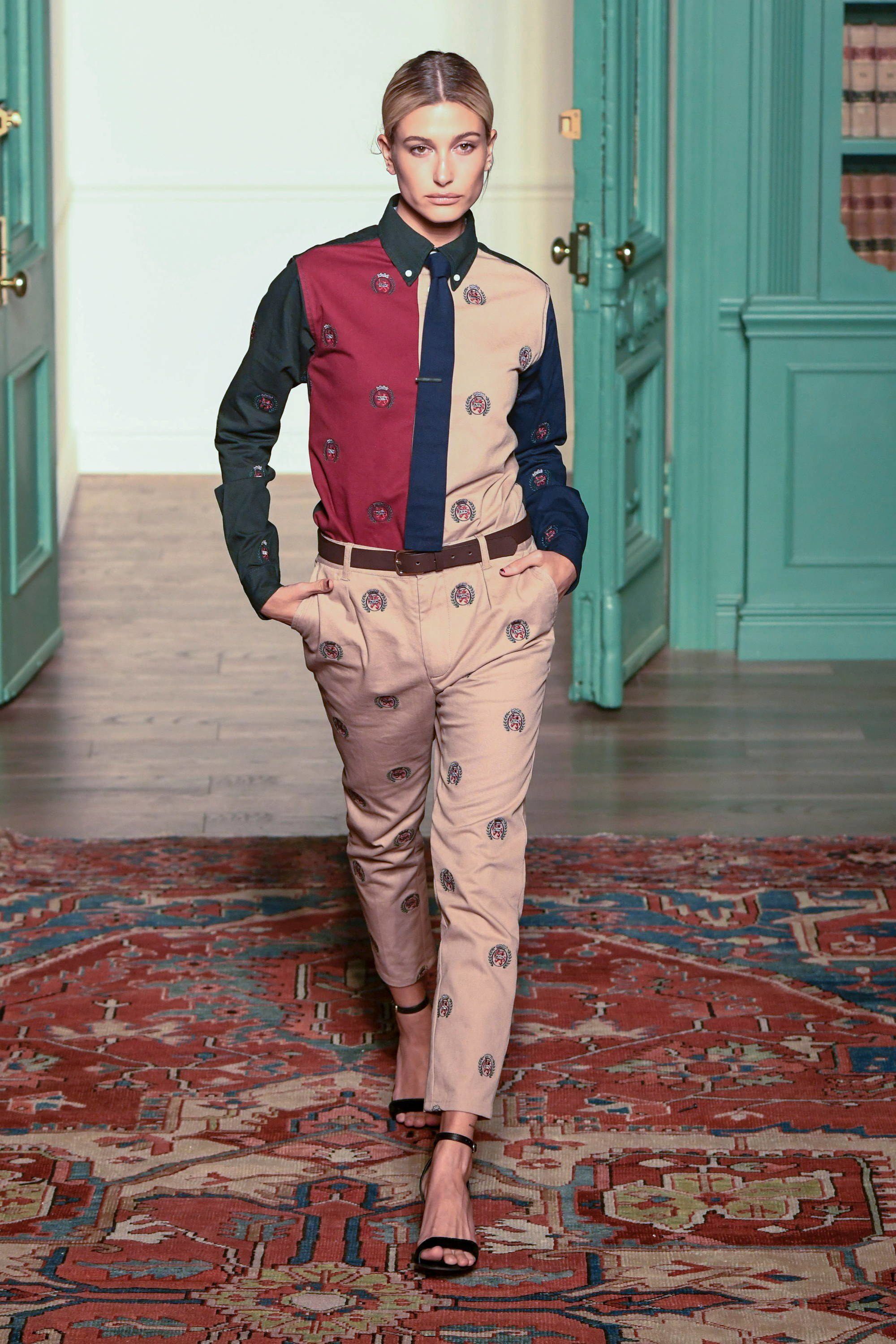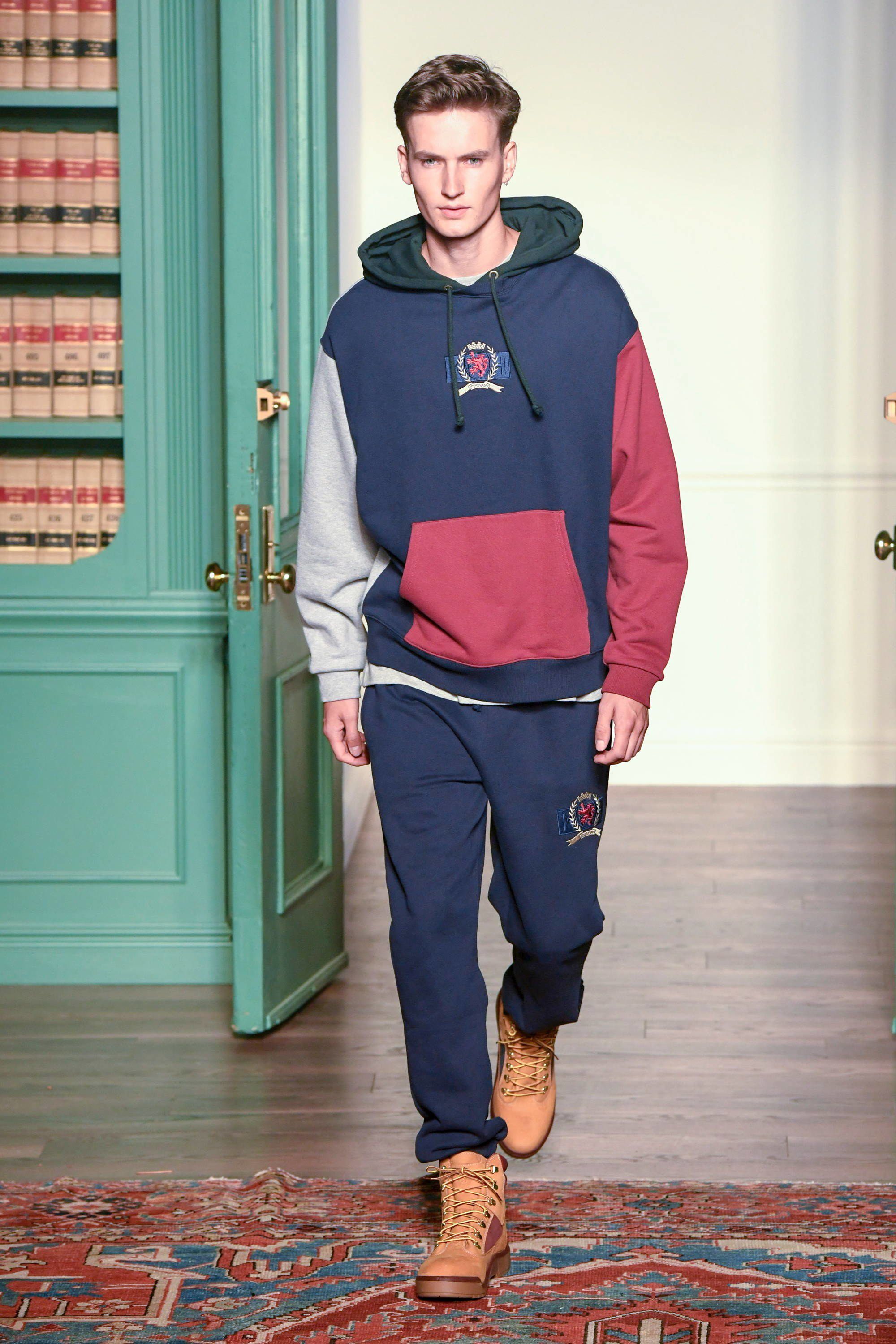 Sulla passerella, allestita con una serie di librerie, arriva Hailey Baldwin, l’it girl più chiacchierata del momento grazie al fidanzamento con Justin Bieber, e inizia la sezione dello show dedicata alla collaborazione con Tommy Hilfiger. La modella in camicia e cravatta color block accostata a pantaloni cachi tagliati, tutto con stampa all-over, offre il primo sguardo su una proposta fortemente condizionata dall’ “effetto nostalgia” per i classici dello streetwear anni ’90, nata da una rivisitazione dell’immenso archivio dello stilista americano. I capi, tra preppy e streetstyle, dalle felpe alle polo, dai trucker in denim ai giubbotti, sono aggiornati in chiave moderna, con tagli più attuali, co-branding, mantenendo però i colori OG di Hilfiger. La capsule comprende anche calzature: la Hilfiger Athletics Skew Basketball Sneaker, che torna per la prima volta dal 1996, e gli stivali (6" Construct e 40 Below Super Boot) realizzati con Timberland.