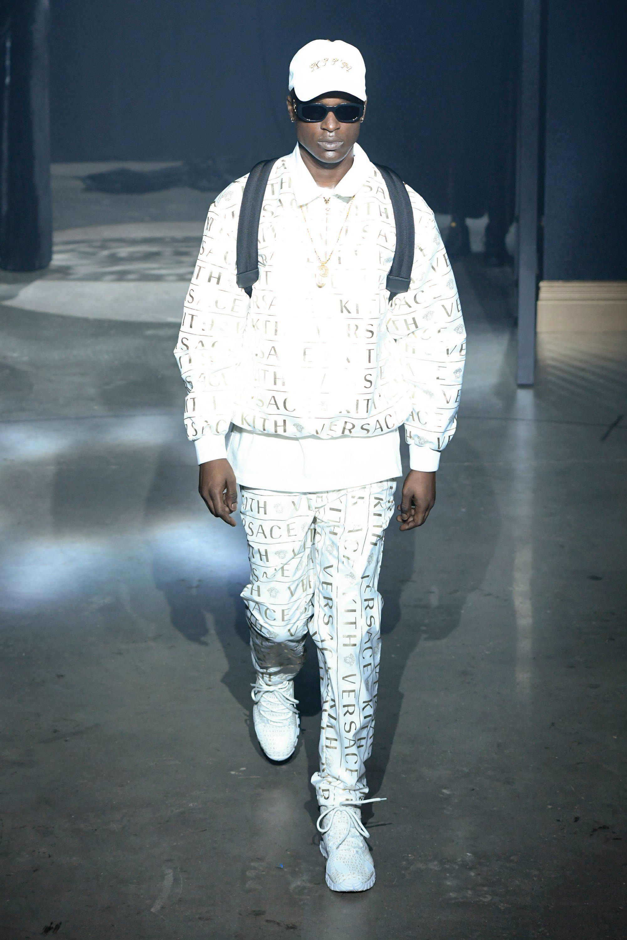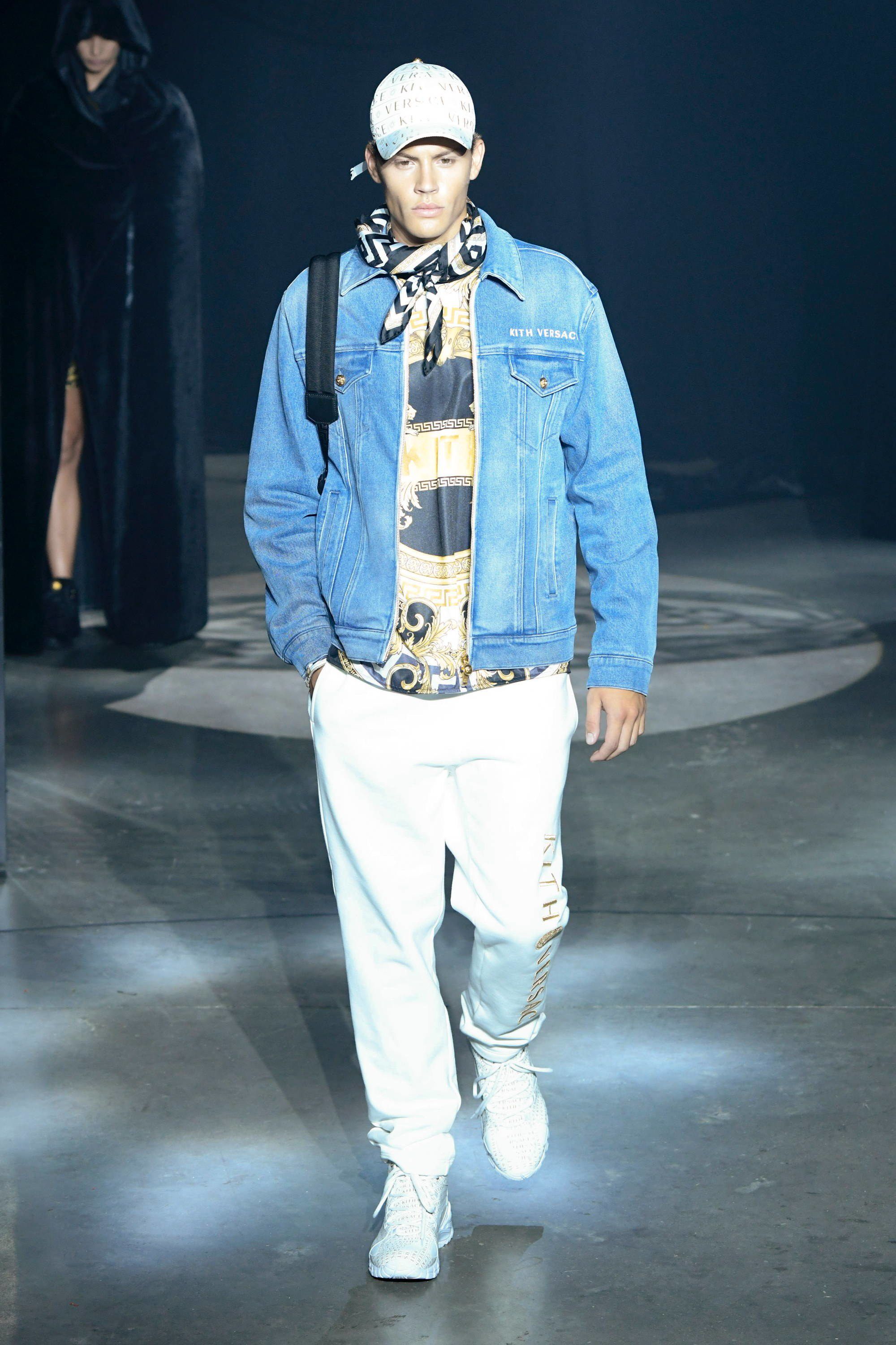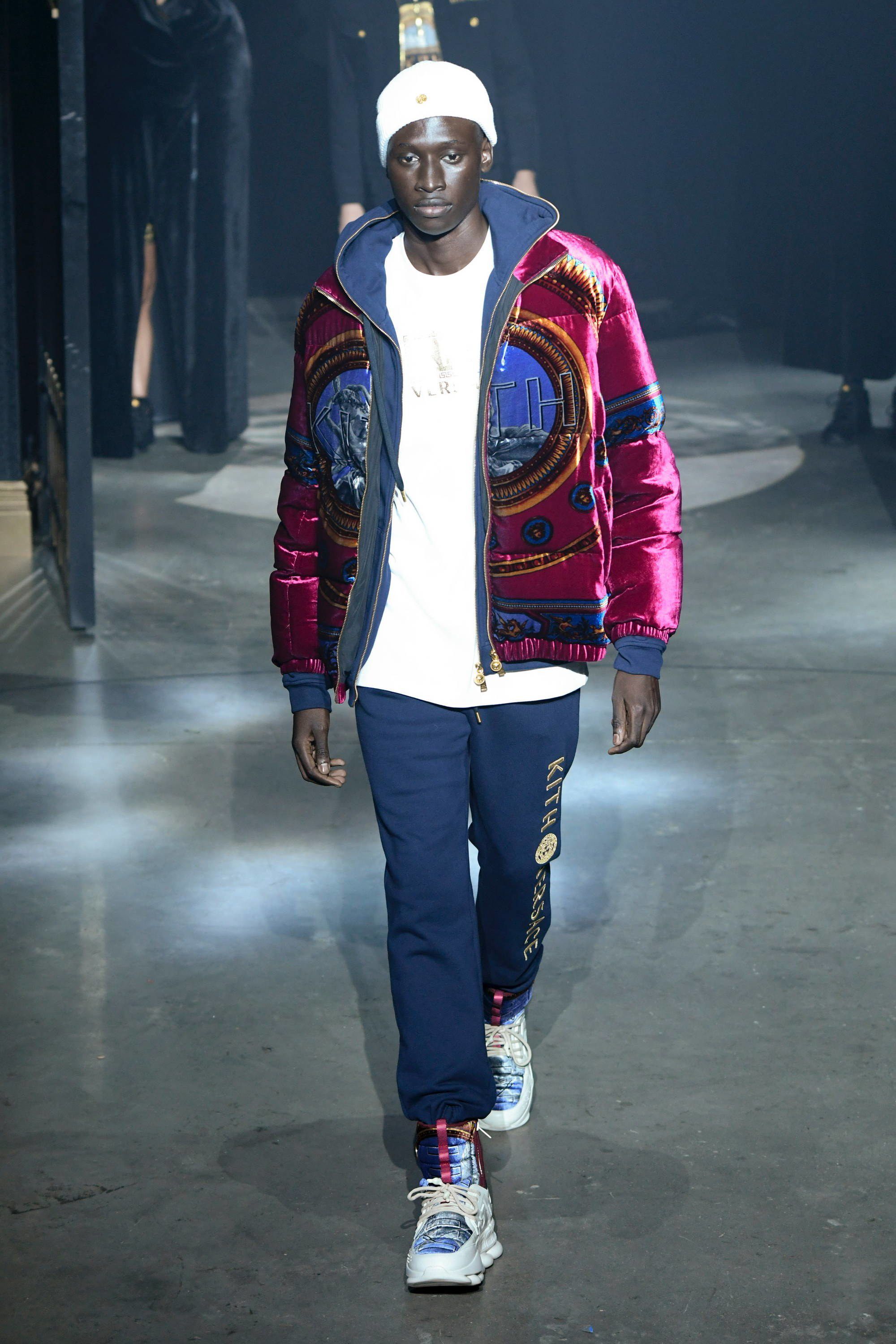 L’ultimo pezzo di questa mastodontica sfilata è la capsule con Versace. Apre la sezione dedicata alla maison italiana Bella Hadid in reggiseno, shorts da ciclista e piumino cropped, tutto dalla fantasia barocca, mentre chiude la portoghese Sara Sampaio con una variante dello stesso look. Nel mezzo si alternano Lucky Blue Smith e gli altri modelli con blazer grafici, bomber di velluto trapuntati, una giacca da allenatore in pelliccia sintetica decorata con il logo Versace, magliette con scintillanti disegni dorati e la camicia in seta con motivi geometrici.