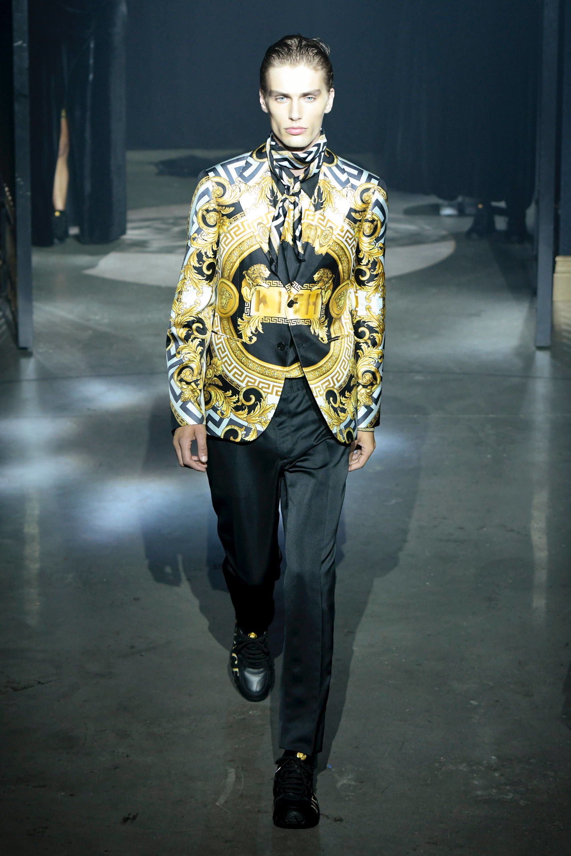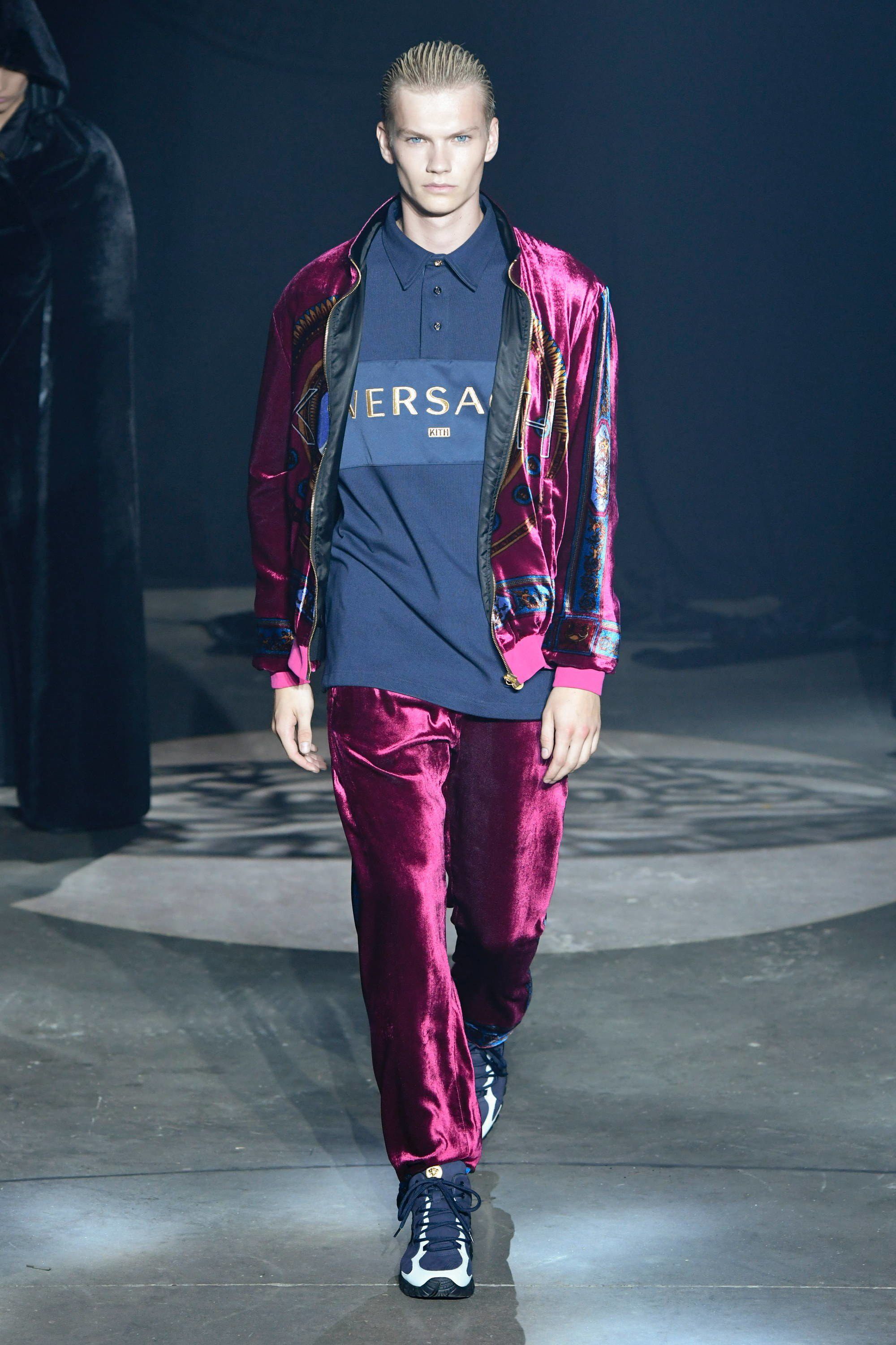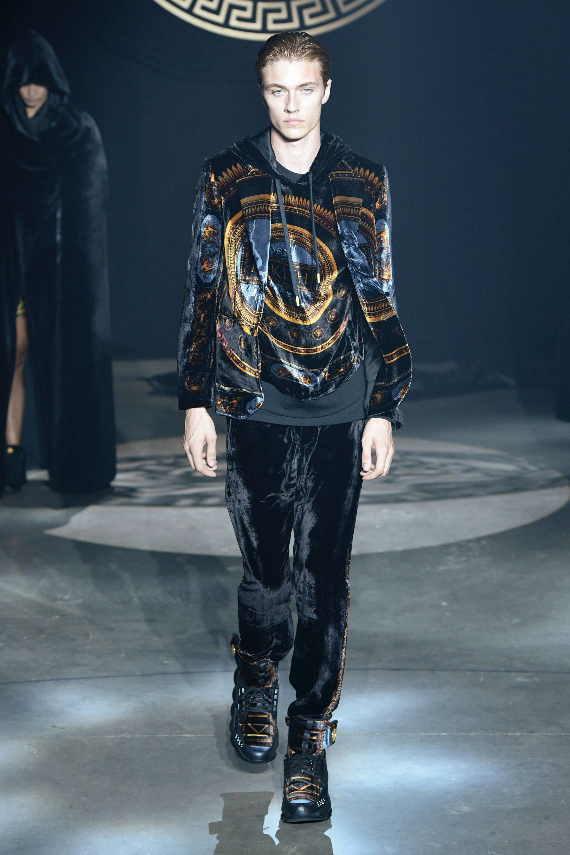 L’ultimo pezzo di questa mastodontica sfilata è la capsule con Versace. Apre la sezione dedicata alla maison italiana Bella Hadid in reggiseno, shorts da ciclista e piumino cropped, tutto dalla fantasia barocca, mentre chiude la portoghese Sara Sampaio con una variante dello stesso look. Nel mezzo si alternano Lucky Blue Smith e gli altri modelli con blazer grafici, bomber di velluto trapuntati, una giacca da allenatore in pelliccia sintetica decorata con il logo Versace, magliette con scintillanti disegni dorati e la camicia in seta con motivi geometrici.