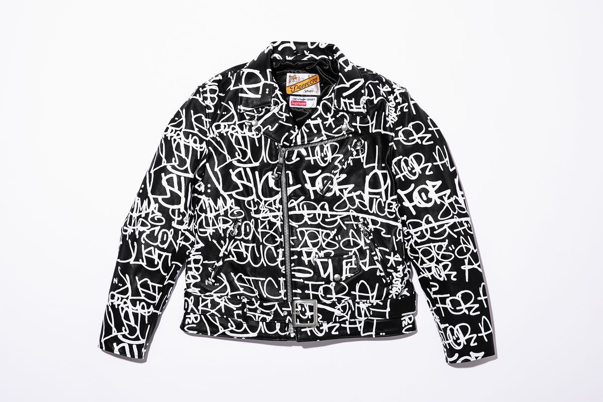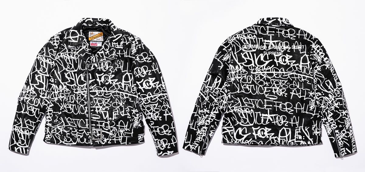 I due partner presentano una proposta easy e cool, fatta di pochi pezzi chiave nelle tonalità nero, bianco, rosso, beige e blu, come le felpe con cappuccio e le t-shirt con il box logo “spezzato”. Dalle prime immagini diffuse dal brand newyorkese possiamo notare un custom Schott Perfecto leather jacket, caratterizzato da una testo stampato in bianco all over, un'opera d'arte originale di Earsnot IRAK; camicie e maglioni in cotone; un soprabito in misto lana; cotton-canvas chore coat; skate e painter pants. Completa l’offerta una speciale Nike Air Force 1 Low realizzata in bianco e nero con lo Swoosh diviso sul lato della scarpa, mentre sul retro possiamo leggere Nike Air e i brand COMME des GARÇONS e Supreme scritti sotto.