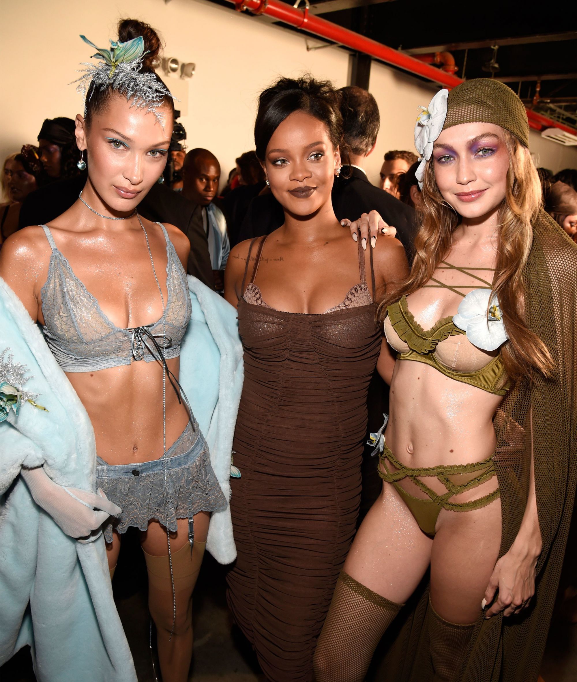 Non un semplice show, ma una vera e propria celebrazione del corpo femminile e della sorellanza, ricreata attraverso una delicata e commovente coreografia. Rihanna continua a diffondere la sua filosofia di bellezza come sinonimo di inclusività e diversità, portando in una passerella trasformata in un Eden fatto di natura selvaggia, fiori e piramidi ricoperte di vegetazione un cast di di modelle dai corpi di tutte le età, forme, taglie, colori. C’erano la curvilinea Paloma Eissner, le top Gigi e Bella Hadid, Joan Smalls e Slick Woods che ha sfilato con calze autoreggenti e un body cut out che metteva in mostra il pancione, incinta così come la ballerina Janina Thompson, ma anche tante altre ragazze: magrissime, con la cellulite, cicatrici, muscolose, basse, alte, nere, pallide, rasate o coi capelli lunghi. Poi alla fine è arrivata lei, Riri, bellissima con mini-abito aderente è entrata sulle note di Love Me Tender, un classico di Elvis cantato da Nicolas Cage, è la sfilata è diventata anche una risposta a tutti gli haters che da mesi la accusano di essere ingrassata.