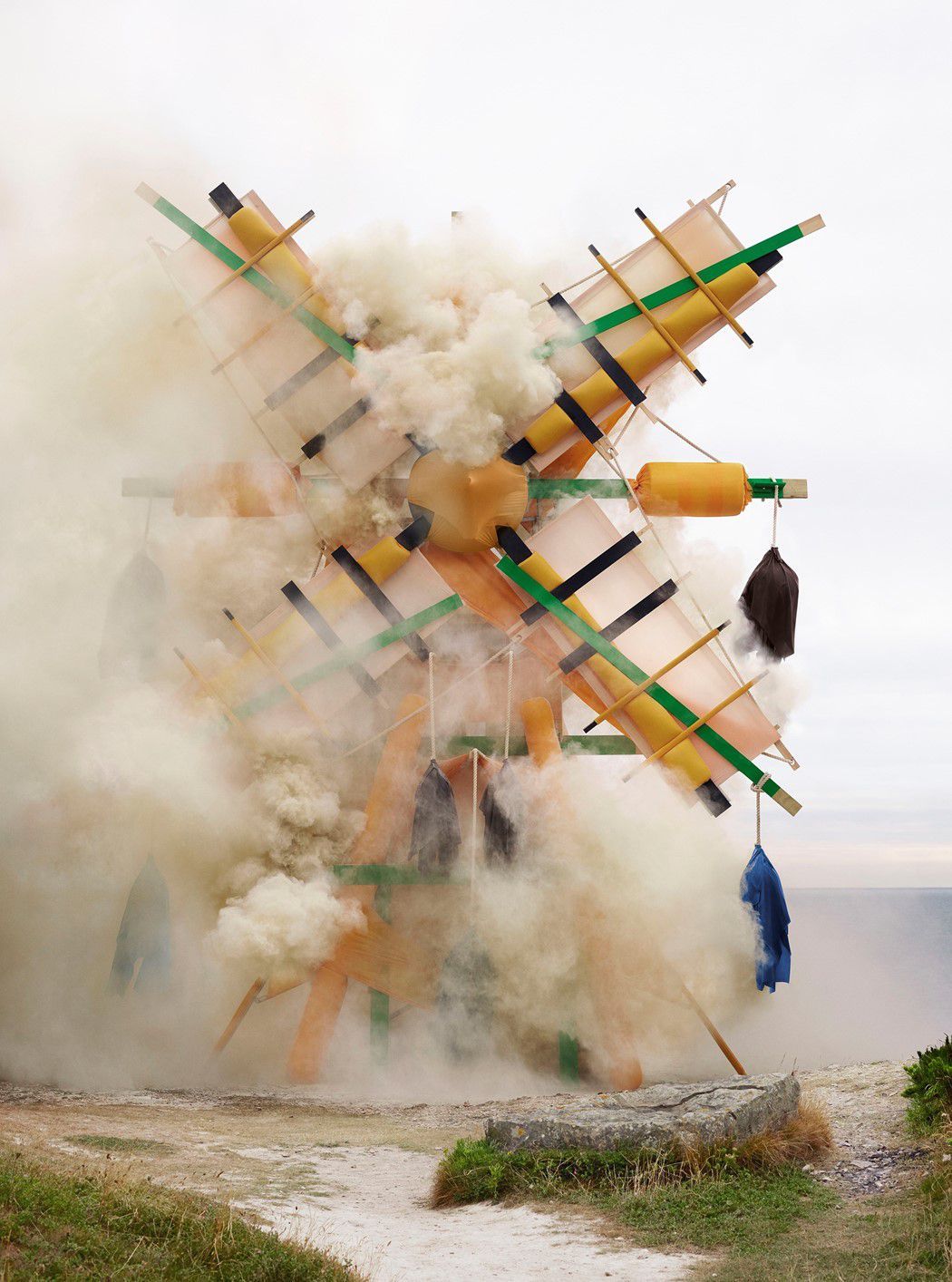 Le immagini, quasi delle evocative cartoline d’antan realizzate nel corso di quattro giorni, hanno sfondi diversi a seconda del momento in cui sono state scattate. Prima appaiono nella loro forma pulita, poi inondate di fumo, a dimostrare la loro natura delicata, ma deperibile, la stessa incanalata dal materiale principale delle ultime creazioni di Green, il lattice, un tipo di materiale futuristico che, però, marcisce col passare del tempo.
