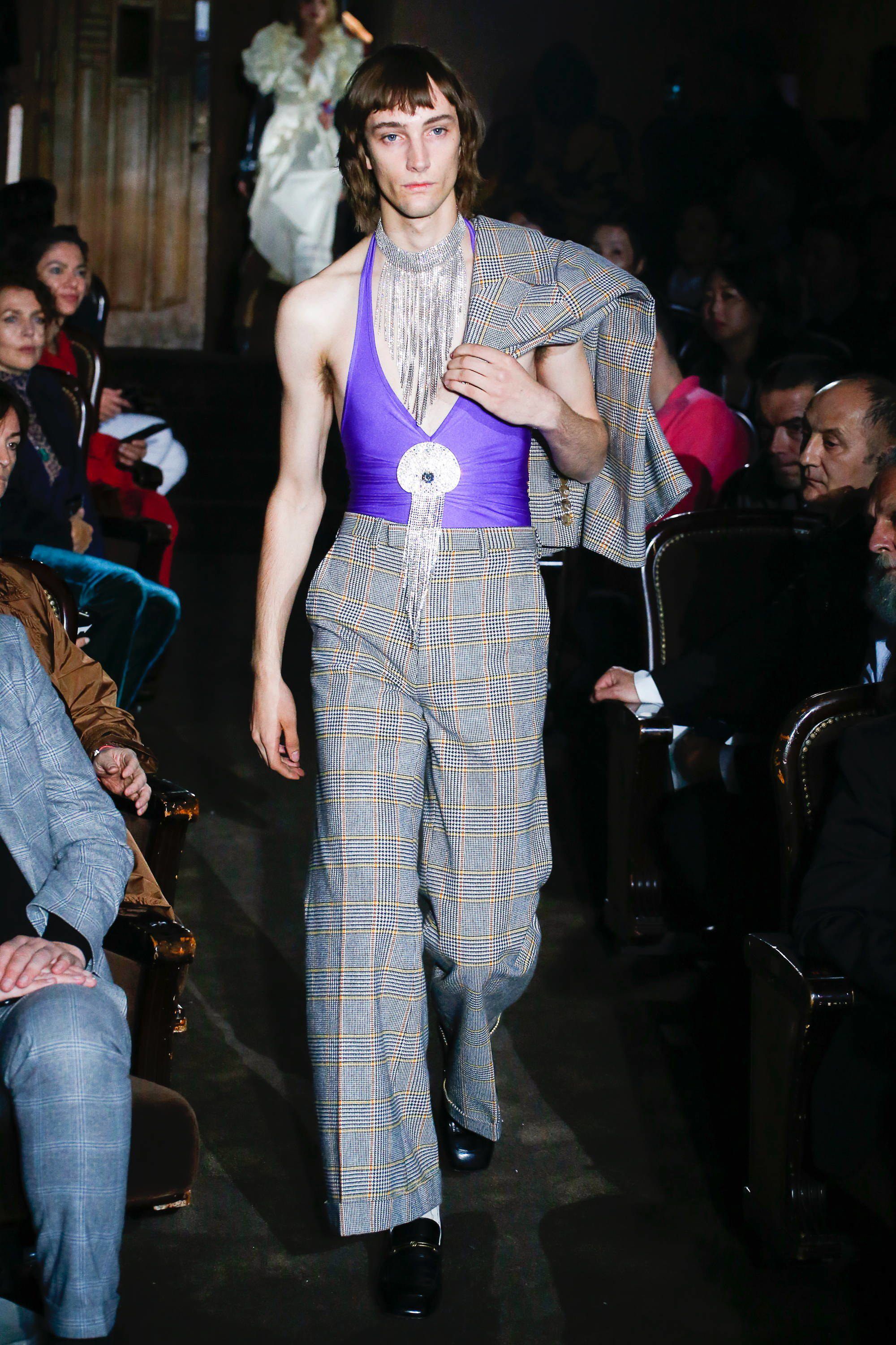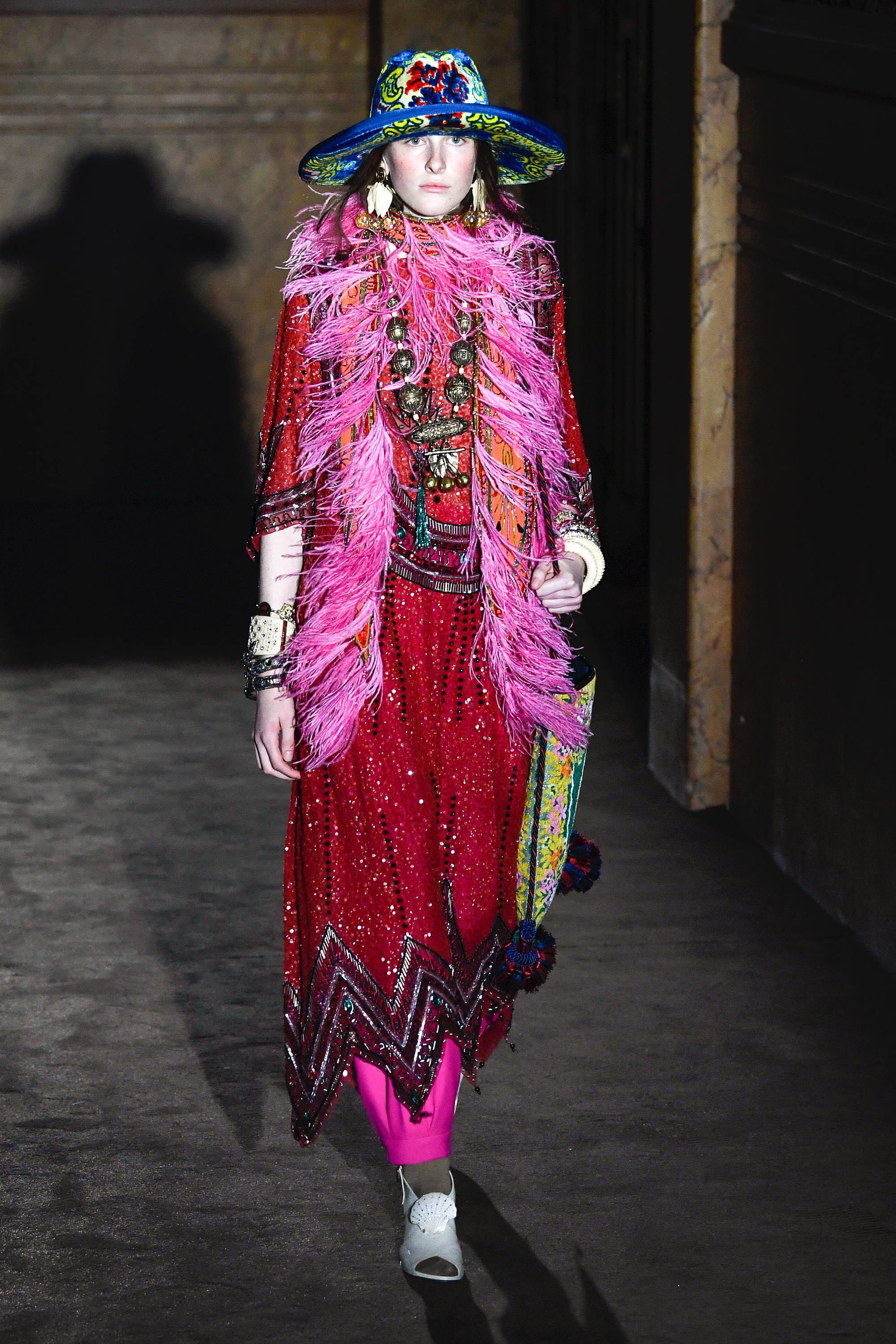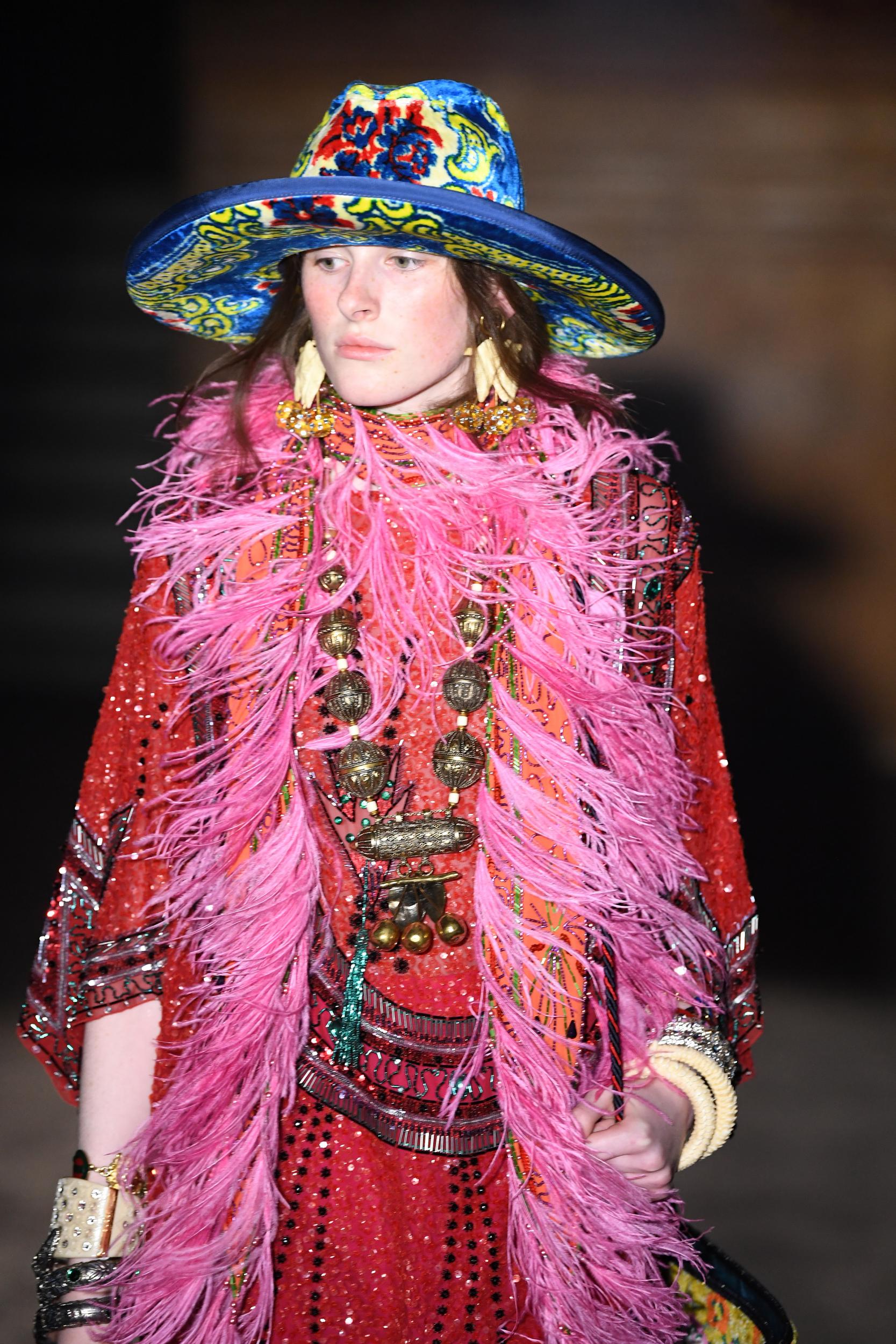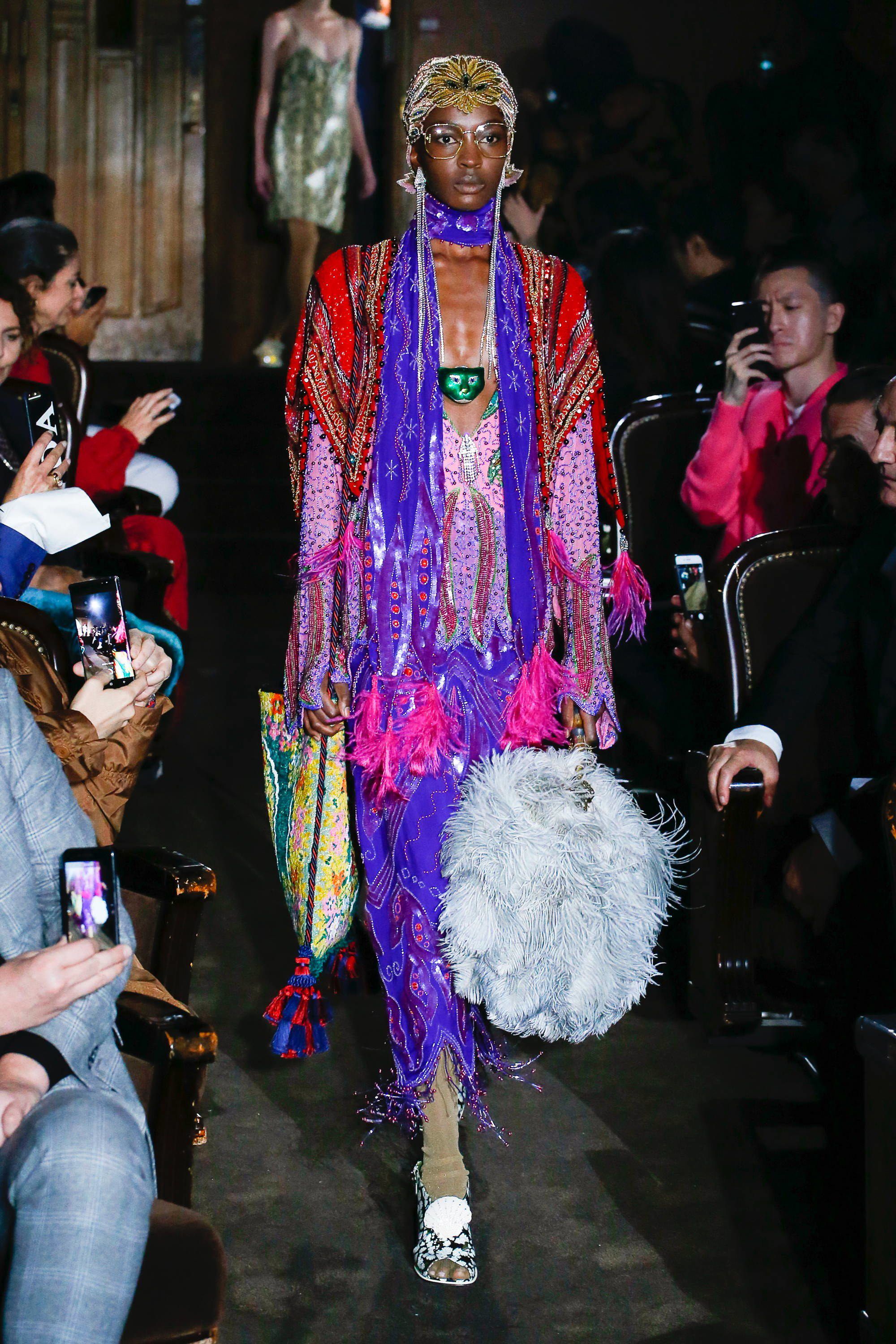 Torna Gucci e torna l’estetica schizofrenica, stratificata, fatta di mille ispirazioni e rimandi, di Alessandro Michele. Per la SS19 il designer romano continua a declinare il suo universo onirico, tra omaggi alle icone della musica, da Janis Joplin a David Bowie, ma anche a Dolly Parton ritratta su maglie e gilet in denim; borse a forma di Mickey Mouse; party-girl del passato come Josephine Baker; ispirazioni anni ’60 e ’70 e molto altro ancora. Come al solito, la nuova collezione è fatto di mille dettagli, opulenti, ridondanti, iconici. Ovunque si posi lo sguardo è un moltiplicarsi di rouches, maniche ampie, cristalli, frange, lurex, stampe, abiti plissettati, pantaloni a zampa, maxi collane, occhiali da sole extra-large, cappelli. Il dettaglio destinato a diventare un trend? Lo smalto applicato solo su alcune unghie. Il dettaglio più strano? L’astuccio penico, cioè una conchiglia usata in passato sopra le calzamaglia da uomo per coprire le parti intime, ma anche pappagalli appollaiati sulle spalle dei modelli. Come per magia, un incantesimo di cui solo Michele e pochi altri conoscono la formula, tutto il kitsch potenziale diventa armonia, bellezza.