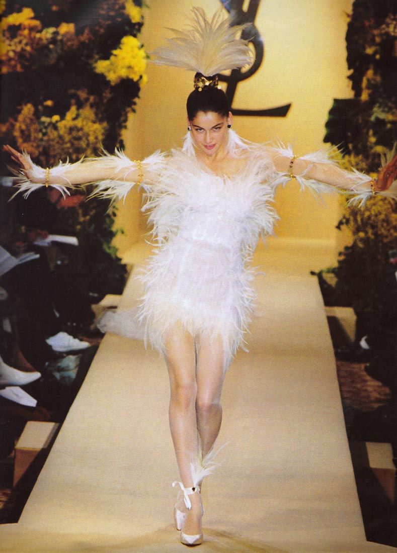 Nel 1965 Yves utilizza per la prima volta le piume come dettaglio di un abito, un materiale che andrà poi a ricoprire interi abiti haute couture: celeberrimo il look indossato da Laetitia Casta nel 2000 con mini abiti bianco interamente in piume, con copricapo e stiletti piumati. Per questa stagione le piume tornano a decorare i bordi di reggiseni, abiti e pantaloni glitter.