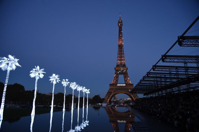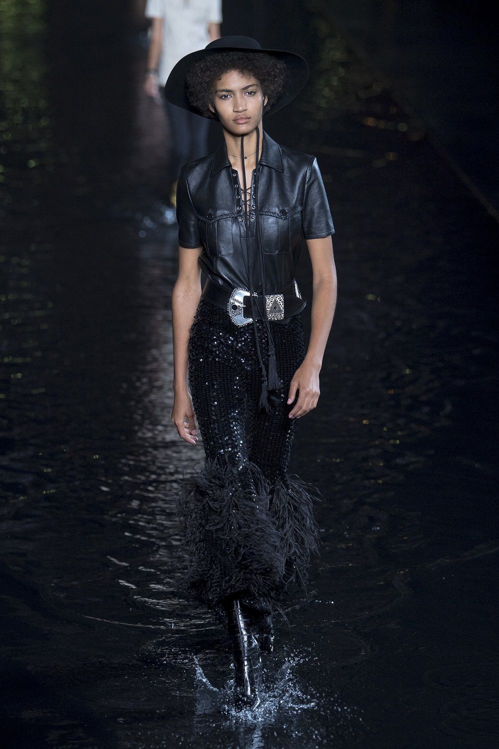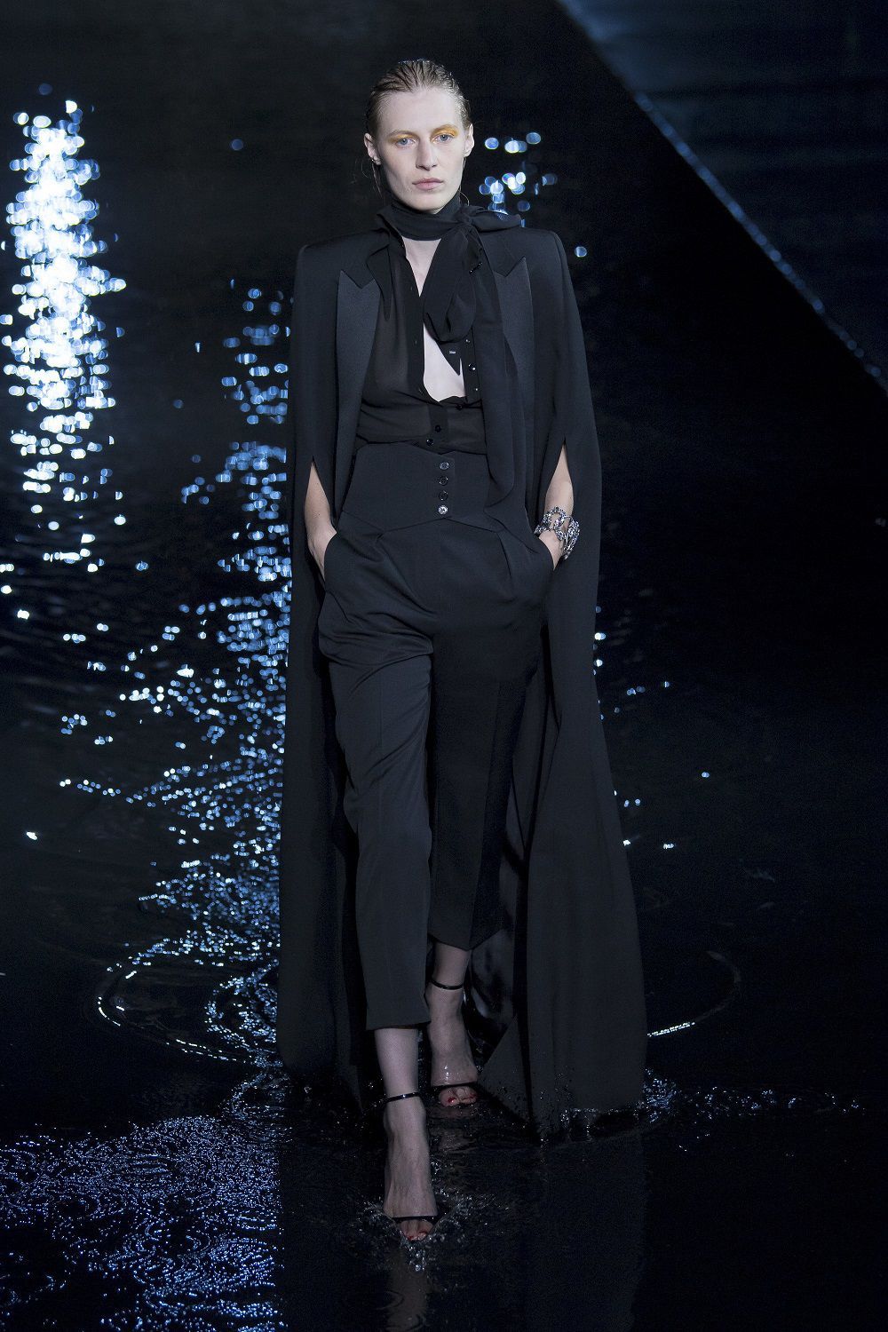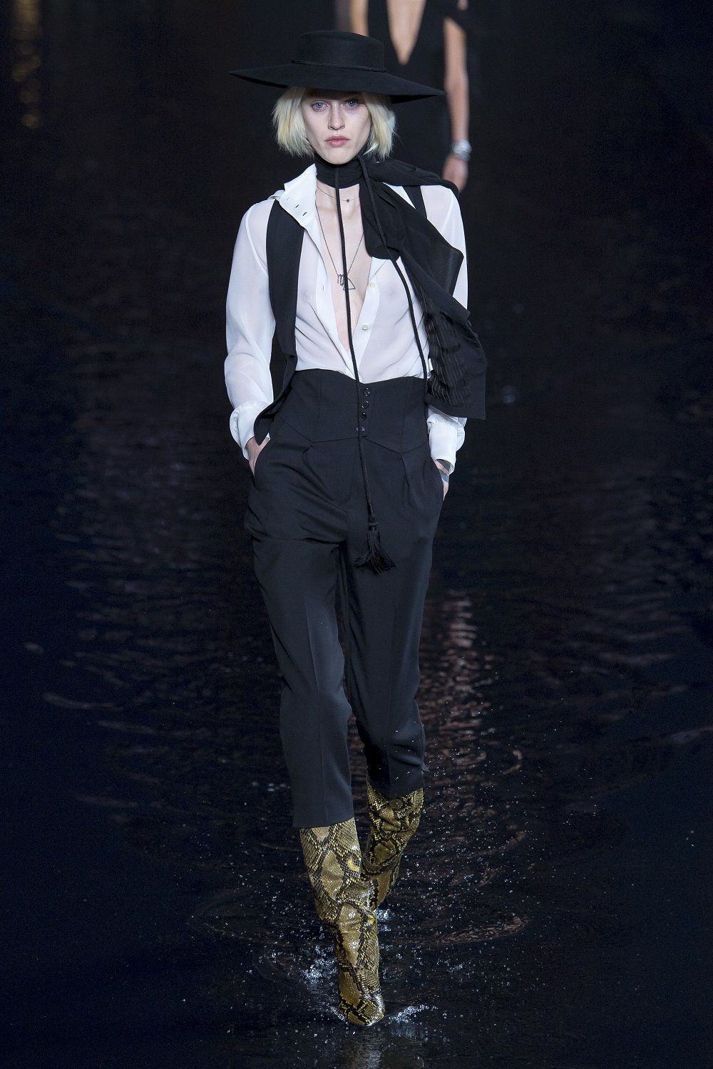 Fin dal setting della sfilata era chiaro il riferimento a YSL. Ai piedi della torre simbolo di Parigi, infatti, Vaccarello ha fatto costruire una passerella-piscina (in cui le modelle camminavano senza timore di rovinare scarpe o bagnare gli abiti) al cui lato era posta una lunga fila di palme. Un dettaglio che richiama Marrakech, la città preferita di Yves, in cui aveva una magnifica seconda casa con un giardino rigoglioso, ricco anche di palme.