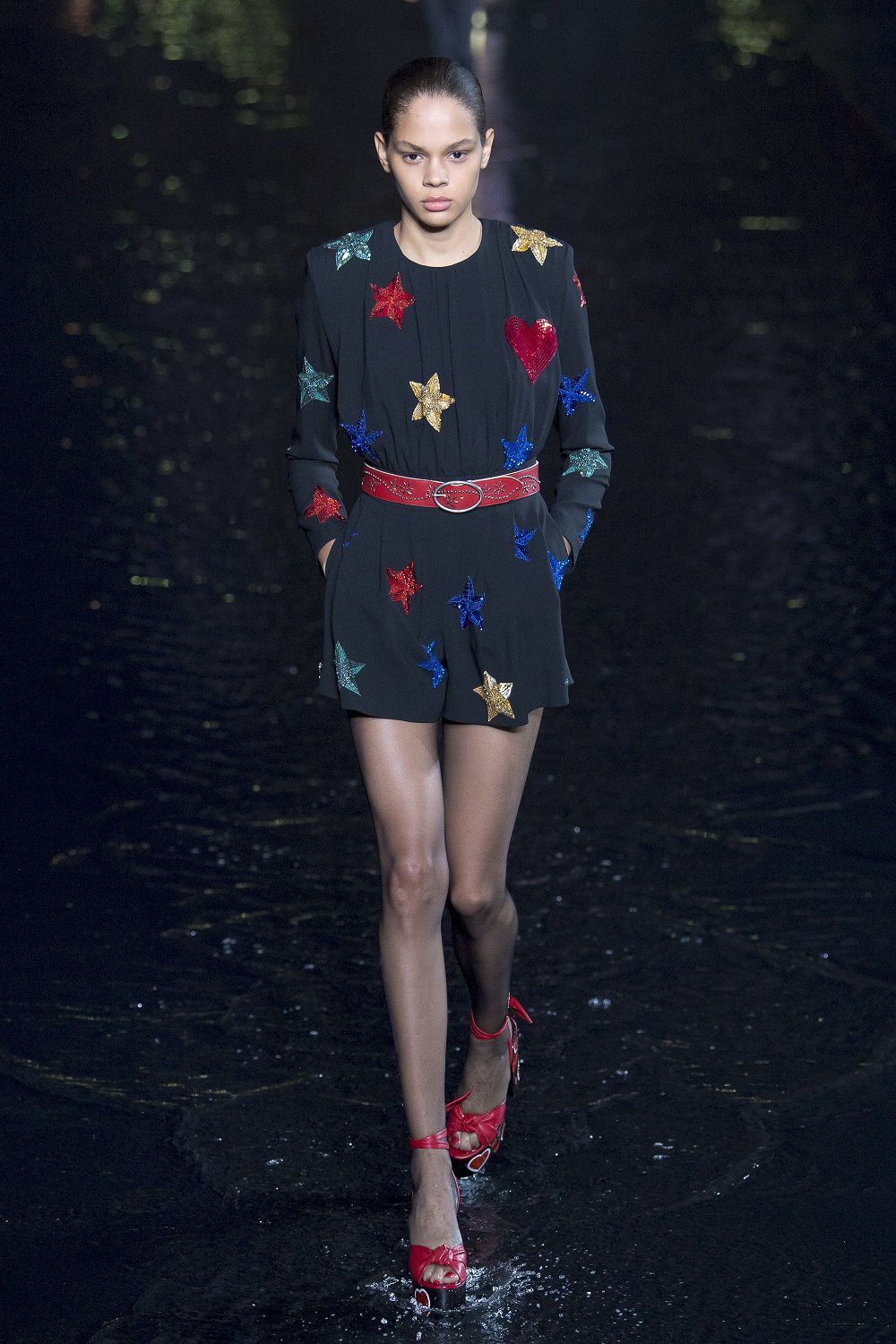 Yves Saint Laurent era solito mandare ad amici e parenti le famose Love Postcards, delle cartoline di auguri per festeggiare l'inizio del nuovo anno, usanza che ha portato avanti per più di trent'anni. Le postcards erano decorate con disegni e scritte colorate e dettagli come cuori e stelle. Vaccarello riutilizza proprio le stelle che vanno ora a ricoprire miniabiti in suede, tutine nere e lunghi abiti di chiffon.