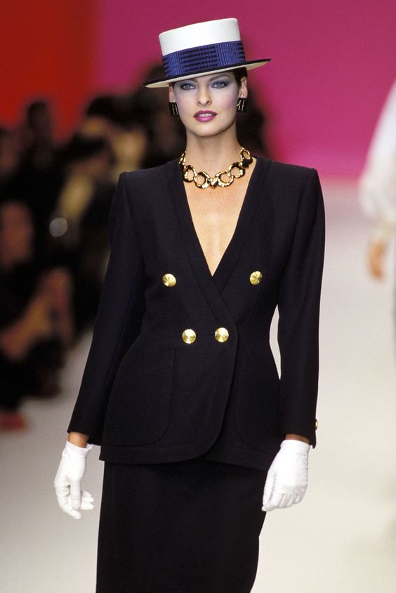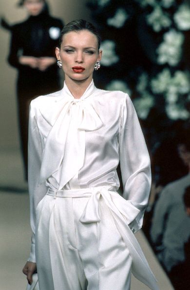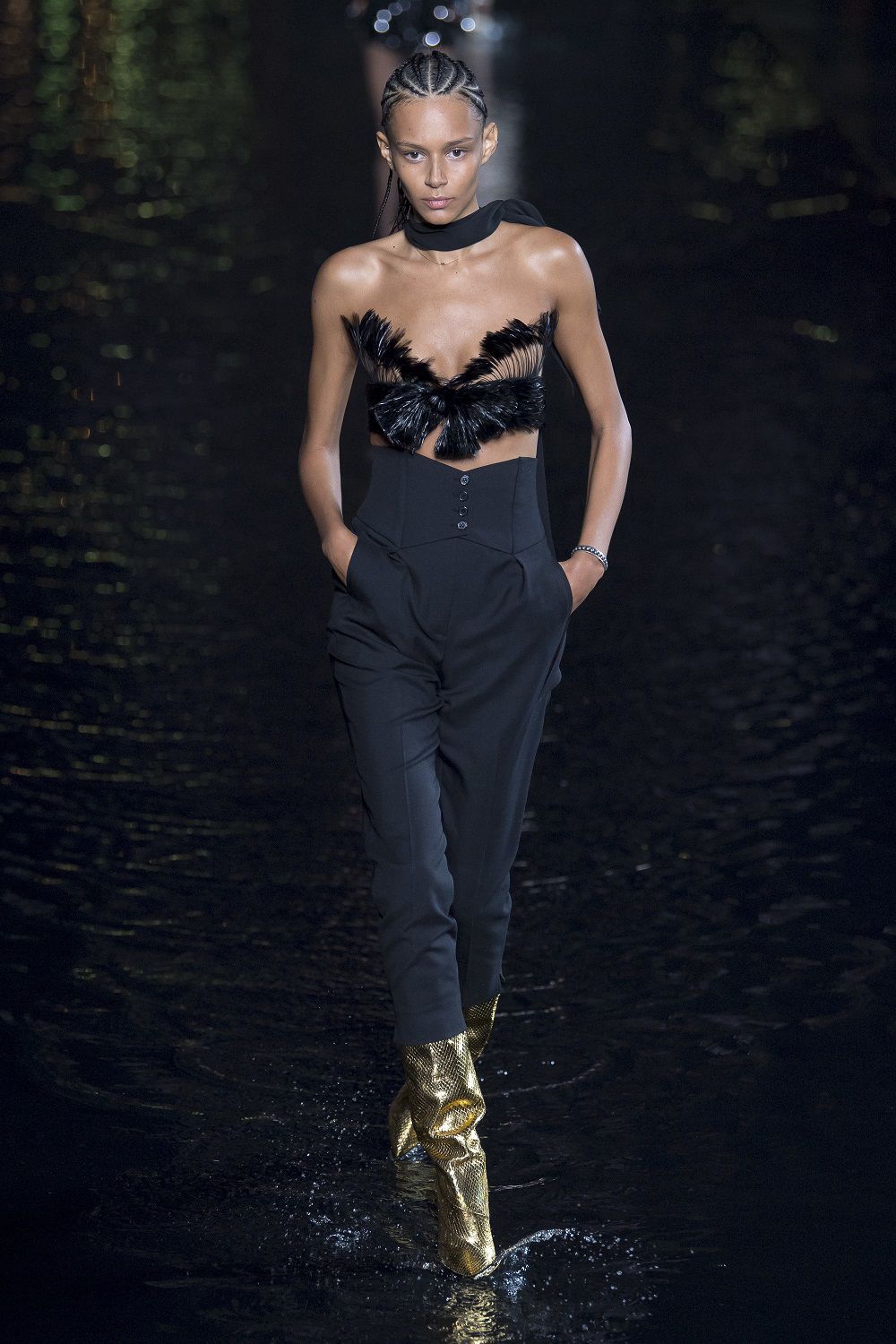 Una delle muse di Yves, Naomi Campbell, era scesa in passerella nel 1999 indossando pantaloni gessati e una giacca di pelle sotto la quale spuntava un reggiseno nero con dettagli in pizzo e con chiusura a fiocco in raso nero. La modella Binx Wilton, invece, ieri sera indossava pantaloni neri a vita alta abbinato ad un reggiseno sempre con chiusura a fiocco, questa volta con trasparenze e dettagli in piume.