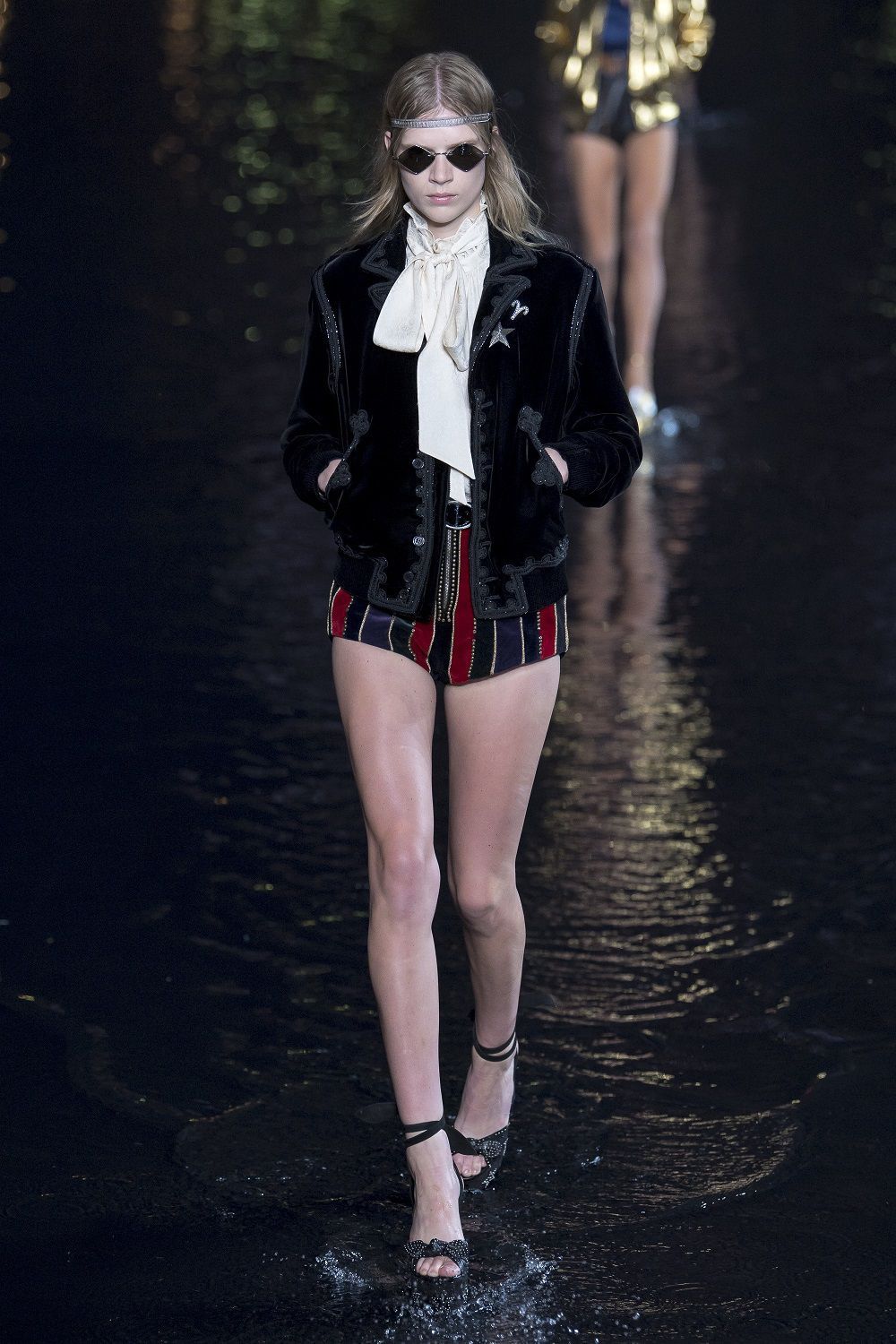 Le cinture di Yves Saint Laurent andavano a stringere la vita di giacche ed abiti, ad evidenziare le forme della figura femminile, solitamente alte e con chiusura quadrata. Per la SS19 Vaccarello le mantiene alte, però in pelle nera con maxi fibbia argento, per poi renderle di nuovo sottili, con chiusura ovale, in pelle o suede, a decorare shorts, miniabiti e pantaloni.