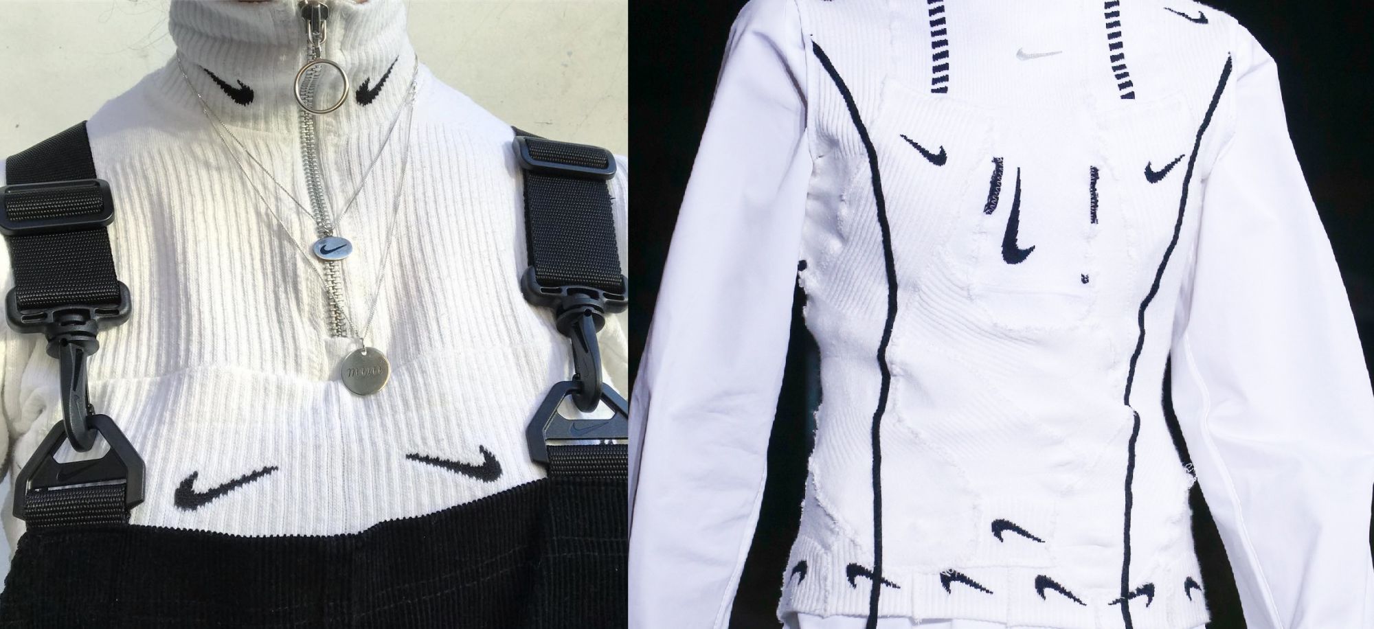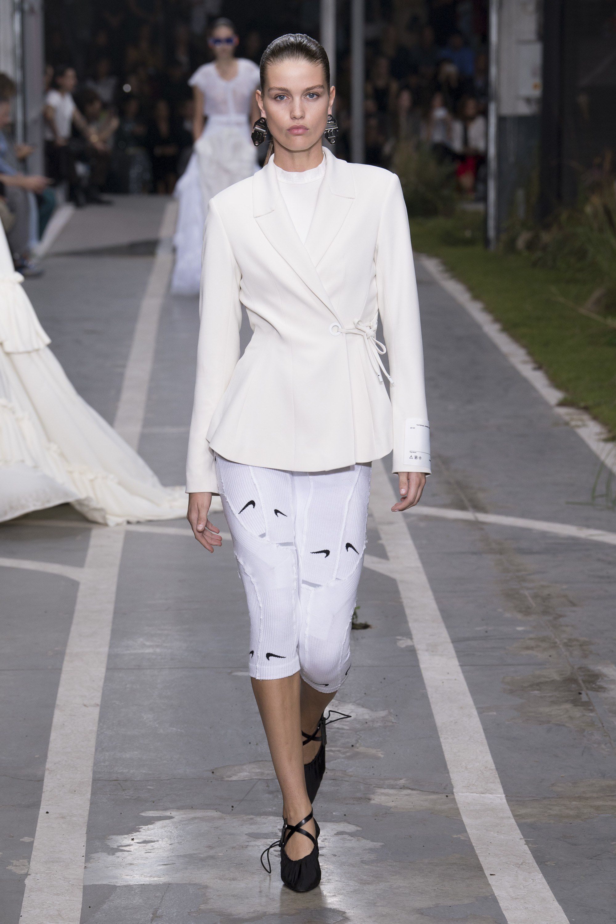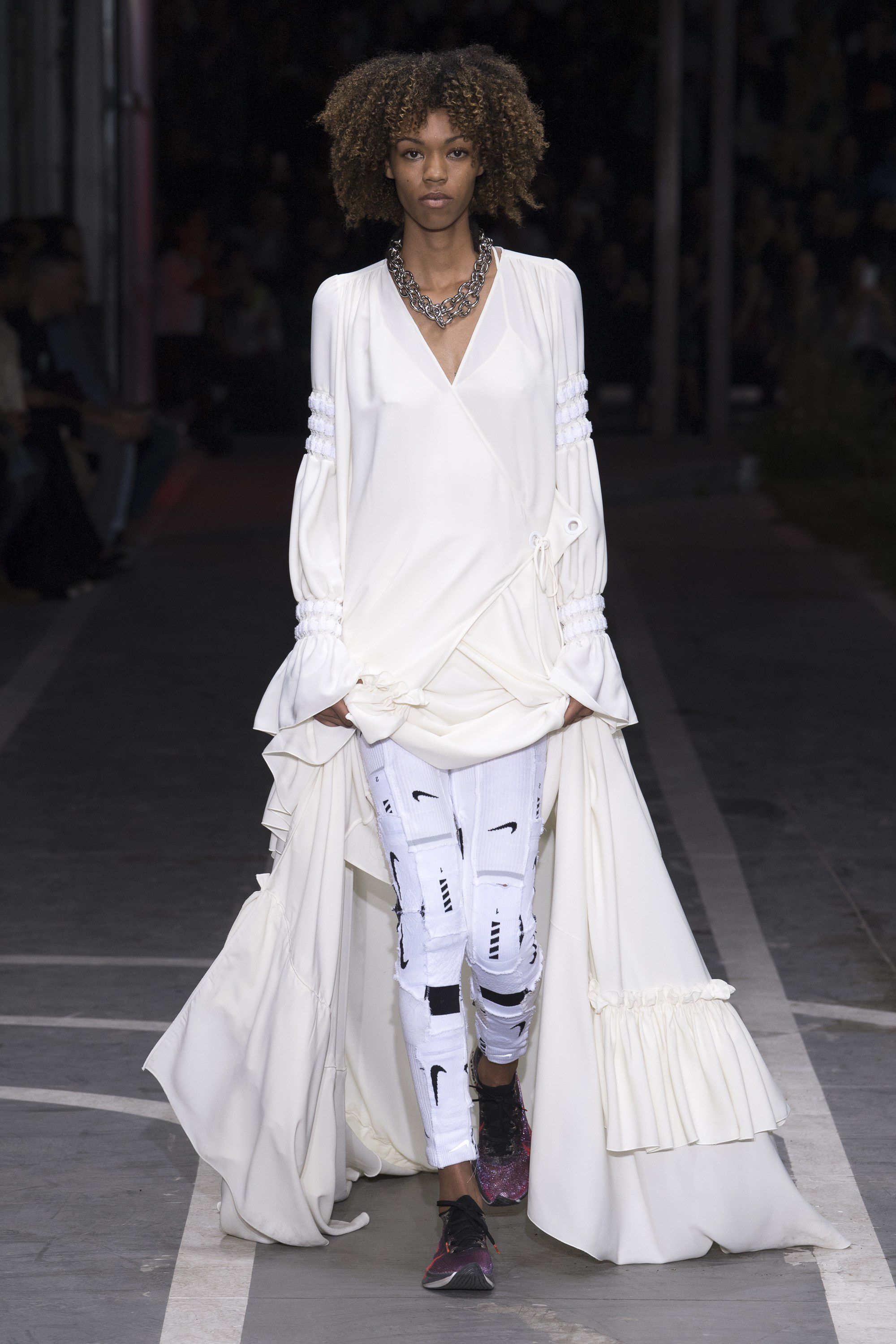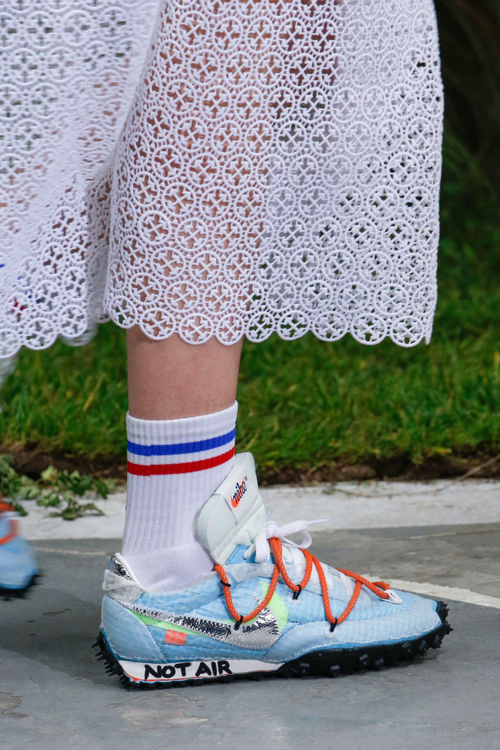 Tutti i 48 look della collezione erano costantemente in bilico tra lo sportswear più puro e l’idea di una moda veramente indossabile. Si passava da eteree camicie trasparenti abbinate a pantaloni sartoriali, a veri e propri leggings da corsa coordinati con blazer bianchi, giacca e shorts in pizzo San Gallo hanno sfilato prima di vere e propri bodysuit da corsa. Abloh sembra aver seguito la lezione di Margiela, il primo ad utilizzare calzini per realizzare capi di maglieria: Kaia Gerber, infatti, ha sfilato con un top costituito da diversi calzini Nike cuciti insieme, operazione ripetuta poi anche per i pantaloni. Non si può non notare, però, la somiglianza tra questo top e quello realizzato da Mini Swoosh, maestra nel sovrapporre tessuti e Swoosh diversi, postato sul suo Instagram mesi fa.