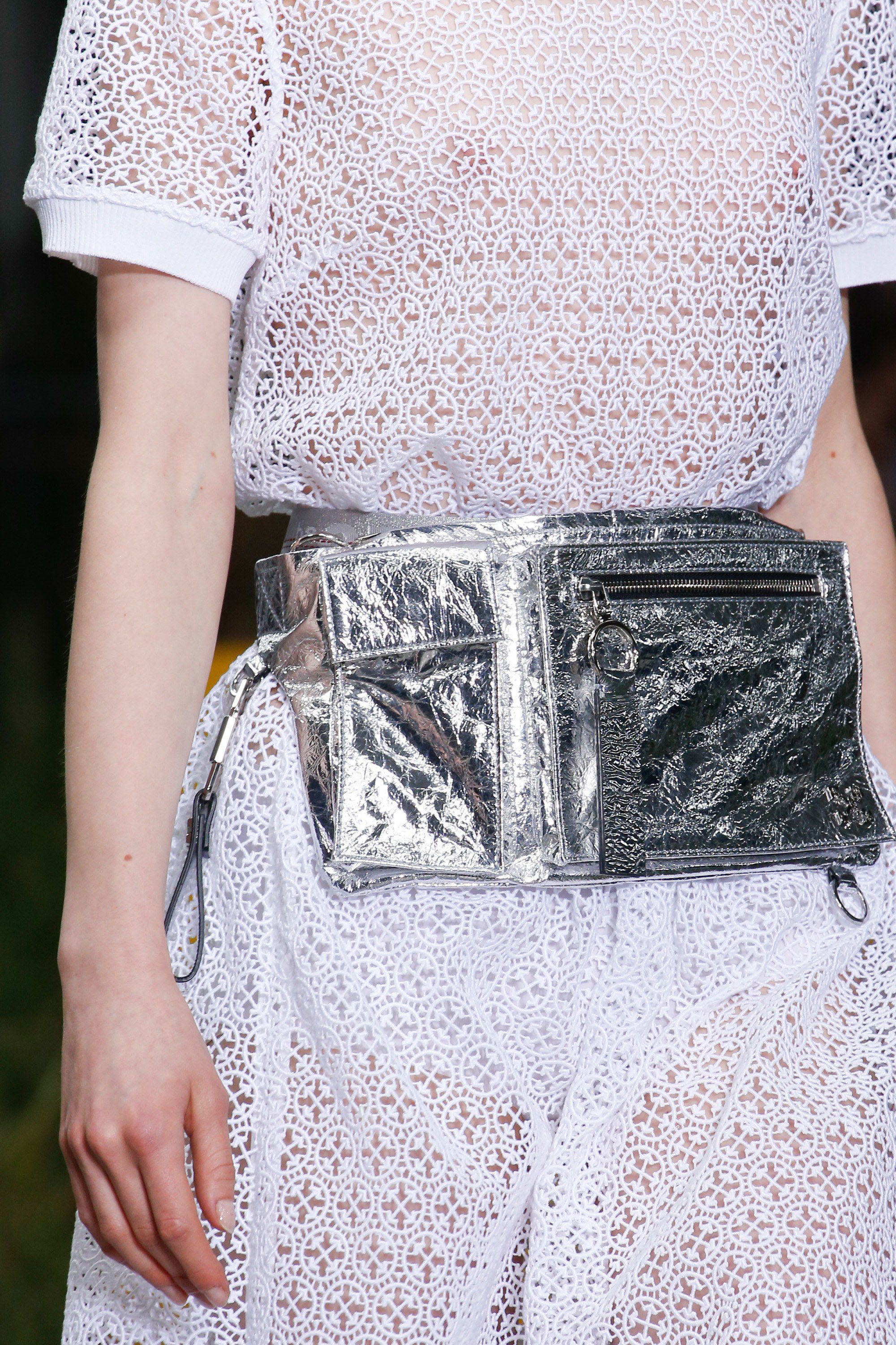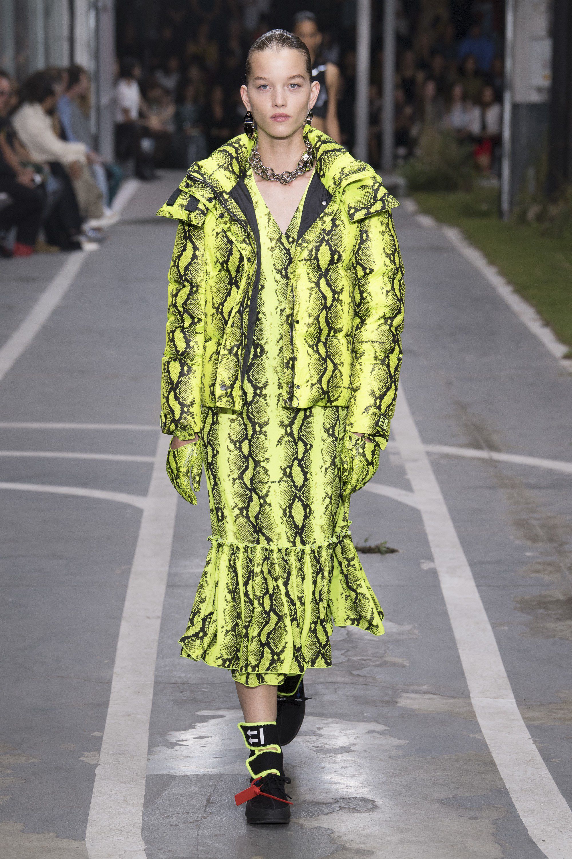 Probabilmente il vero pezzo forte sono stati gli accessori. Innanzitutto i guantini sempre a stampa rettile, poi gli orecchini che sono delle piccole fibbie, i marsupi iridiscenti e quelli mini legati intorno alla coscia. L’attenzione maggiore, ovviamente, era riservata alle scarpe. Oltre alle Zoom Fly, classiche scarpe da corsa rivisitata in chiave Off-White, Abloh ha dato vita alle nuove sneaker “Waffle Racer”: il designer voleva espressamente una scarpa che sembrasse ancora un prototipo, cucita a mano con pezzi di materiali diversi. La sneaker, inoltre, in base all’usura dei tacchetti sulla suola rivela la distanza percorsa, 10 miglia il primo livello di tacchetti, 30 il successivo e 75 per finire. Virgil si è misurato anche con le scarpe col tacco, stiletto con infradito, stringhe (le famose Shoelaces), sempre con la Red Tag.