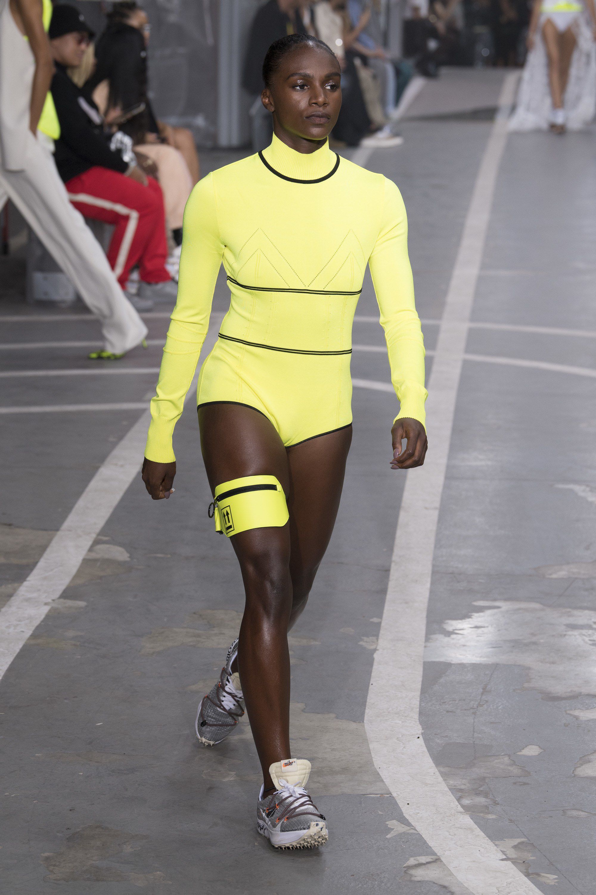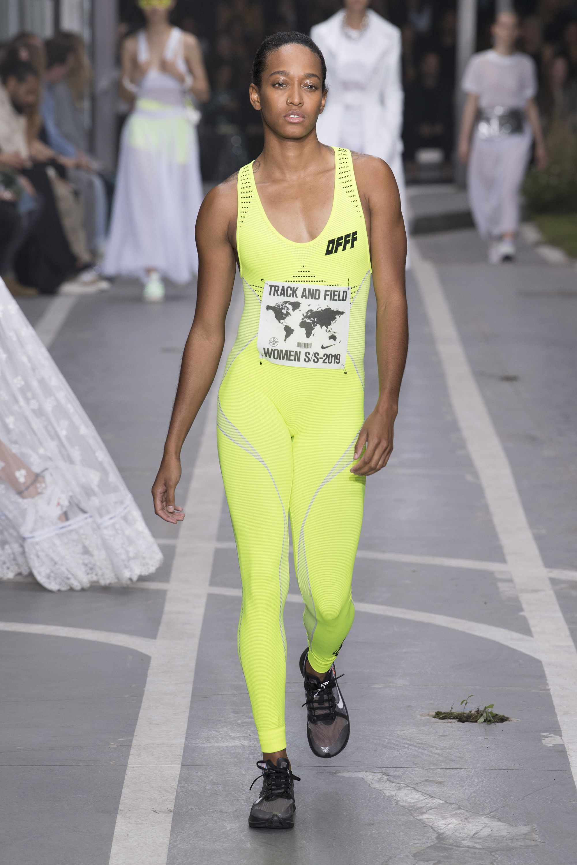 Come ha raccontato lo stesso Virgil l’idea alla base della collezione era quella di “celebrare tutte le donne che corrono”, e per farlo il designer ha scelto un cast di modelle di eccezione. Oltre alle top fedelissime Bella Hadid e Kendall Jenner che hanno aperto la sfilata, e Kaia Gerber, Karlie Kloss, Jourdan Dunn e una rediviva Bianca Balti (ufficialmente ritiratasi dalle passerelle), Abloh ha arruolato infatti vere e proprie atlete Nike, otto medagliate olimpiche, come la sprinter inglese Dina Asher-Smith, la campionessa colombiana di salto triplo Caterine Ibarguen o la eptatleta inglese Katarina Johnson-Thompson. Abloh ha voluto in qualche modo omaggiare anche l’amica e tennista più forte del mondo, Serena Williams, realizzando un abito con top in tessuto tecnico e un’ampia gonna asimmetrica in tulle, una sorta di rivisitazione in chiave haute couture della divisa indossata dalla Williams durante gli ultimi US Open.
