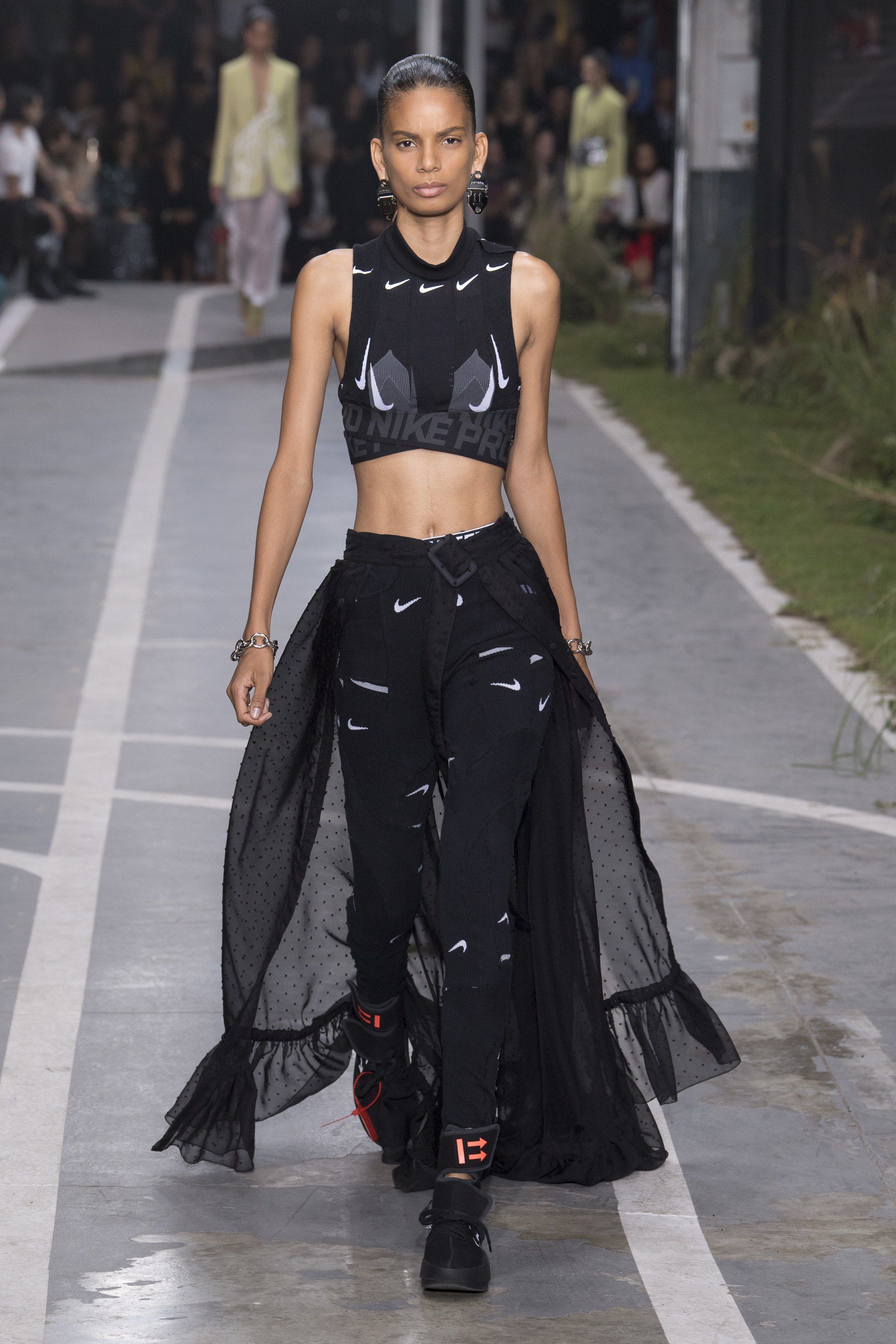 Lo show si è aperto con una serie di look total white, che variavano sempre in materiali, trame e sfumature, per poi passare al nero, utilizzato per i capi più prettamente da corsa (firmati Nike Pro) così come su coordinati pantaloni e vest con maxi logo colorato; dopo le sfumature grigie del denim, è arrivato il giallo fluo, che sul finale si è trasformato in una stampa rettile con venature nere, che decorava giacche, abiti midi, lunghe camicie, minigonne, pantaloni oversize, per poi dare un tocco di colore al look finale, come inserto in un scenografico abito di tulle nero.