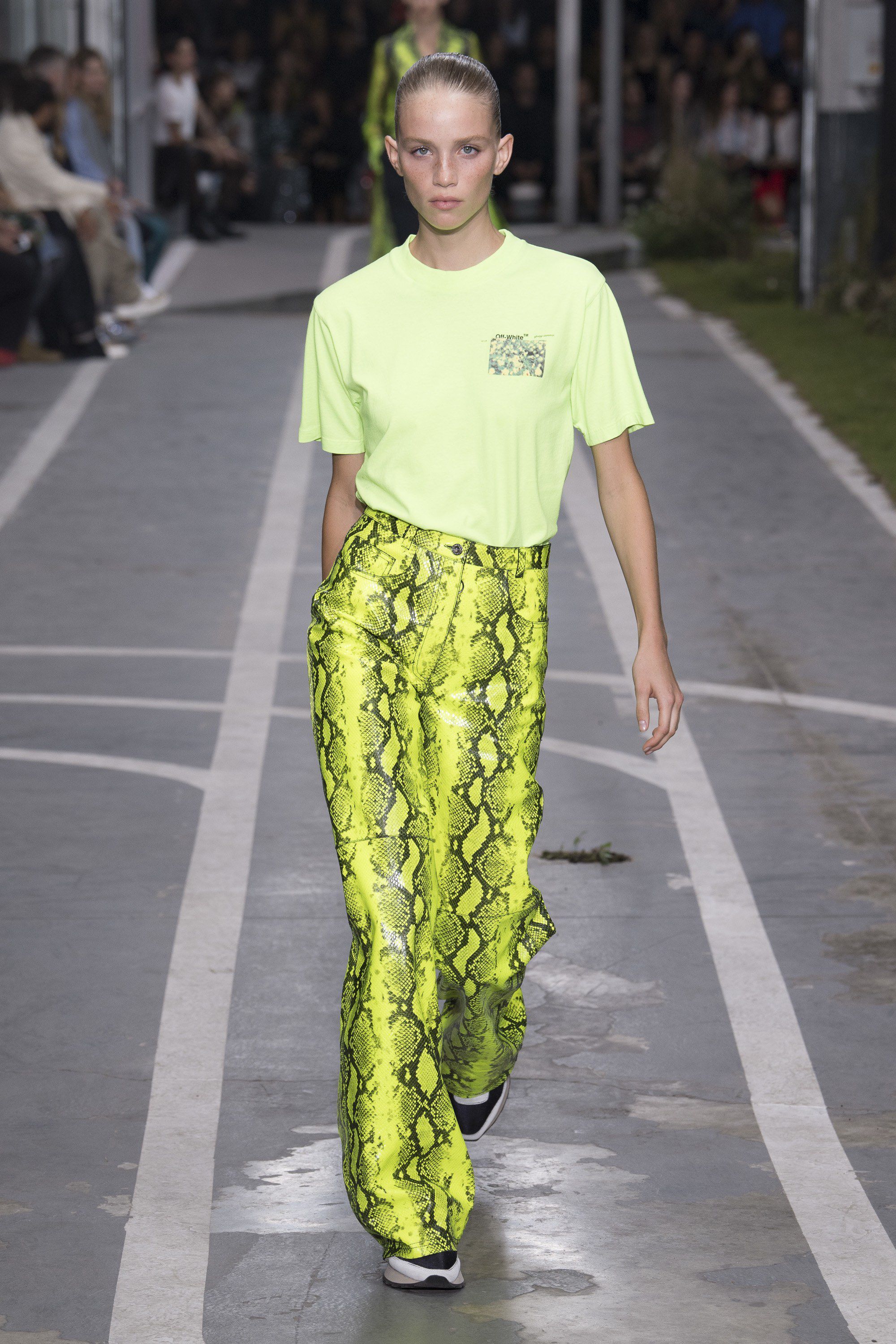 La sensazione, alla fine della sfilata, è che Off-White senza Nike non avrebbe molto senso di esistere, e che anzi, potrebbe essere addirittura considerato la linea luxury del gigante dello sportswear. I look più interessanti, infatti, erano quelli che giocavano maggiormente sul contrasto tra capi sportivi e capi più eleganti e adatti ad una sfilata, un’estetica che ha sempre fatto parte del DNA di Off-White, che ne ha fatto il suo simbolo e punto di forza, o come in questo caso, punto debole. Virgil non ha saputo rinnovarsi e ha portato in passerella trend già visti, dai marsupi alla stampa rettile ai colori fluo, mentre i capi più basic sono stati ravvivati dal classico logo o dalle scritte, che Virgil ama molto. Tutto l’hype che ruota intorno al mondo dello sportswear e più in generale l’attenzione che viene riservata a questo tipo di moda la dobbiamo in larga parte proprio a Virgil Abloh, che in tempi non sospetti aveva capito che il futuro della moda era lo sport. Gli anni però sono passati e lo sportswear è diventano il trend più dominante del decennio. Abloh sta cercando di far evolvere ulteriormente il concetto di abbigliamento tecnico, ma per questa stagione almeno i risultati non sono stati così innovativi o sconvolgenti, perché non basta più mettere uno Swoosh su una maglia o scrivere “LOGO” su un top per dire di aver fatto una collezione convincente.