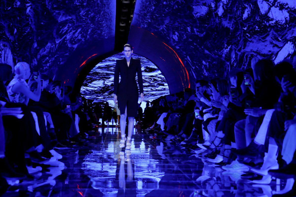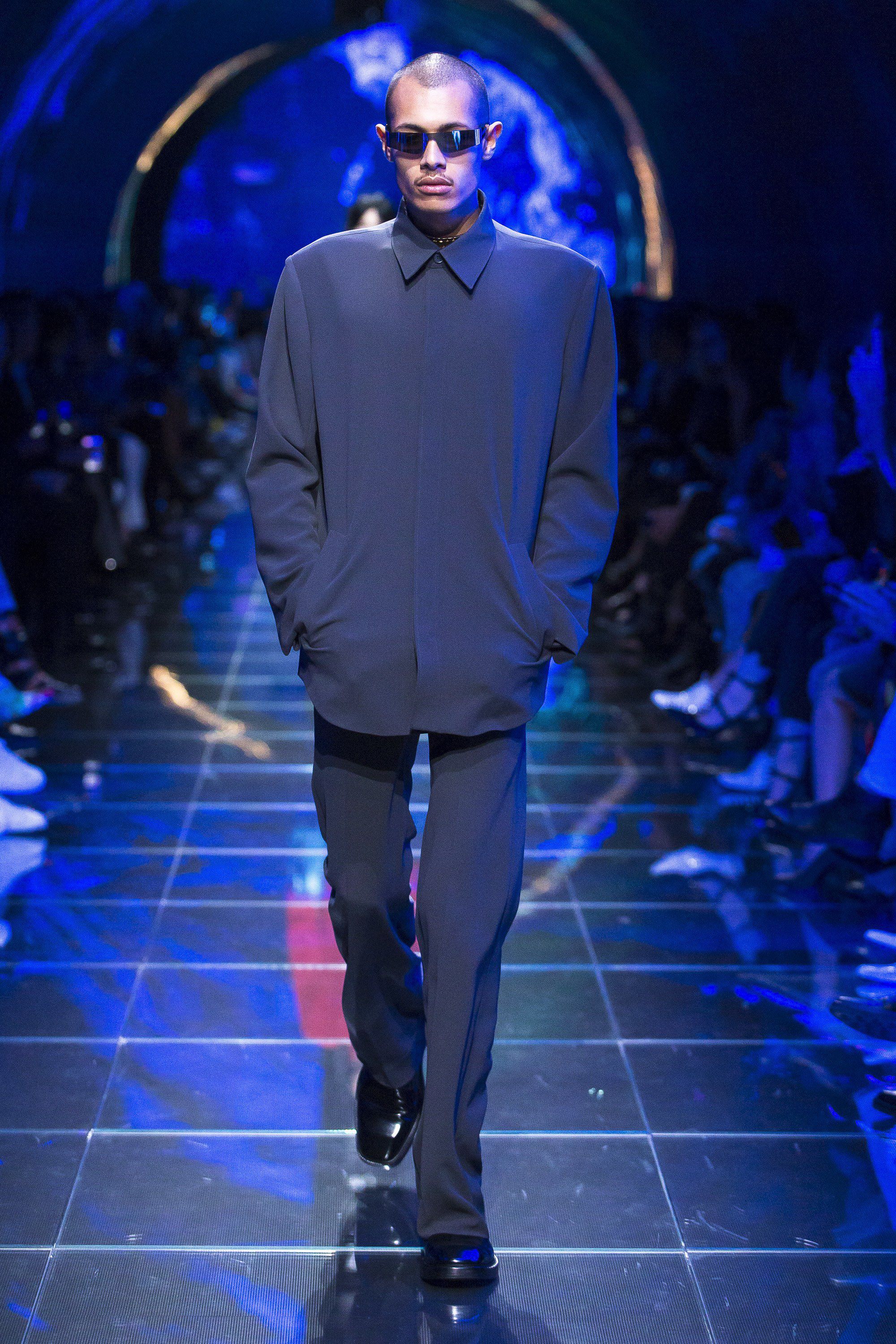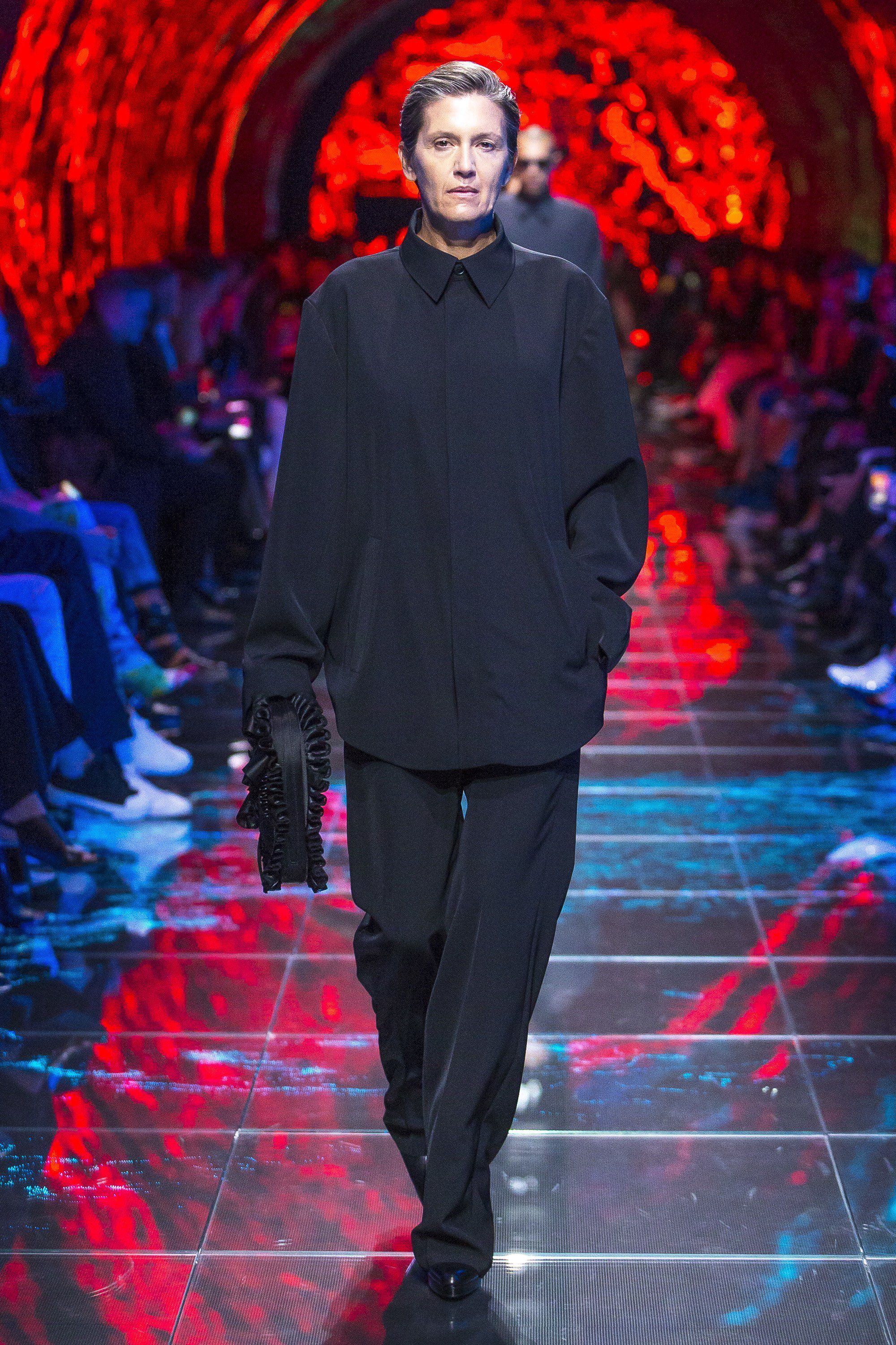A partire dalla location, la sfilata si prospettava molto interessante. La passerella, infatti, era sostanzialmente una installazione artistica creata dal canadese Jon Rafman: i modelli sfilavano in una sorta di tunnel ricoperto di schermi, su cui si alternavano immagini di fuoco, pioggia, spazio, schermate Windows, prima di passare a sfumature più scure. Rafman esplora nel suo lavoro l’impatto che la tecnologia ha sulle nostre vite e sulla società e, a giudicare da queste immagini e dalla colonna sonora dello show, una techno industriale, il risultato sembra parecchio negativo.