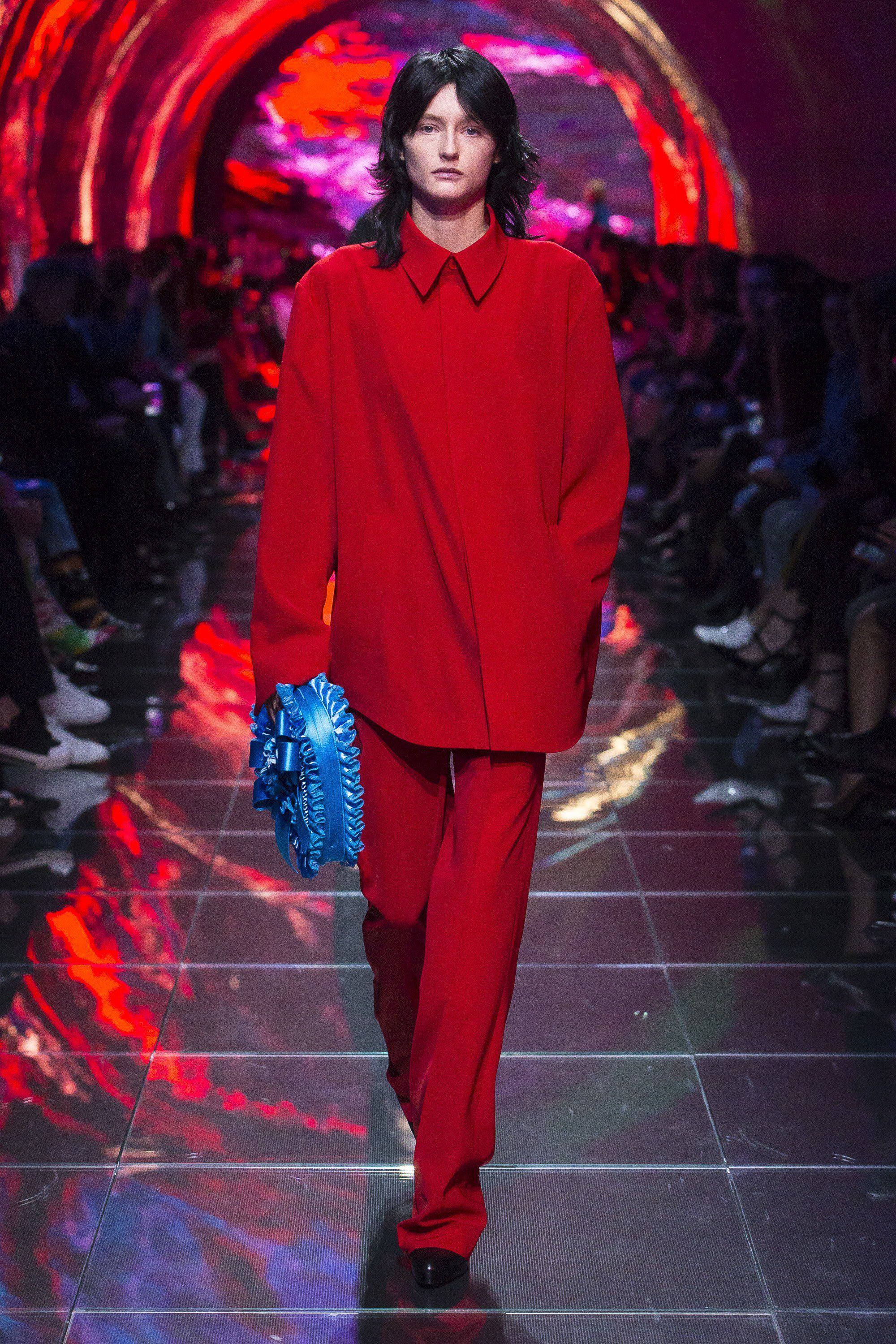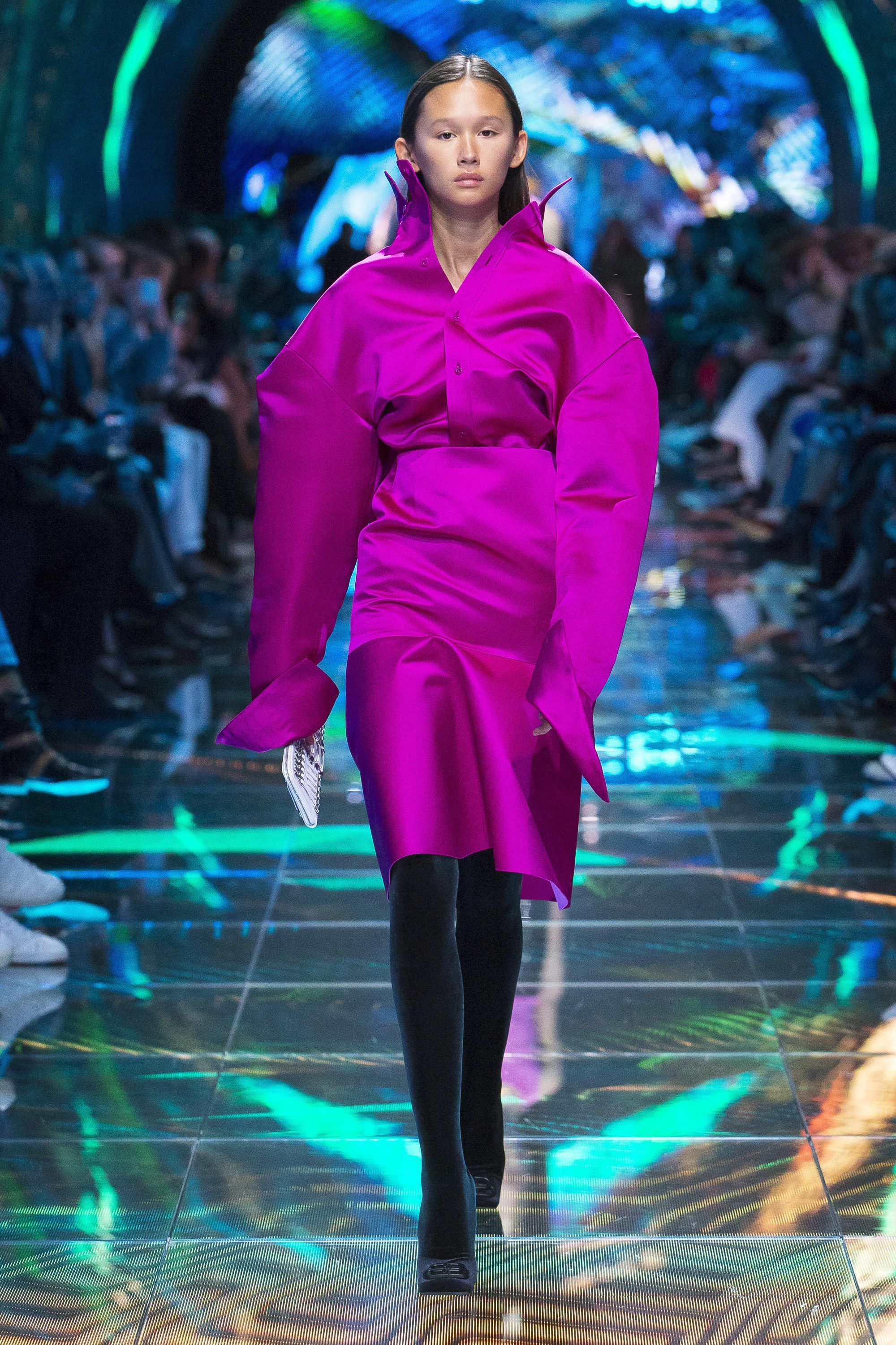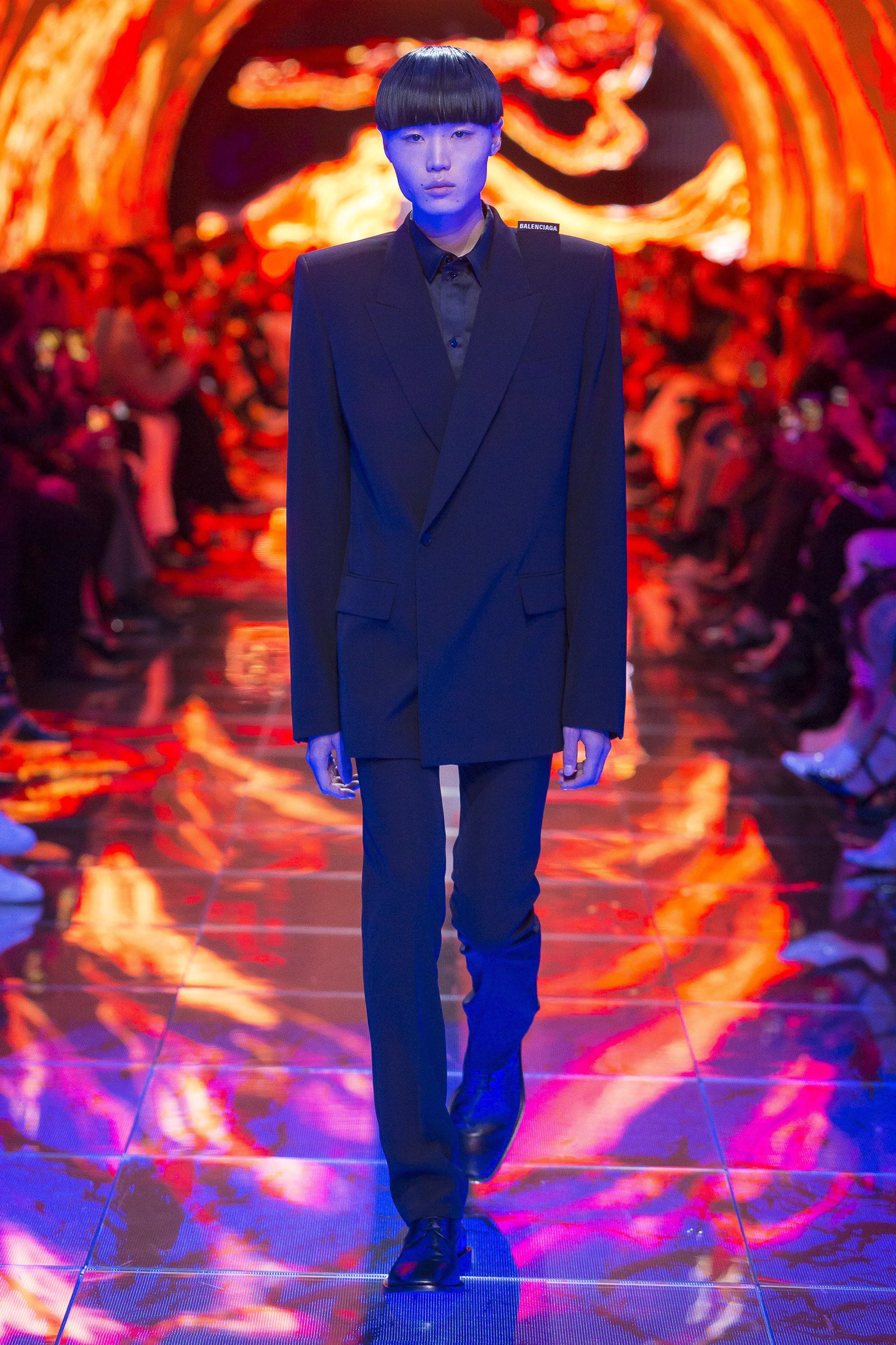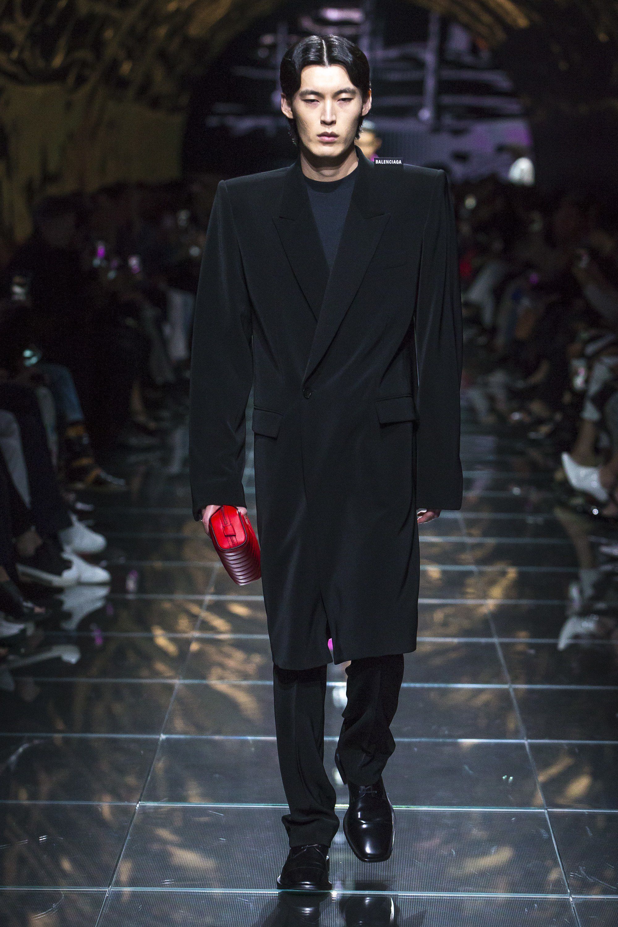 Il neo-tailoring di Demna si è tradotto in silhouette di ispirazione anni 80, con grandi spallone e vita strettissima, rivisitazione della sua C-Line. La sfilata si è aperta con cappotti fino al ginocchio dalle spalle squadrate e appuntite, in tessuti e colori diversi, mentre l’uomo portava blazer “quadrati” abbinati a pantaloni sartoriali, appunto. Successivamente la silhouette si è “ingentilita”, con camicie oversized portate con il colletto aperto e tirato su, portate con gonna con volant. Dopo una rivisitazione del concetto di collo alto, attraverso lunghi abiti aderenti con spacco laterale, miniabiti stampati, ampi abiti che diventano quasi delle mantelle e tute fluide chiuse in vita da un nodo, si è passati alla sezione no-shoulder. La giacca diventa un tutt'uno con la camicia, diventando quasi una divisa da portare con pantaloni abbinati, sia per uomo che per donna in sfumature che vanno dal nero e dal gessato, al rosso e il grigio. Le ultime quattro uscite, infine, sarebbero state degne di una sfilata di Haute Couture: Demna rivisita in toto il concetto di lavorazione del tessuto, portando in passerella abiti che sono costituti da lembi di tessuto avvolti intorno al corpo delle modelle, come l’abito rosso realizzato con 4 metri di seta, messi insieme per risultare una camicia e una lunga gonna.