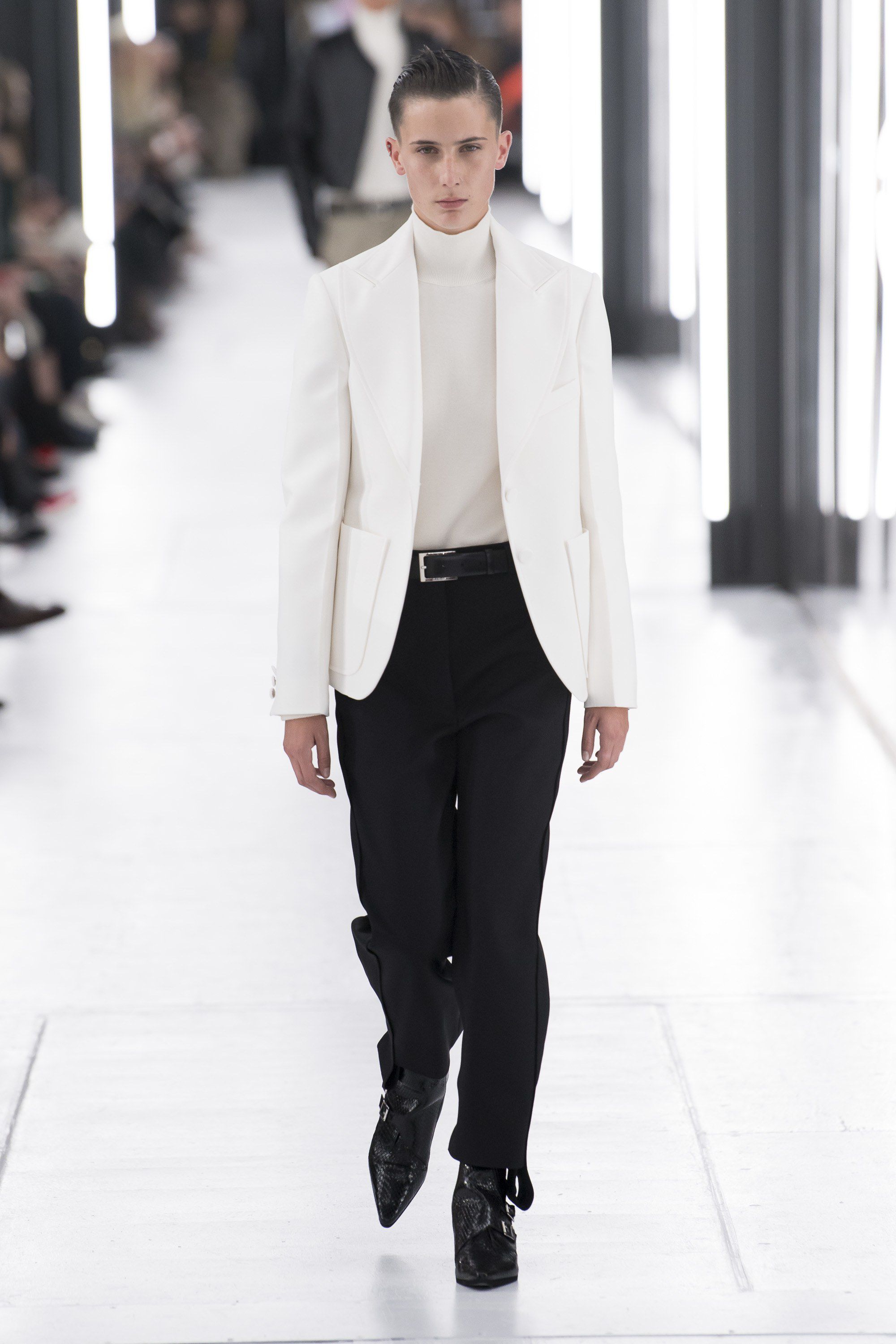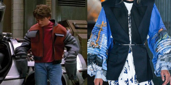 Lo show si è aperto con una giacca che non può non ricordarvi la Self Drying Jacket usata da Marty McFly nel secondo capitolo della saga di Back to the Future: le maniche ampie, tipiche di una tuta spaziale, sono lavorate in modo da risultare molto leggere, e diventano un tema ricorrente all’interno della collezione.