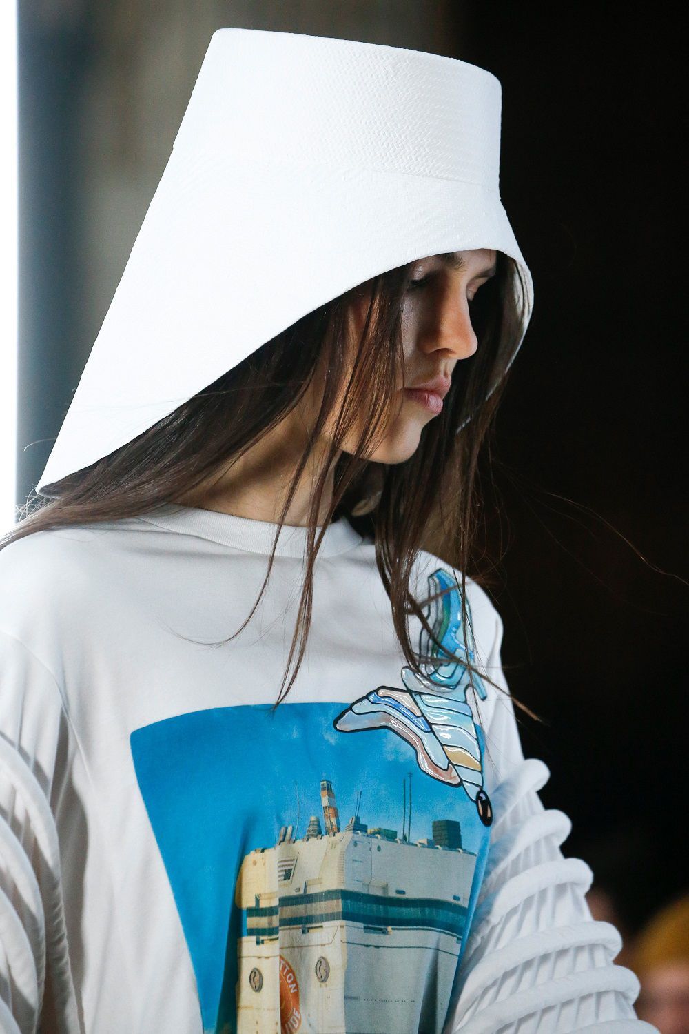 Ma sono soprattutto i copricapi ad aver colpito maggiormente, specialmente i fan di The Handmaid’s Tale. Piatti, che scendono ad incorniciare il volto per poi allungarsi sul collo (quasi come quelli da safari), ma rigidi, una sorta di rivisitazione delle cuffie indossate da Offred e socie.