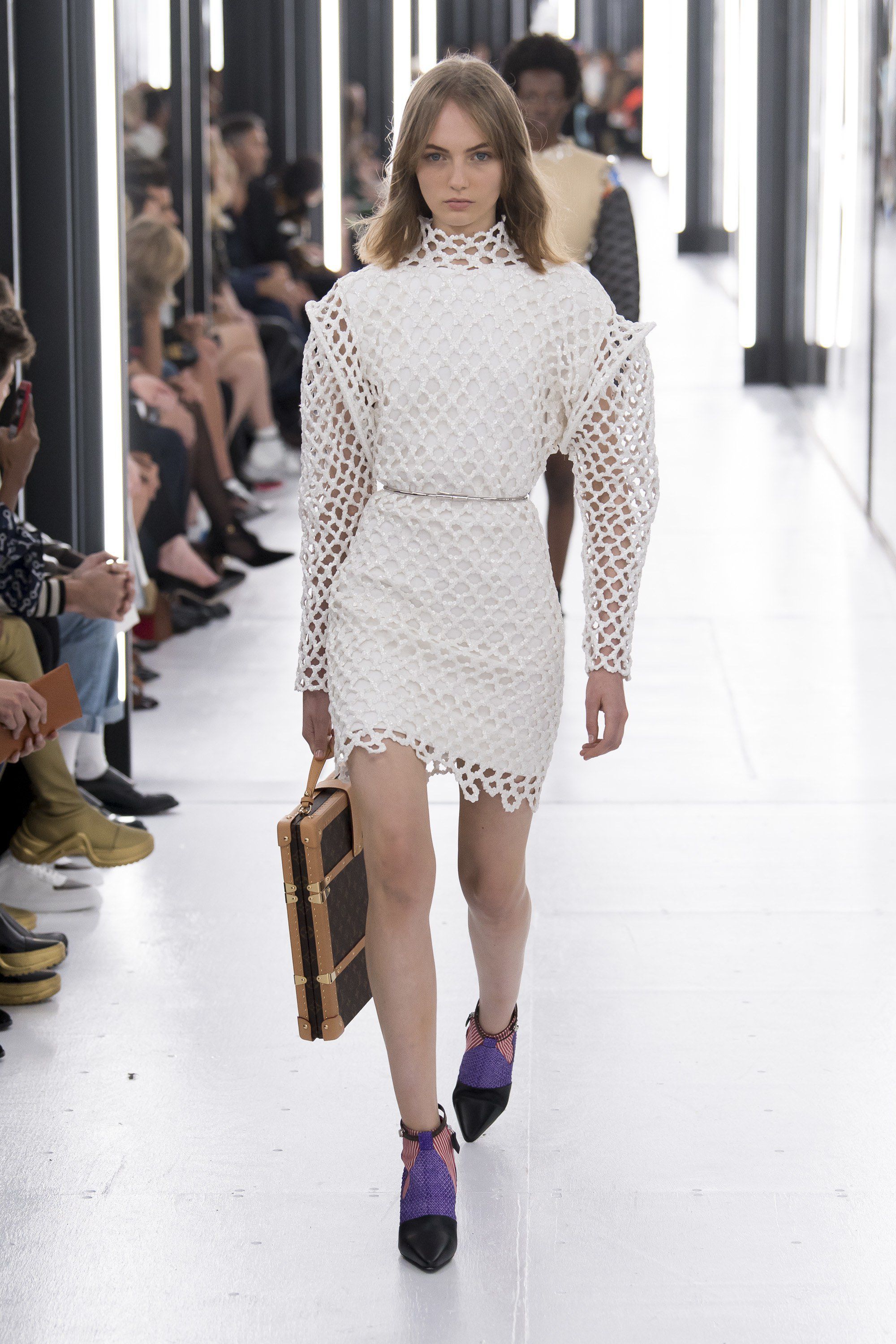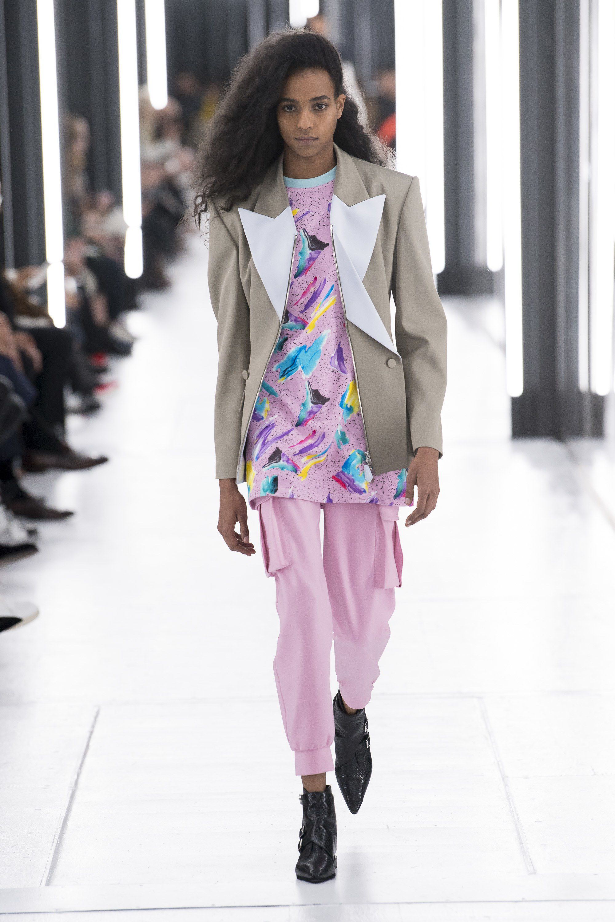 Le grafiche dai colori pastello accesi decoravano mini abiti (le lunghezze di gonne e pantaloni superavano raramente il ginocchio), shorts ultra femminili, T-shirt lunghe abbinate a cargo pants rosa, abiti monospalla e asimettrici. Non sono mancati i capi più sartoriali, vero marchio di fabbrica di Louis Vuitton, come blazer dalla spalle accentuate (80s vibes di nuovo), pantaloni gessati, e dolcevita bianchi portati sotto a candide giacche. Ghesquière ha giocato molto sul tema del gender-fluid, portando in passerella modelle androgine e molto esili, che indossavano abiti appartenenti al guardaroba maschile. Dopo un paio di cappotti dalle spalle arrotondate in pelle, è arrivato il turno di veri e propri abiti scultura, con strutture che ricordavano quasi una gabbia ultra moderna, all’apparenza molto comoda.