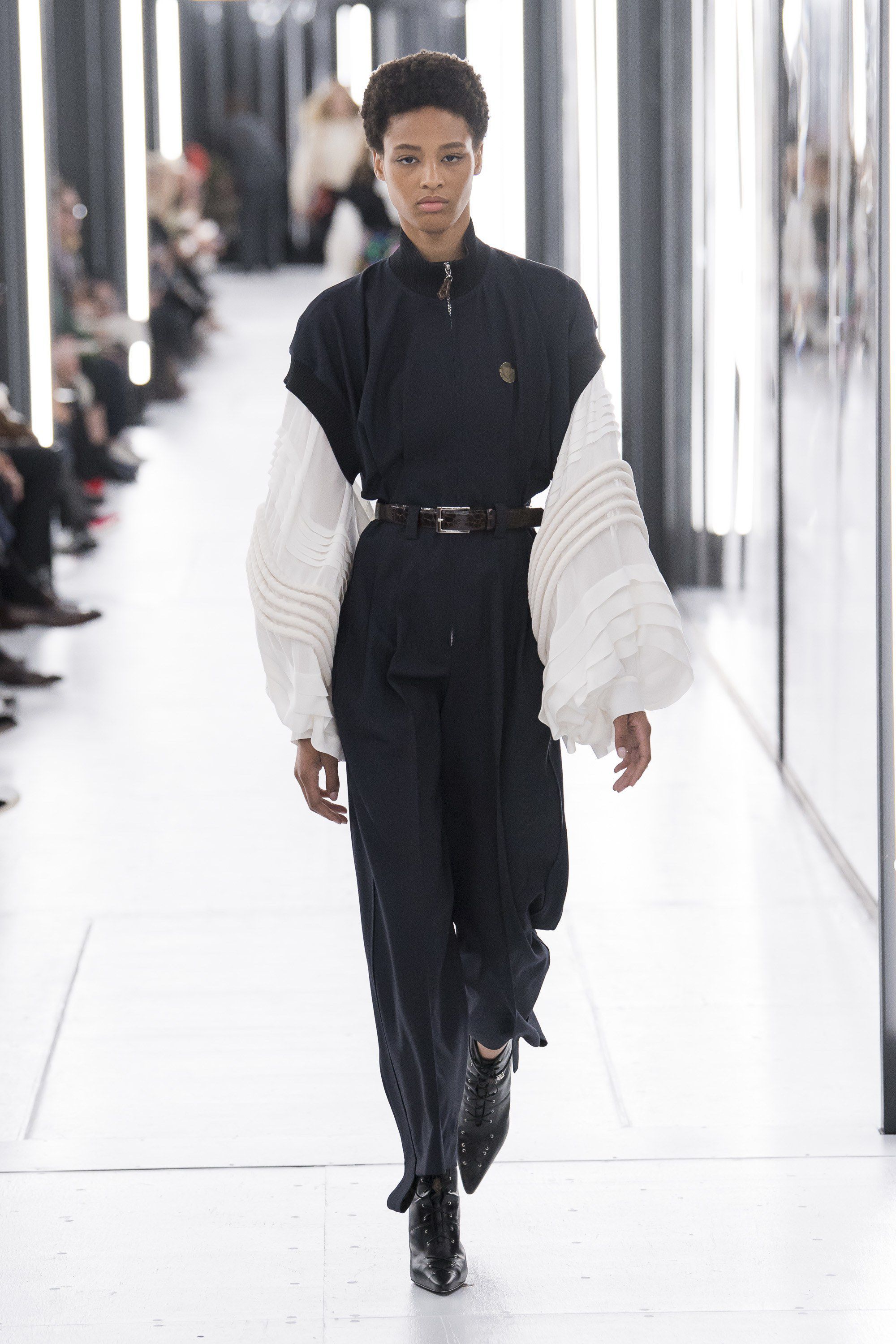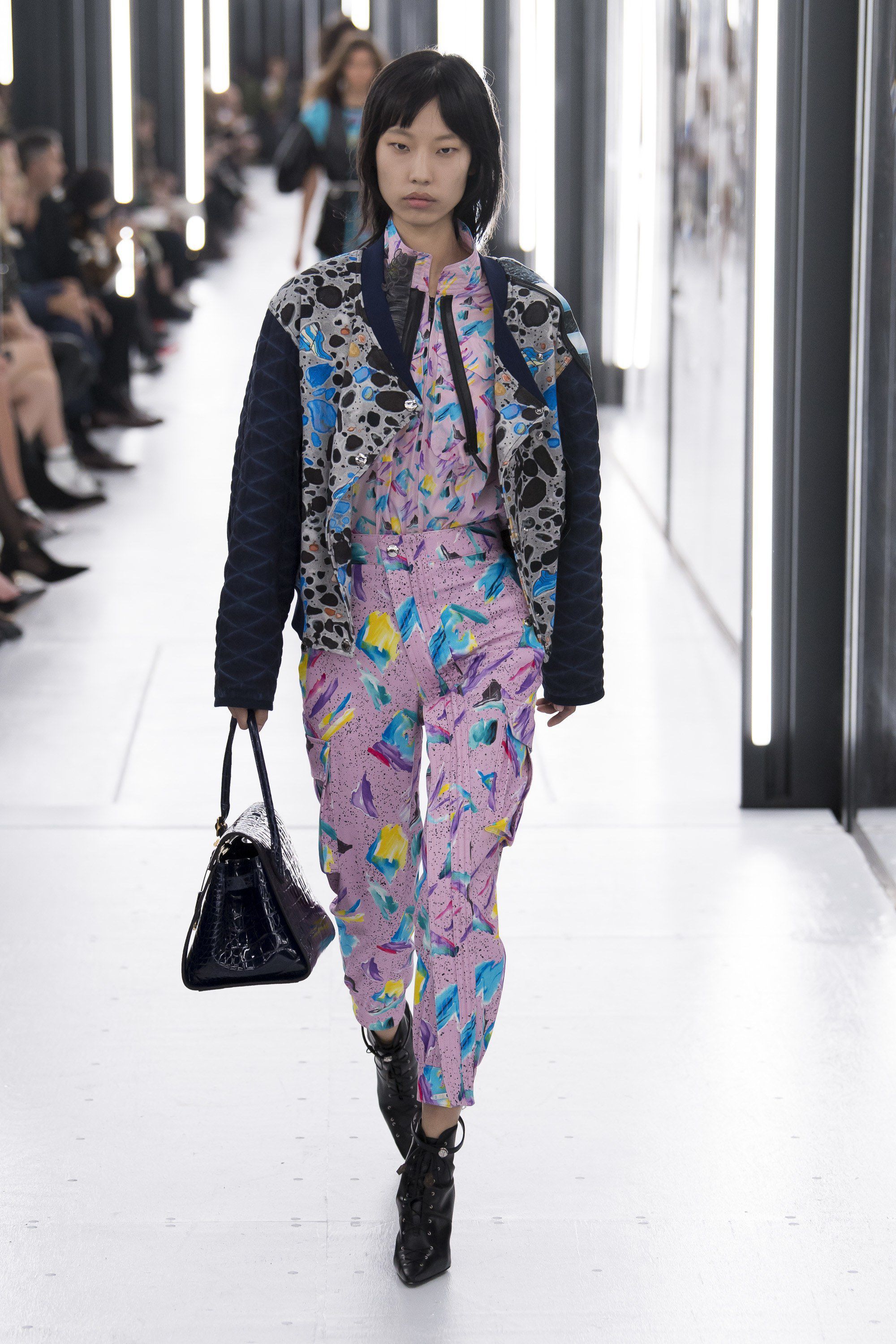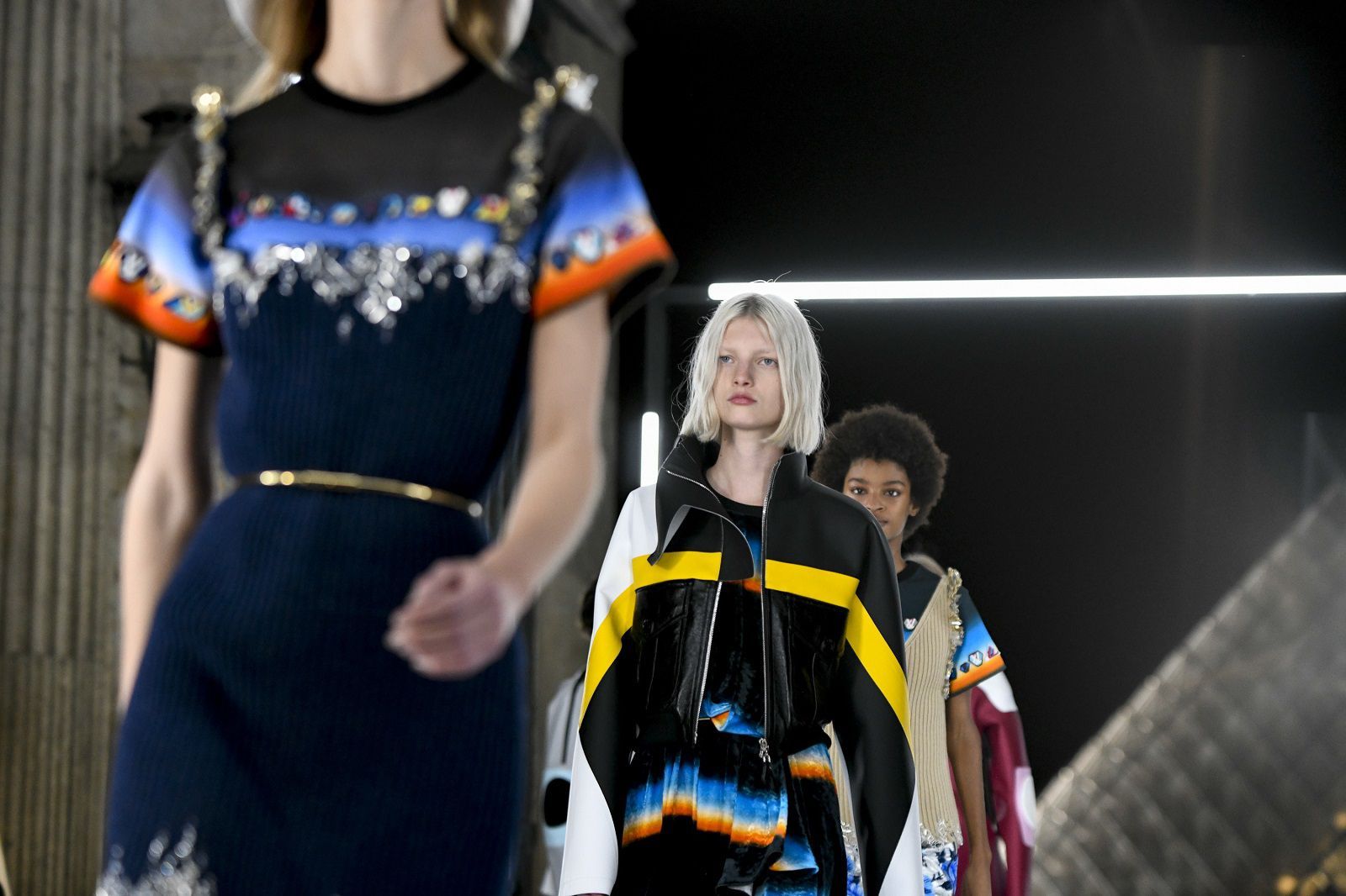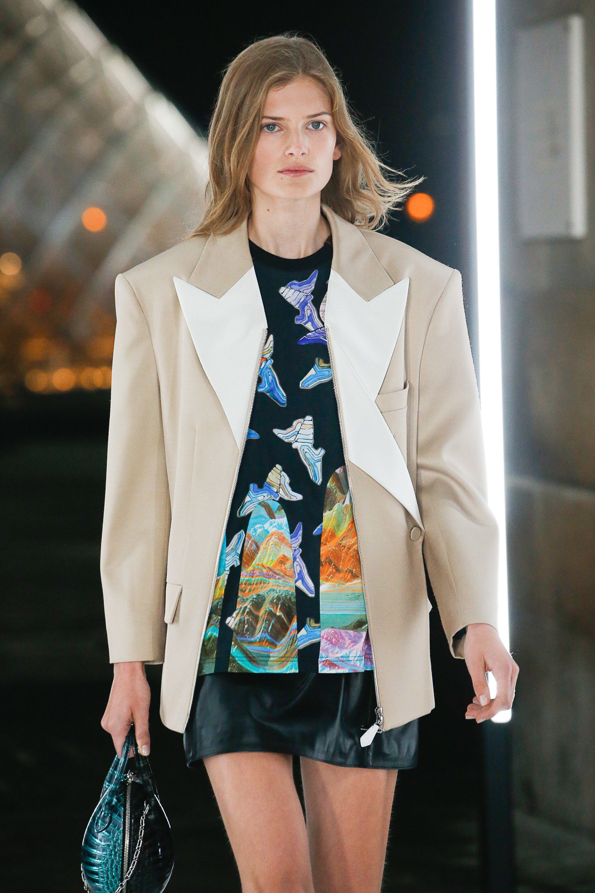 Come per Demna da Balenciaga, questa stagione il tema del futuro sembra essere molto caro ai designer. Ghesquière ha raccontato che per questa collezione ha voluto esplorare il rapporto tra la realtà virtuale che viviamo tutti i giorni sui social media e la vita reale. Questo contrasto è stato declinato attraverso silhouette di ispirazione anni Ottanta abbinate a capi in plastica modellata, maniche da tuta spaziale, stampe del Memphis Group, il tutto nella cornice quasi anacronistica del Louvre, in versione futuristica.
