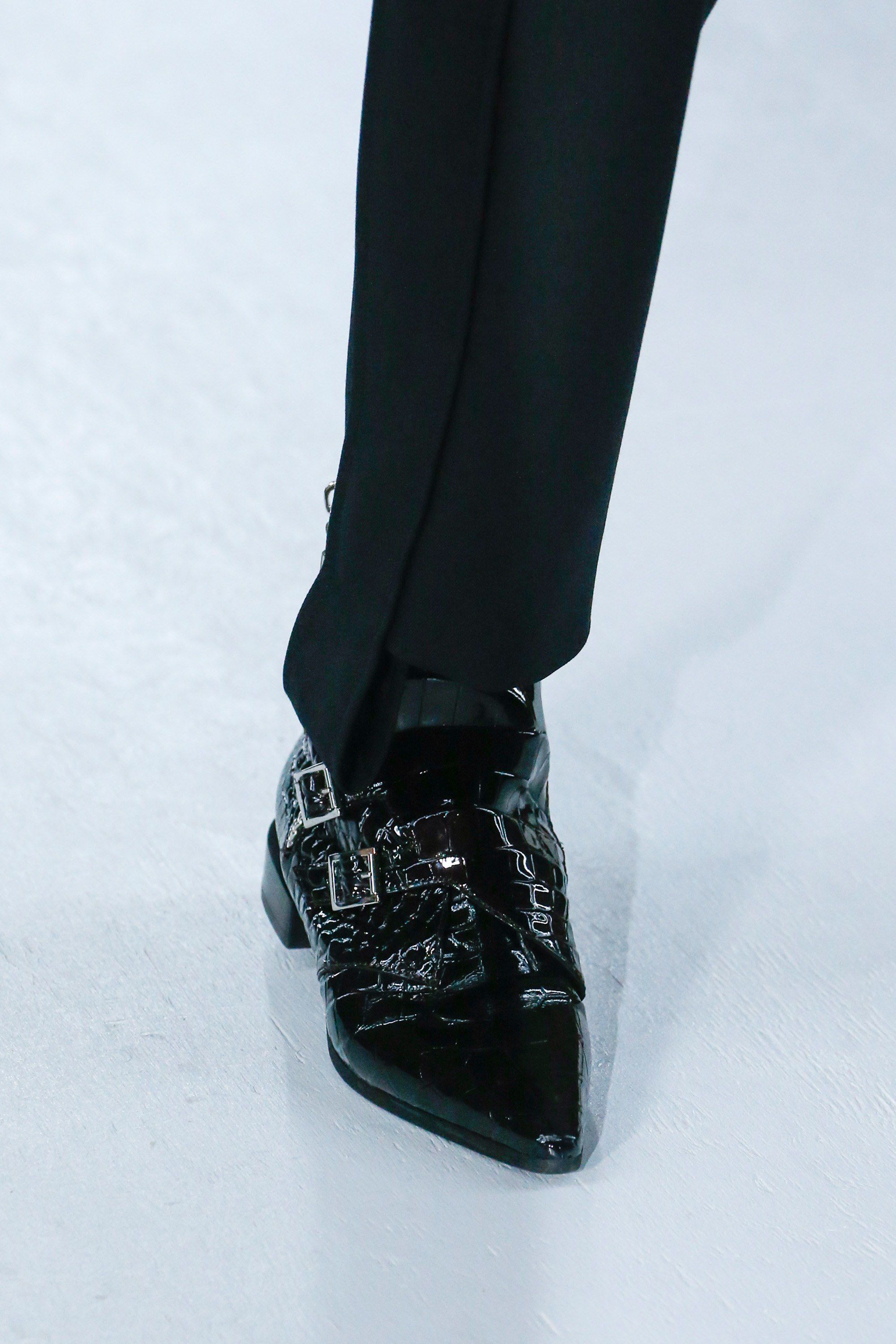 Una menzione particolare la meritano senza dubbio agli accessori. Stivaletti a punta in coccodrillo o rettile con fibbie laterali o stringati, cinture che sembravano quasi un filo di acciaio ad illuminare e spezzare la silhouette, borse rotonde ispirate alla forma delle capsule spaziali, sempre nelle pelle più pregiate, mini borse a forma di uovo con stampa monogramm all-over.