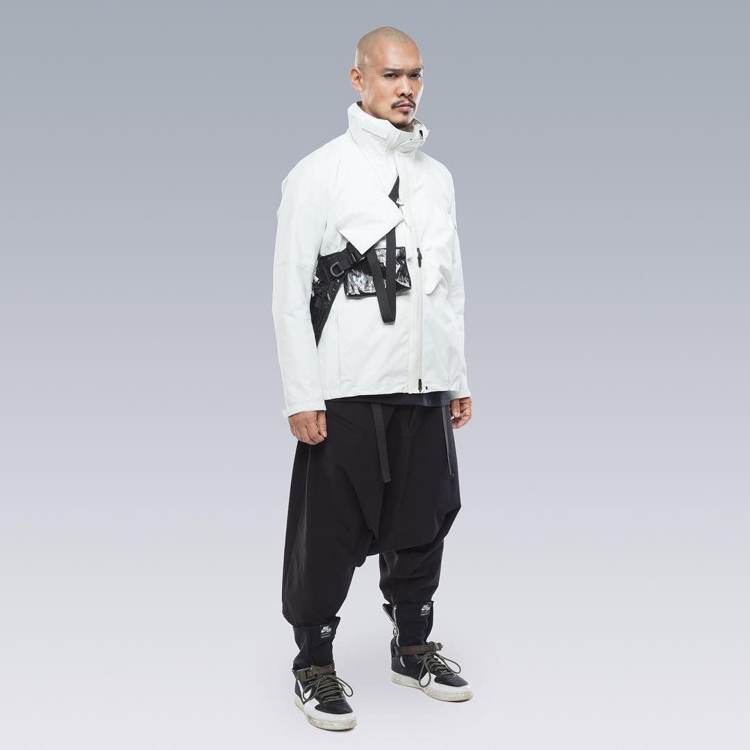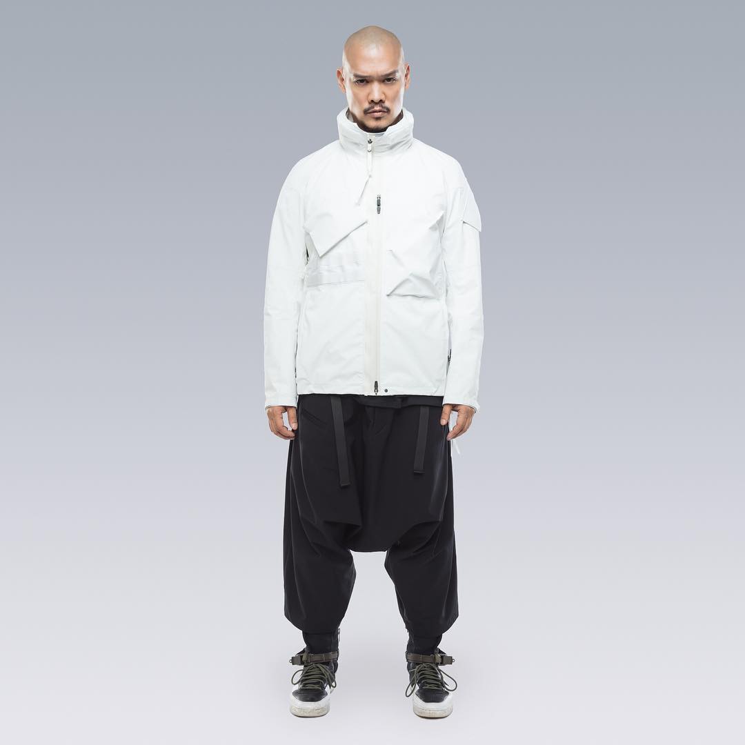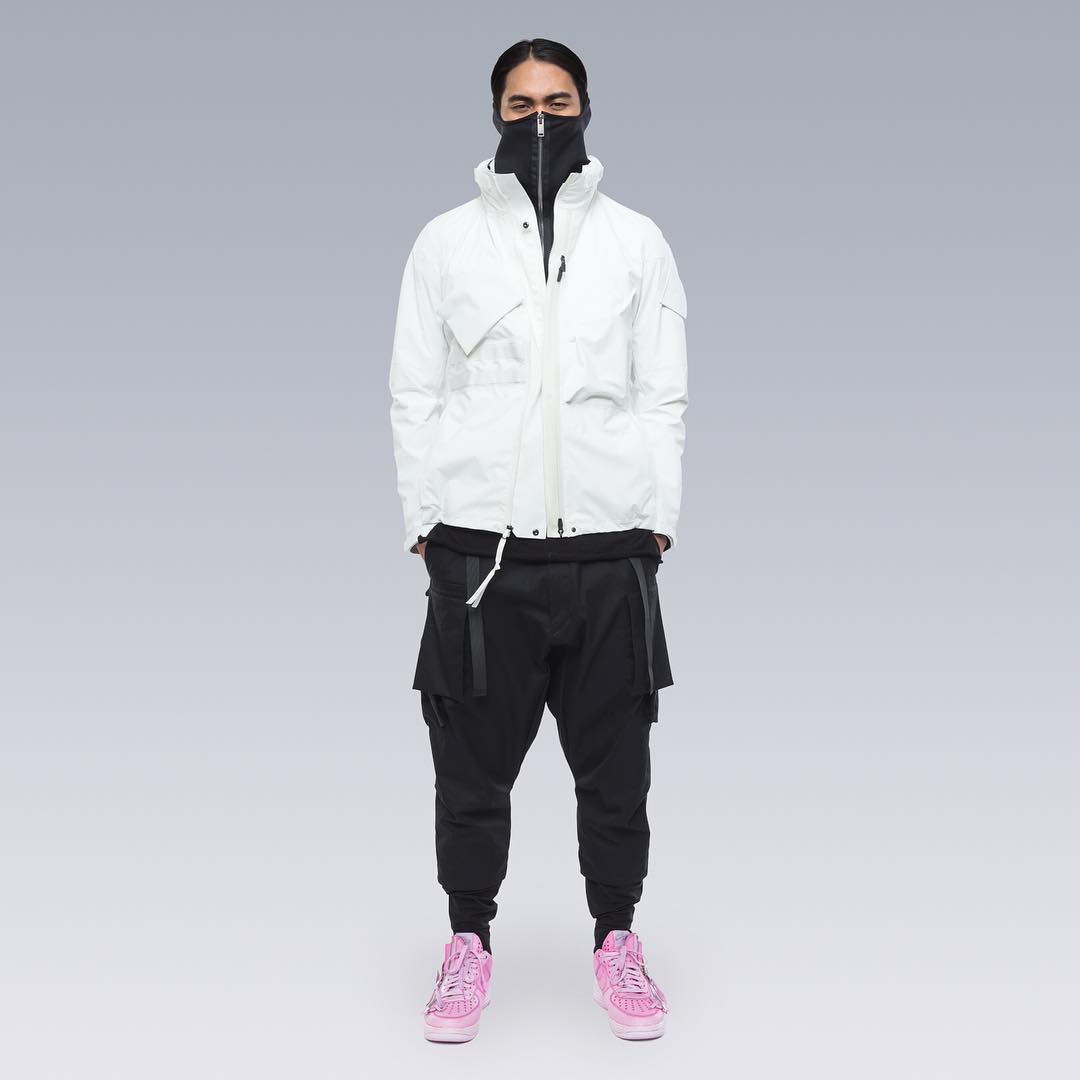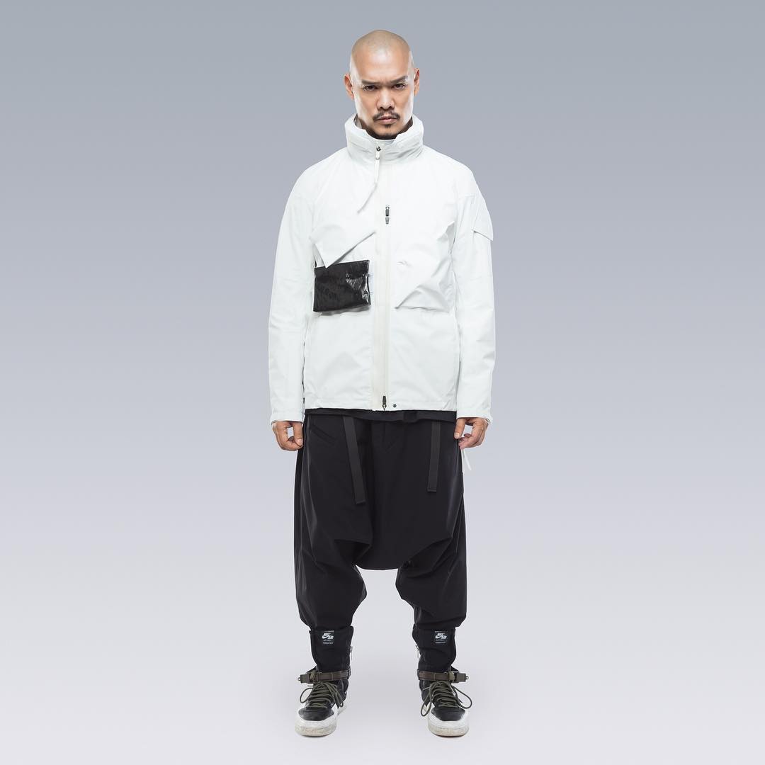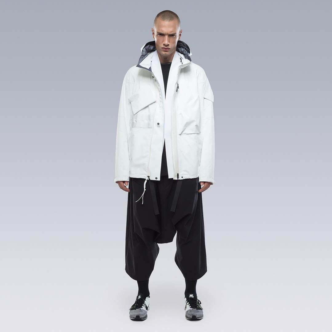 Nel mondo dell'abbigliamento tecnico, il brand ACRONYM® non ha praticamente rivali. L'attenzione per i dettagli e per la qualità, così importanti per il direttore creativo Errolson Hugh, non hanno eguali. Hugh è diventato famoso anche per i suoi drop annunciati sempre all'ultimo minuto, come quello di oggi, probabilmente l'ultimo della collezione FW. Il drop di oggi comprende diversi item di colore bianco, una colorazione che non veniva utilizzata dalla prima collezione del brand, e che Hugh aveva riscoperto per la collaborazione ACRONYM® x Nemen (con sprazzi di rosso per le felpe), e nei capi disegnati per la linea ACG di Nike. Nonostante non ci siano state conferme ufficiali, possiamo annunciarvi che alcune delle giacche e dei look della nuova collezione sono stati realizzati nel nuovo tessuto GORE-TEX INFINIUM™, un materiale più morbido e flessibile rispetto a quelli utilizzati abitualmente, ma che offre comunque una protezione completa da tutti gli agenti atmosferici. Gli osservatori più attenti avranno potuto notare che nel lookbook si intravede una nuova colorazione della sneaker ACRONYM® Nike Presto, mai vista prima, in grigio e argento, probabilmente la prossima colorway che verrà lanciata.