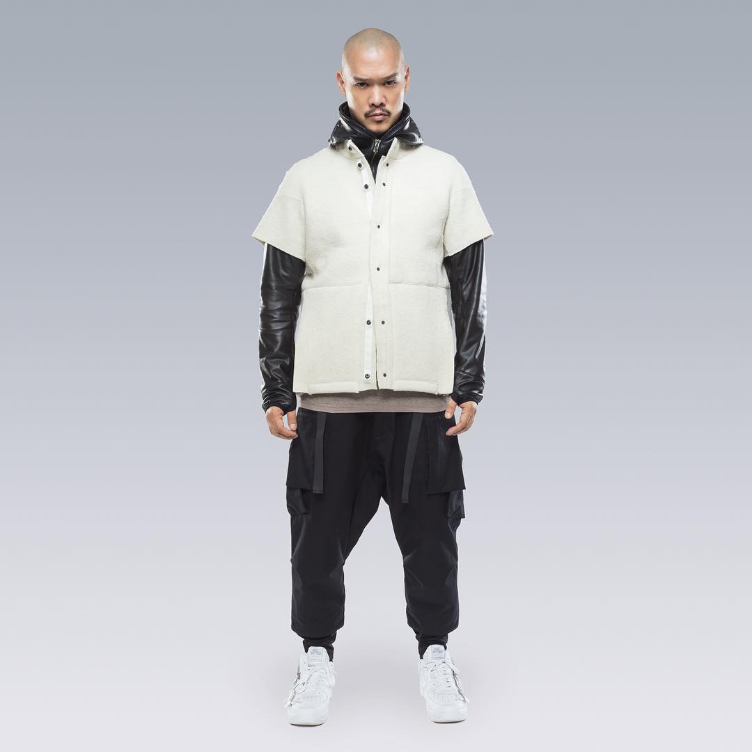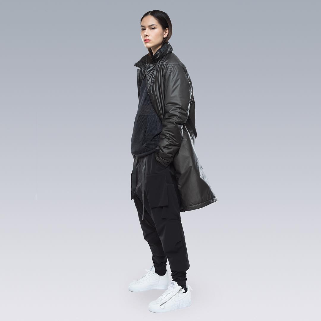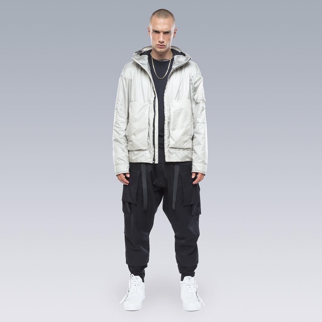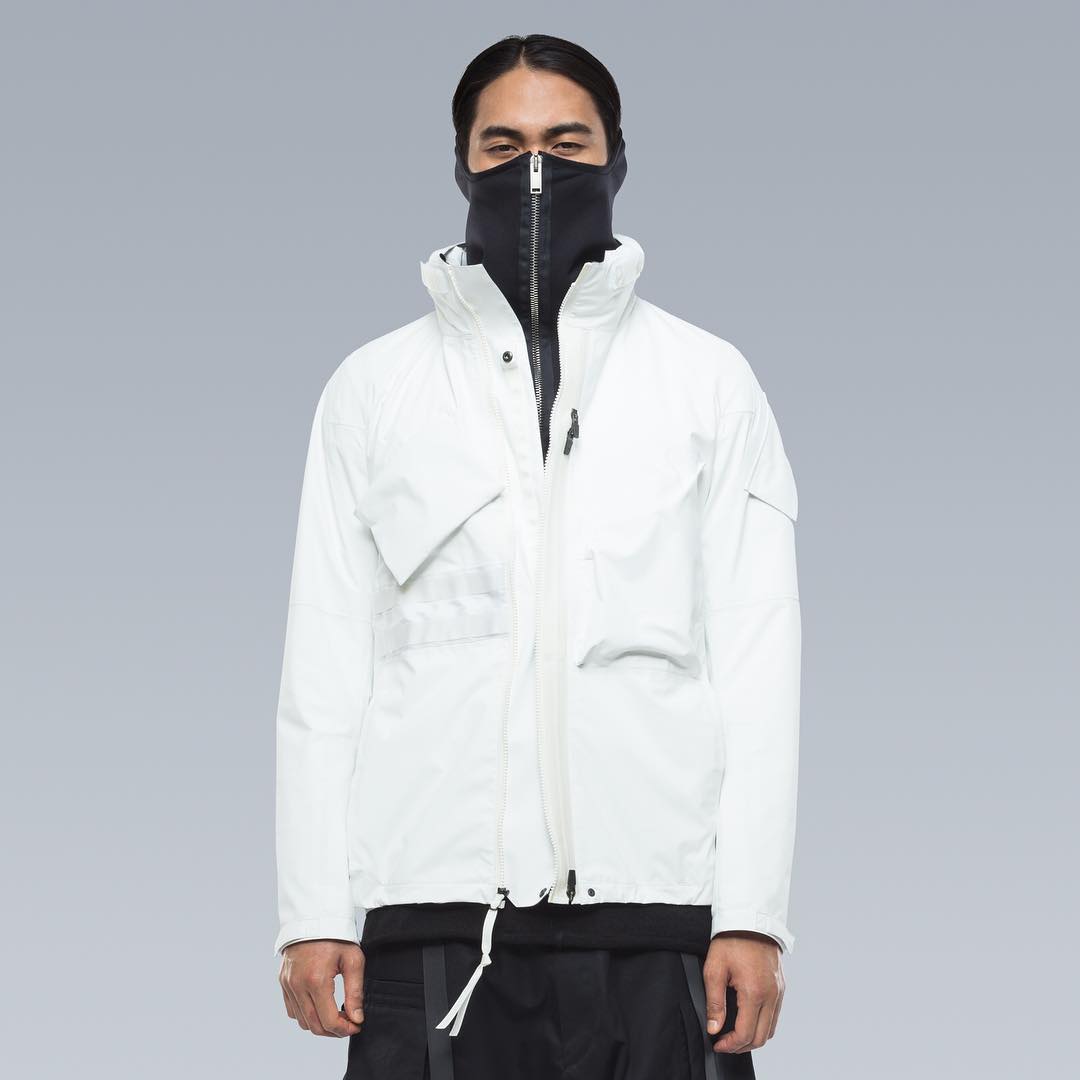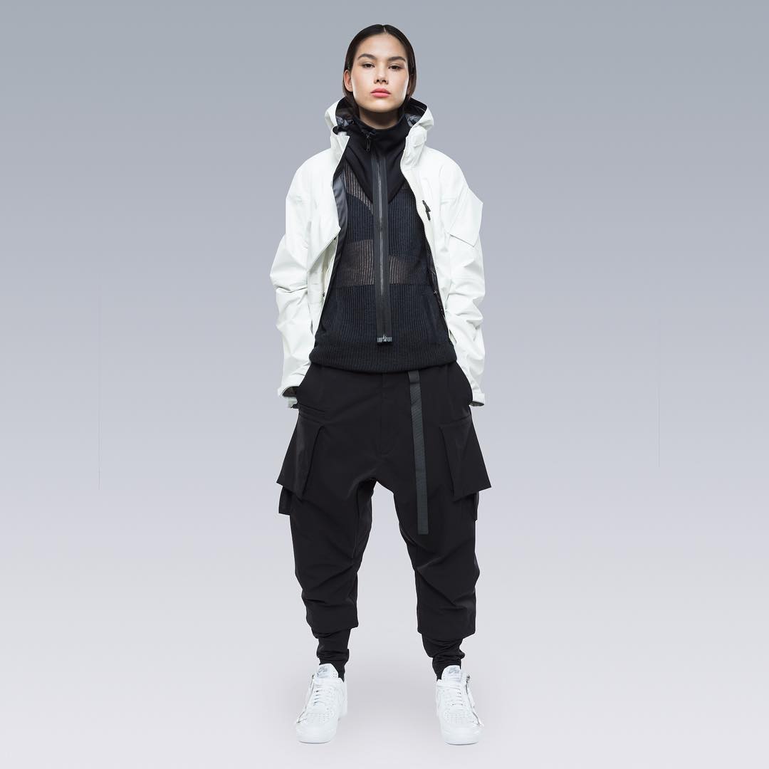 Nel mondo dell'abbigliamento tecnico, il brand ACRONYM® non ha praticamente rivali. L'attenzione per i dettagli e per la qualità, così importanti per il direttore creativo Errolson Hugh, non hanno eguali. Hugh è diventato famoso anche per i suoi drop annunciati sempre all'ultimo minuto, come quello di oggi, probabilmente l'ultimo della collezione FW. Il drop di oggi comprende diversi item di colore bianco, una colorazione che non veniva utilizzata dalla prima collezione del brand, e che Hugh aveva riscoperto per la collaborazione ACRONYM® x Nemen (con sprazzi di rosso per le felpe), e nei capi disegnati per la linea ACG di Nike. Nonostante non ci siano state conferme ufficiali, possiamo annunciarvi che alcune delle giacche e dei look della nuova collezione sono stati realizzati nel nuovo tessuto GORE-TEX INFINIUM™, un materiale più morbido e flessibile rispetto a quelli utilizzati abitualmente, ma che offre comunque una protezione completa da tutti gli agenti atmosferici. Gli osservatori più attenti avranno potuto notare che nel lookbook si intravede una nuova colorazione della sneaker ACRONYM® Nike Presto, mai vista prima, in grigio e argento, probabilmente la prossima colorway che verrà lanciata.