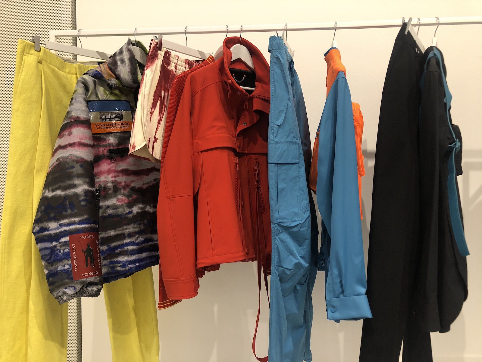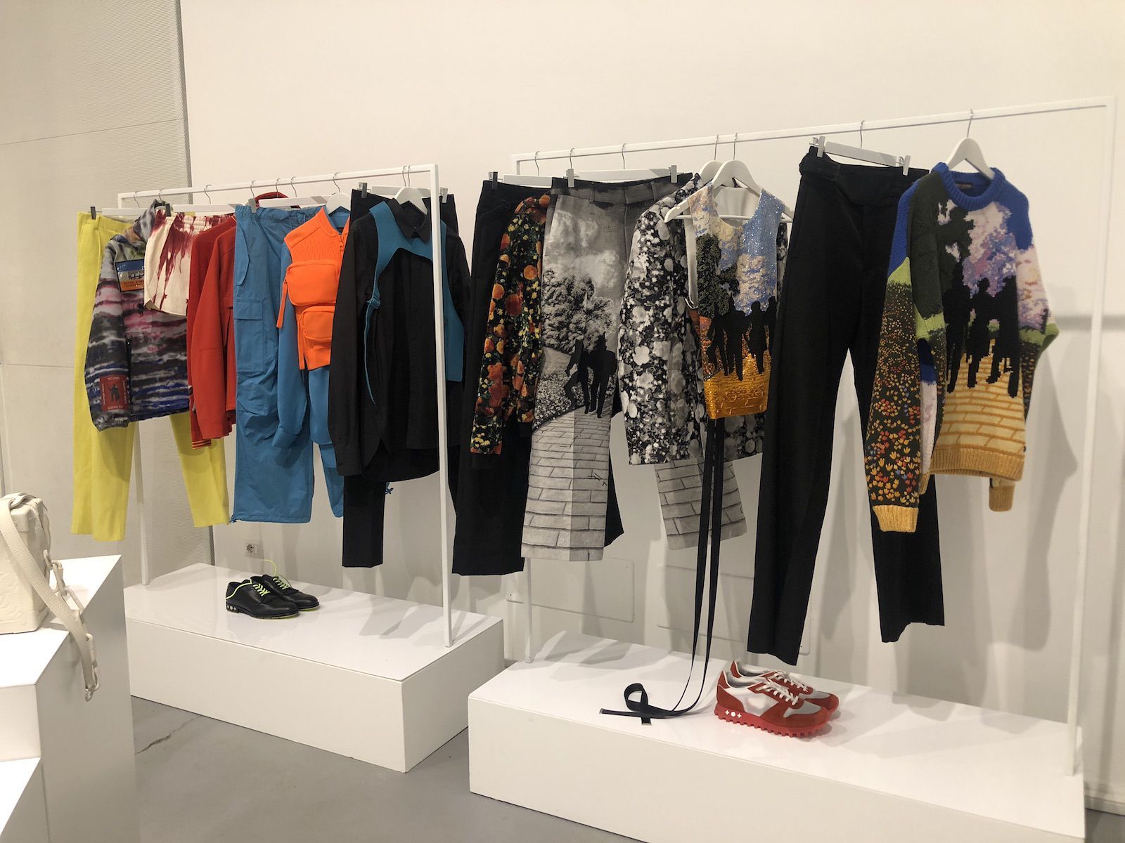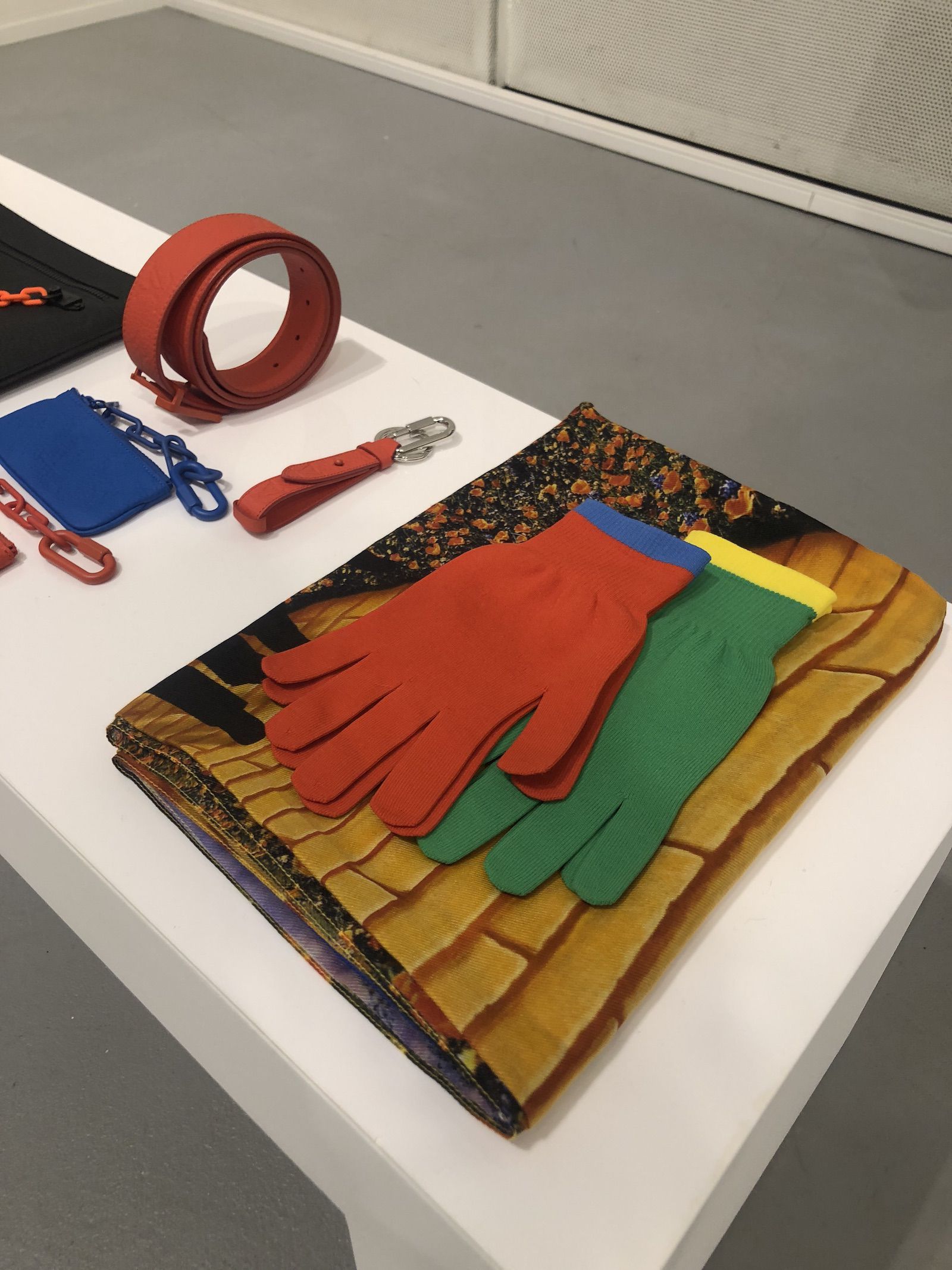 Nonostante non ci fosse l'intera collezione, abbiamo poi avuto modo di vedere le creazioni di Virgil. La stanza è stata divisa in tre sezioni diverse, da una parte i pezzi monocromatici in sfumature pastello, bianco, beige e verde chiaro, dall'altra i pezzi più iridescenti e colorati, e al centro gli accessori.
