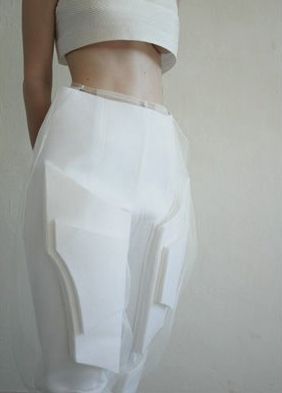 È un’eterna partita a due con l’osservatore, che si ritrova ad affrontare “oggetti” che è difficile definire propriamente gonne, pantaloni o abiti, dato che a una prima e distratta occhiata sembrano tutto fuorché quello. Esperimenti di design, piuttosto. Azzardi frutto di un estro fantasioso ed instancabile, magari.