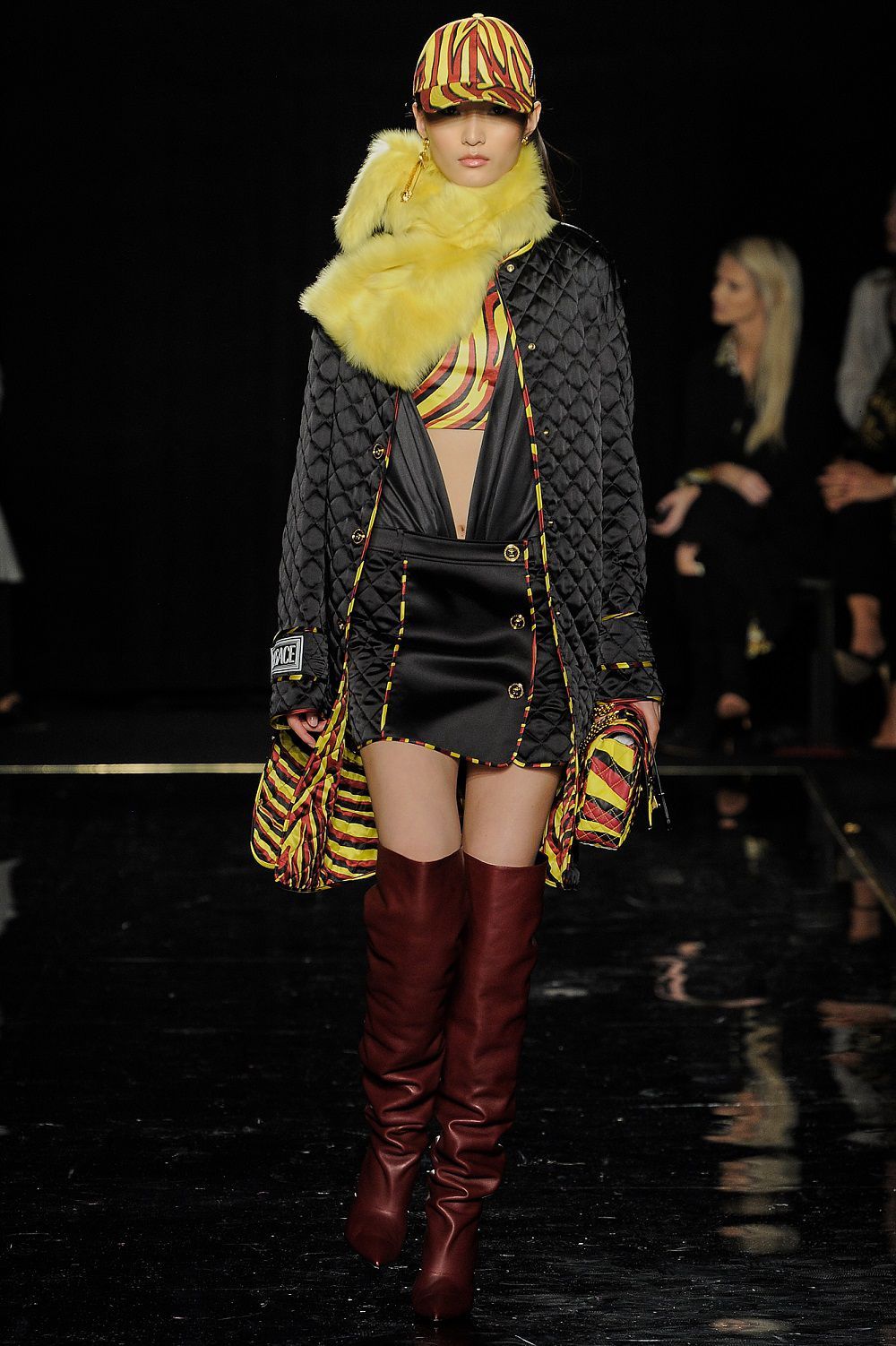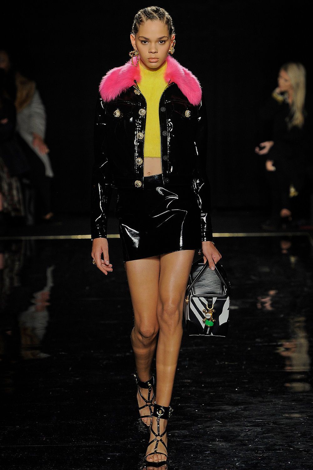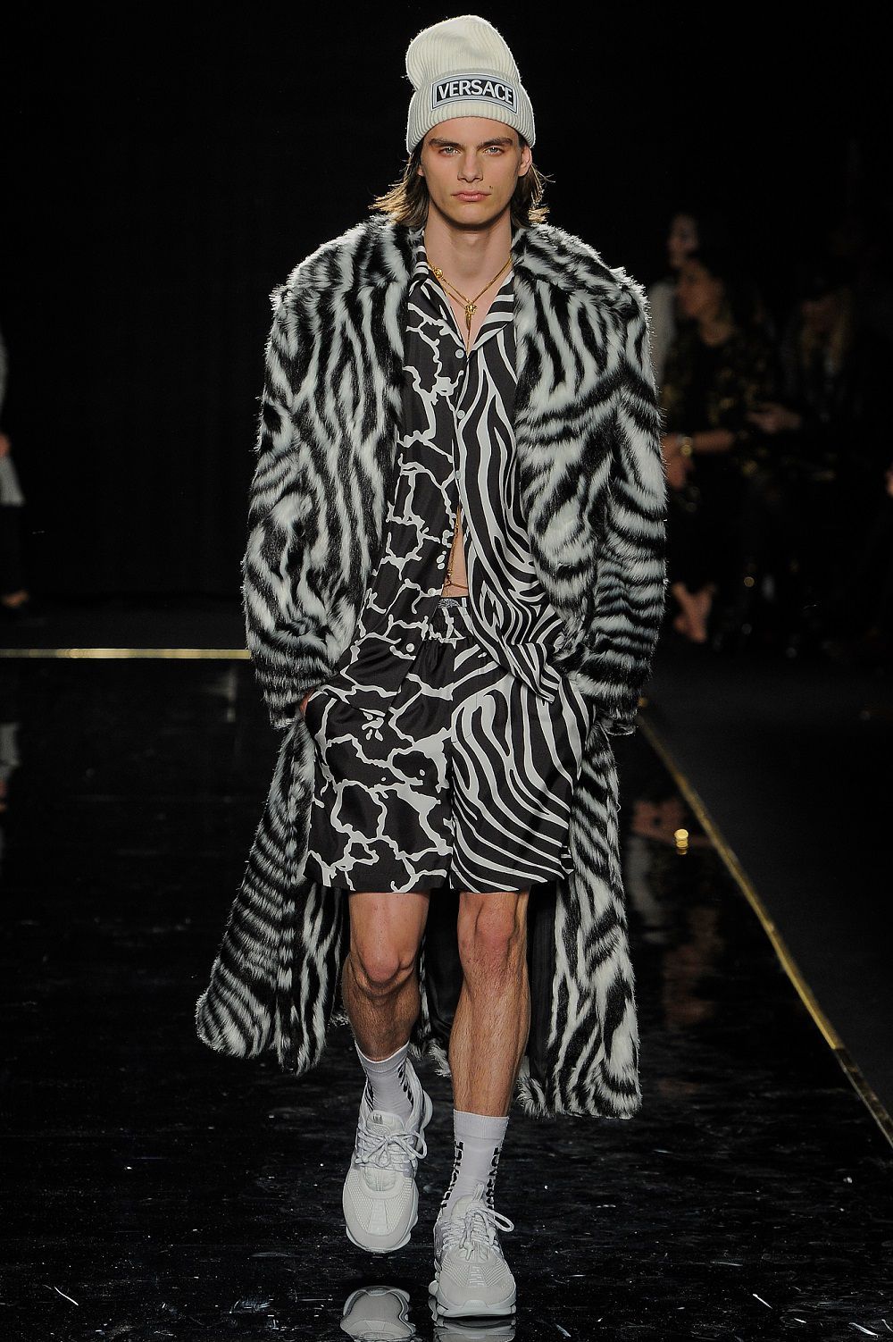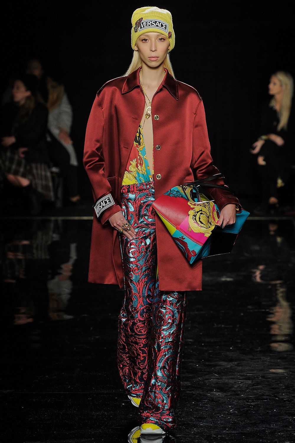 Arriva la novità della eco pelliccia per la prima stagione cruelty-free e, insieme ad essa, tornano la pelle e il vinile, i micropull e gli altri elementi estetici che hanno contraddistinto lo stile barocco e rock dell’azienda, primi fra tutti i mix di stampe, come il motivo greco, arricchiti questa volta dall’animalier (la stampa barocco vanity diventa voyage barocco). Guardare al passato per disegnare il futuro. È questa la nuova filosofia di Donatella Versace che, dopo l’acclamata collezione FW17 con il ritorno delle super top, continua ad attingere a piene mani dall’archivio della maison.