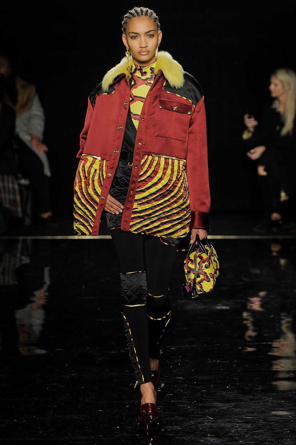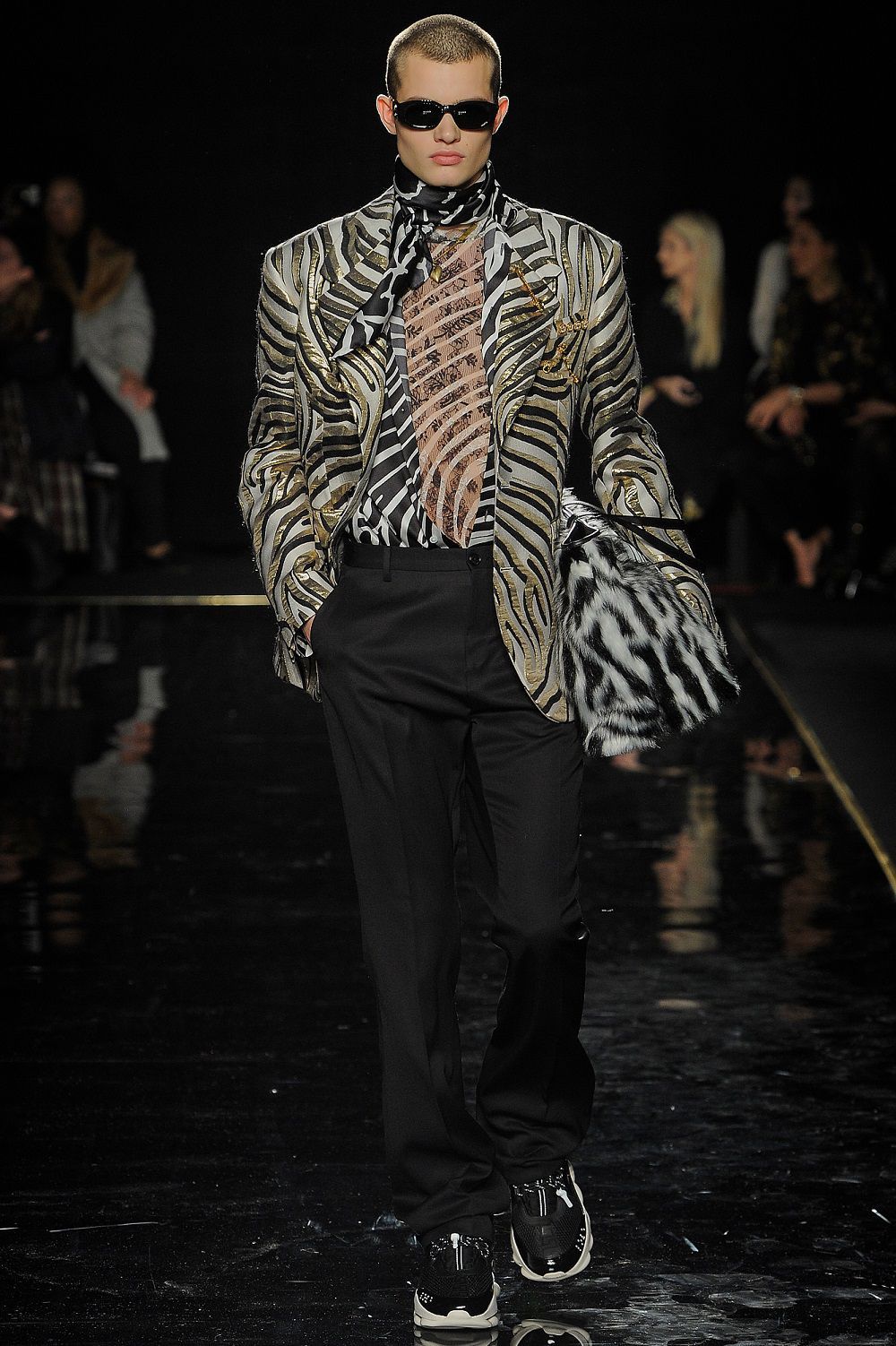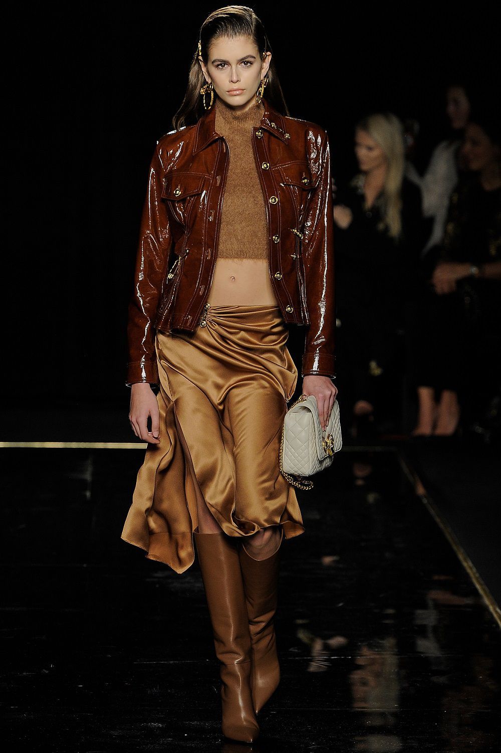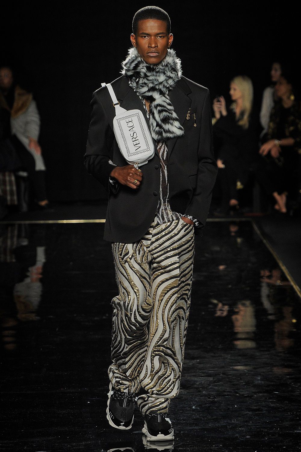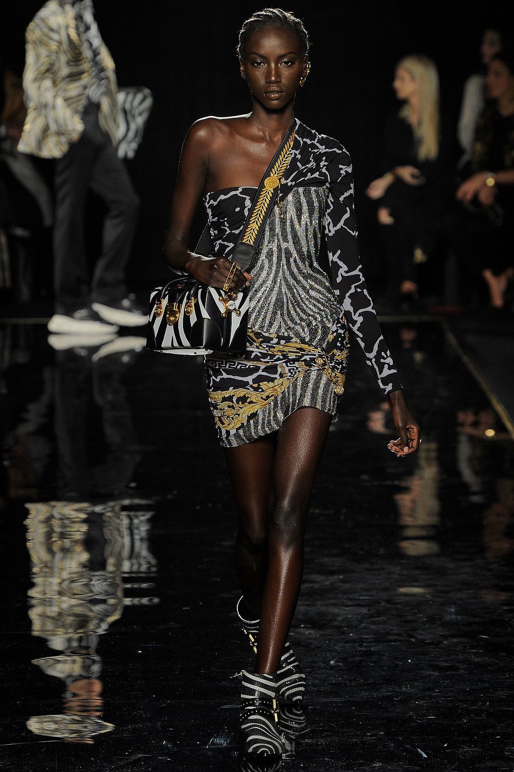 Arriva la novità della eco pelliccia per la prima stagione cruelty-free e, insieme ad essa, tornano la pelle e il vinile, i micropull e gli altri elementi estetici che hanno contraddistinto lo stile barocco e rock dell’azienda, primi fra tutti i mix di stampe, come il motivo greco, arricchiti questa volta dall’animalier (la stampa barocco vanity diventa voyage barocco). Guardare al passato per disegnare il futuro. È questa la nuova filosofia di Donatella Versace che, dopo l’acclamata collezione FW17 con il ritorno delle super top, continua ad attingere a piene mani dall’archivio della maison.